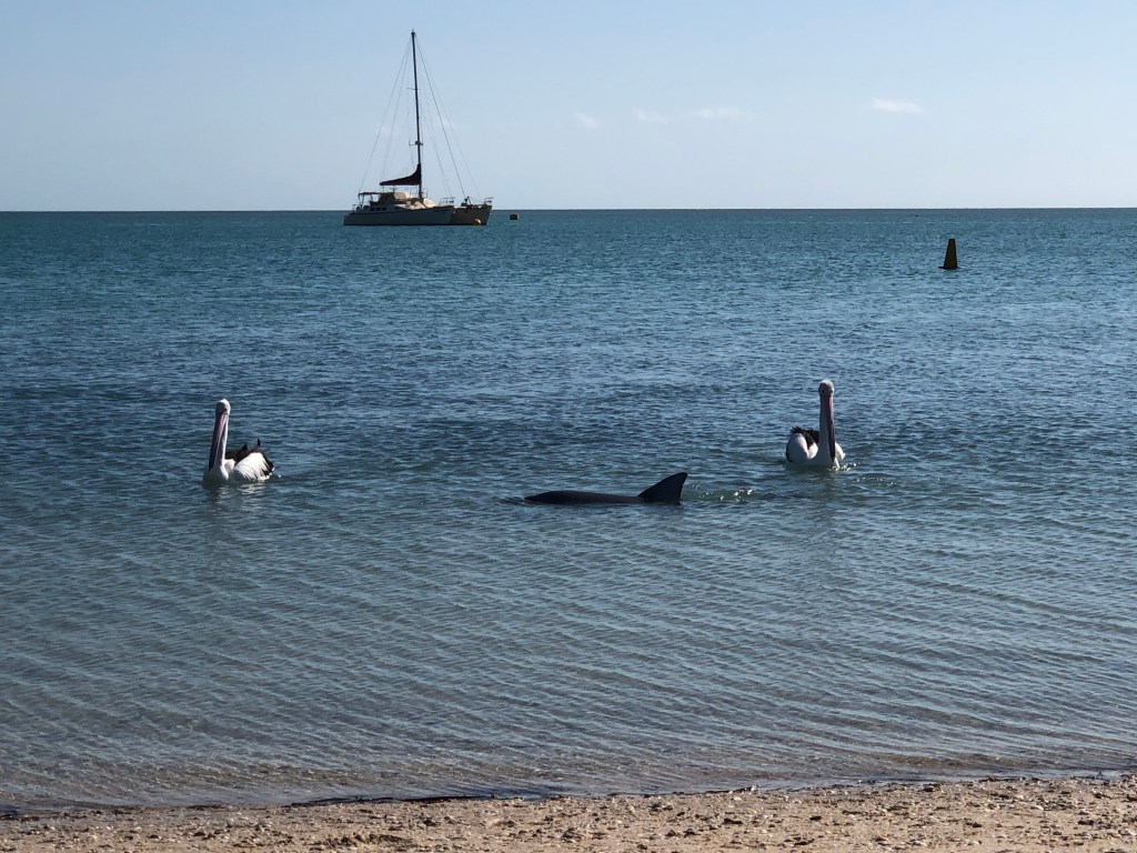 Acordamos cedinho e fomos direto para Monkey Mia. Nessa praia os golfinhos ficam bem no rasinho e tem a Dolphin Experience ($15 por pessoa). As pessoas responsáveis contam mais sobre a preservação e sobre os golfinhos em geral e escolhem umas 2-3 pessoas no meio da multidão (tinha bem mais de 100 pessoas quando fui) para alimentar o golfinho se ele quiser lógico.