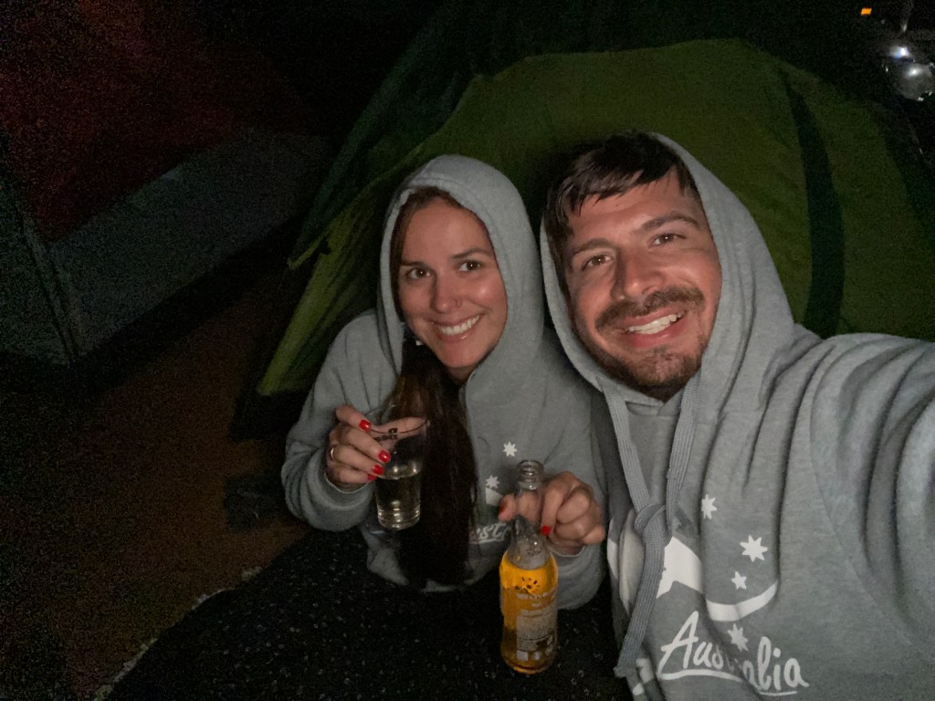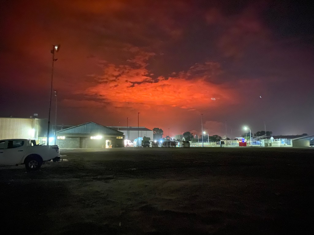 Nosso destino final era Lucky Bay e inclusive já tínhamos reservado camping por lá mas quando paramos para abastecer em Esperance ($55) vimos um fogo e fumaça bem na direção que iríamos. Entrei no site do Emergency WA e vi que o parque nacional que fica Lucky Bay estava infelizmente pegando fogo. Verão é muito seco e as queimadas são frequentes mas essa foi causada por raios na verdade então é sempre bom checar antes de viajar. Ficamos super chateados, já era 9 da noite, comecei a ligar pros campings de Esperance e estavam todos lotados até que um comentou de um espaço que fazem de camping para essa época do ano para suprir a demanda e fomos pro Esperance Overflow ($30 pra 2 pessoas + $5 por pessoa extra).
