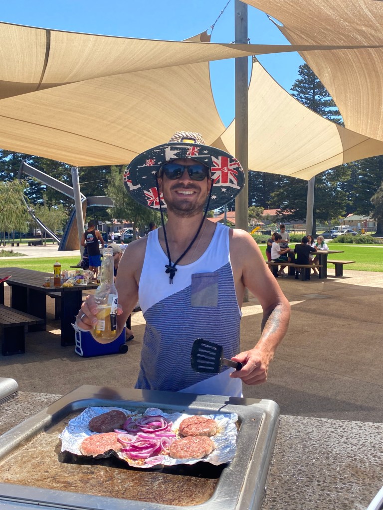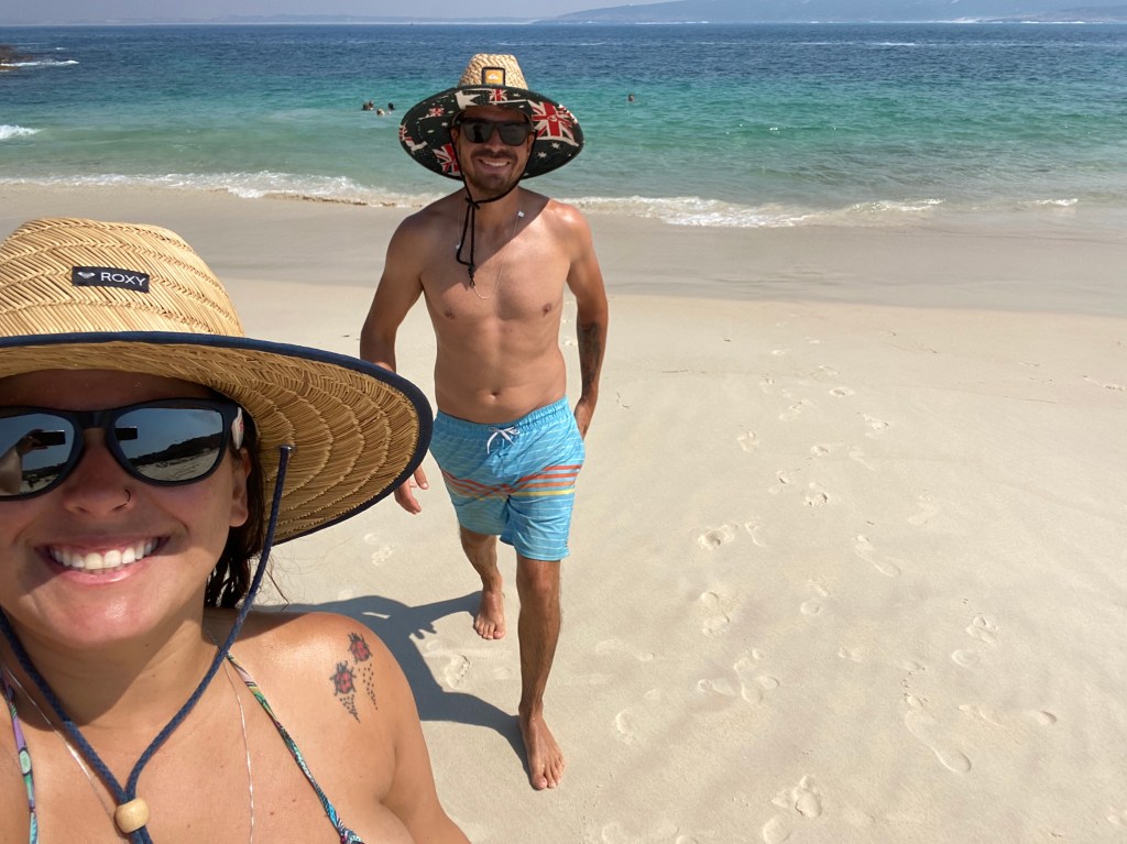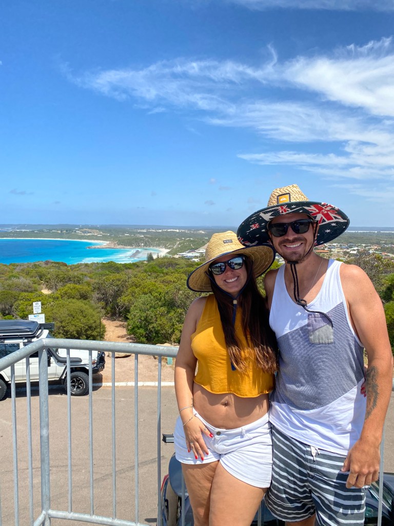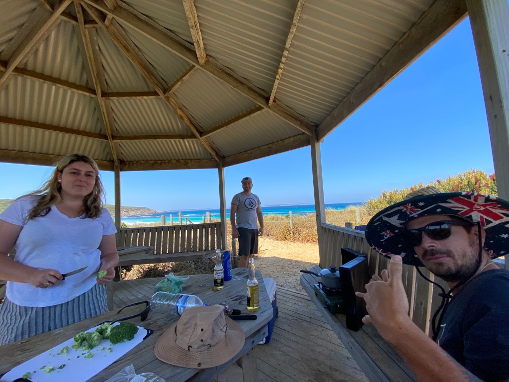 Fim de ano, verão e minha cunhada e concunhado vieram nos visitar em Perth e decidimos mostrar as praias mais bonitas da Austrália para eles. Saímos por volta da 1pm e já tínhamos feito as compras no mercado pros 5 dias ($46 pra cada + $16 bebidas) – só compramos o gelo ($4) na hora de sair para por no cooler.
