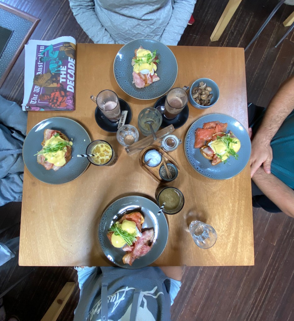 Acordamos, desmontamos acampamento, paramos no mirante de Shelly Beach e fomos tomar um cafezão da manhã ($116) em Denmark já que tinha amanhecido nublado. Escolhemos o Mrs Jones Cafe e super recomendo – melhor Eggs Benedict que comi por aqui com direito a suco natural.
