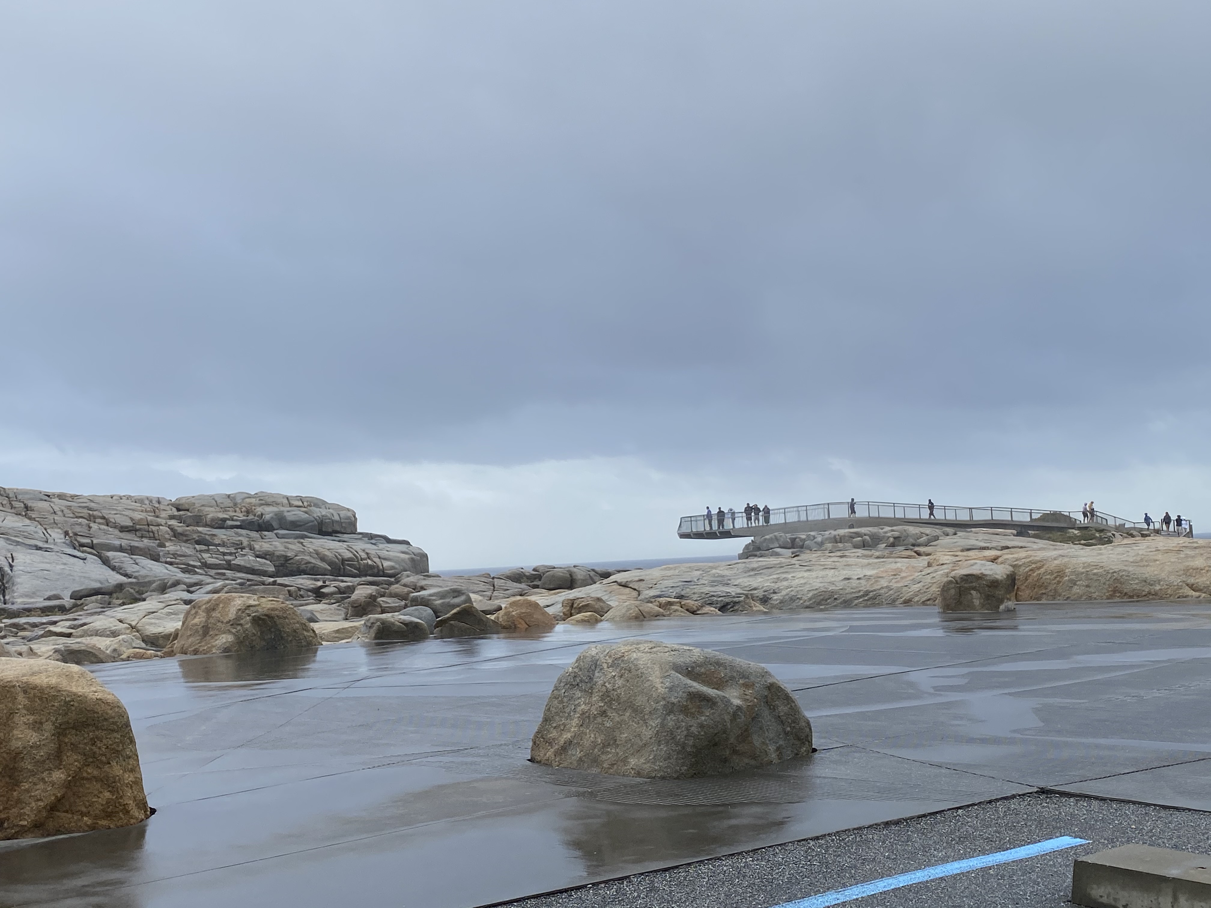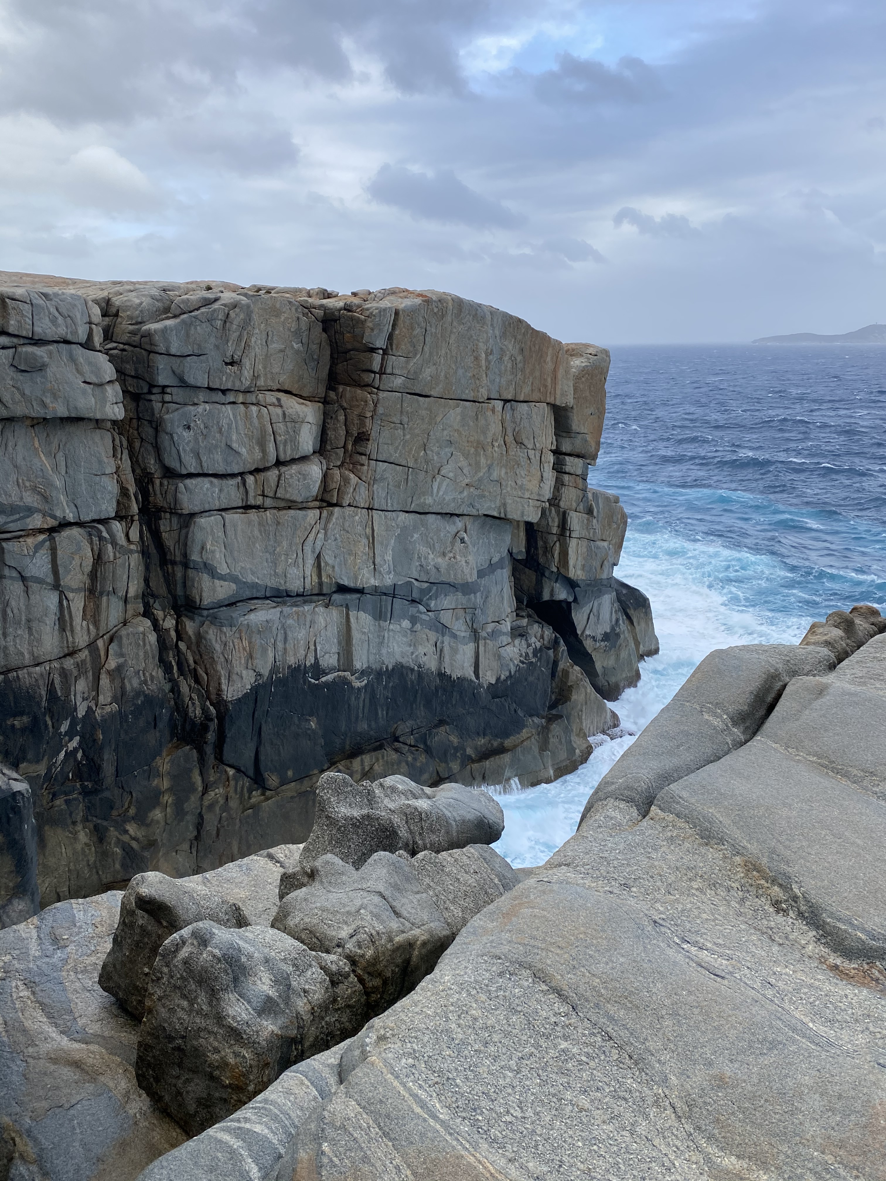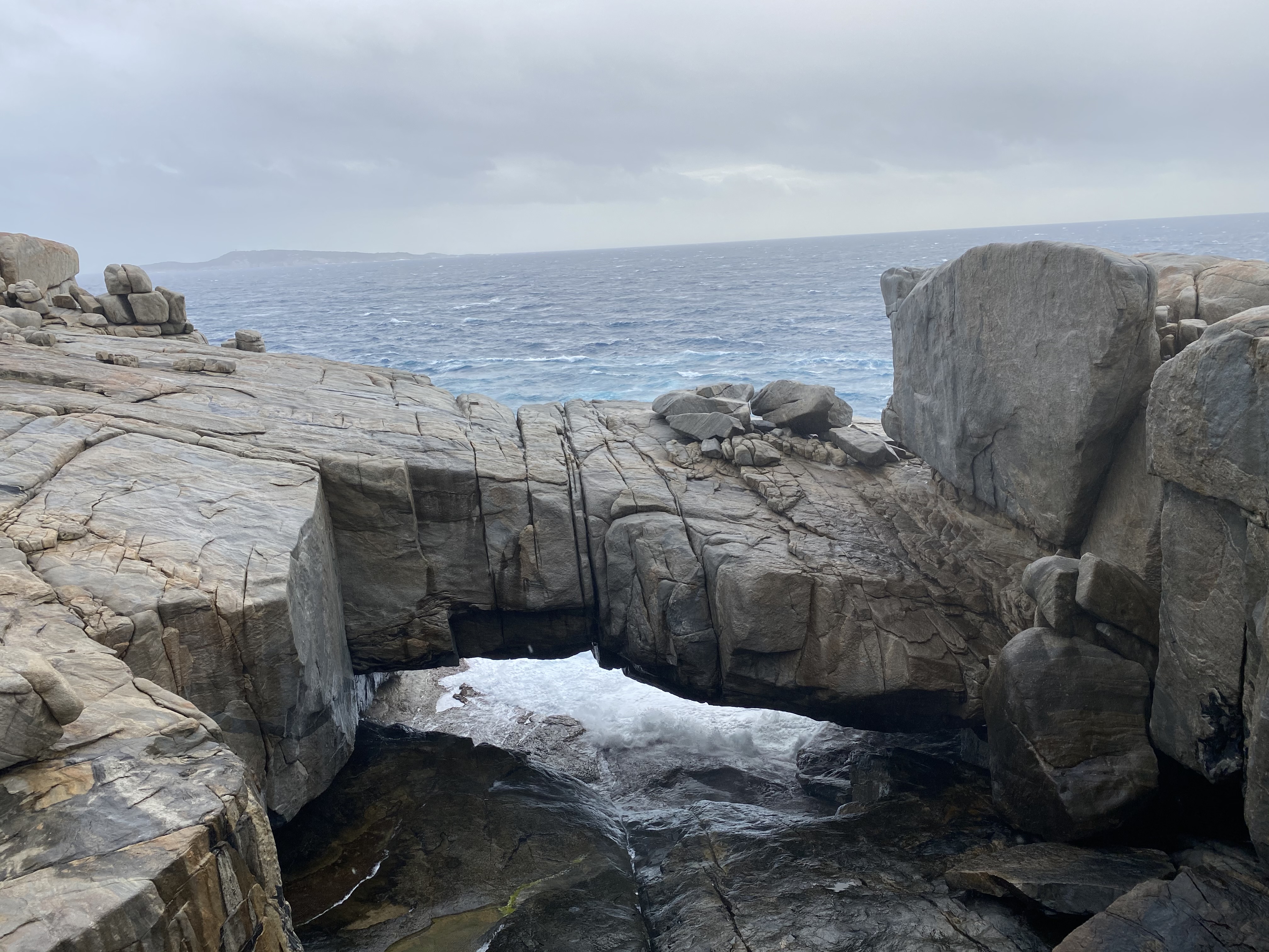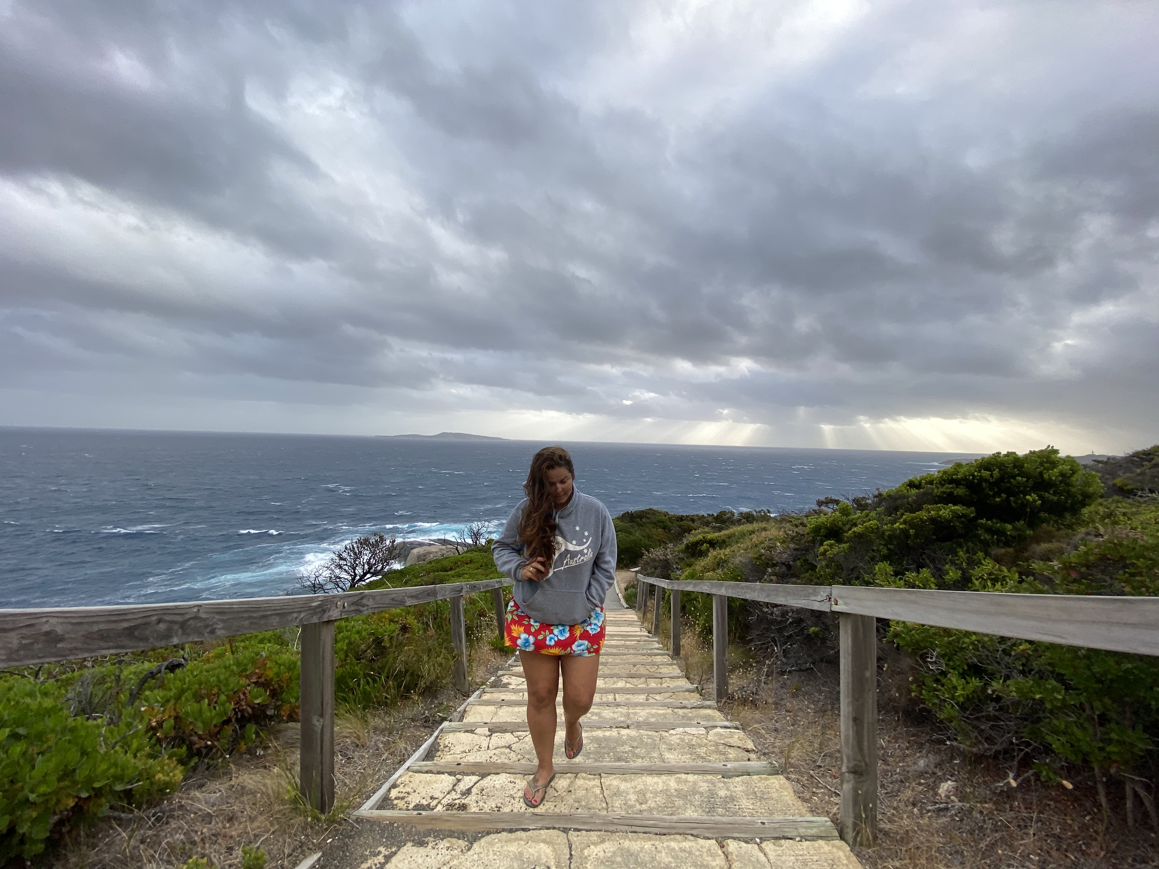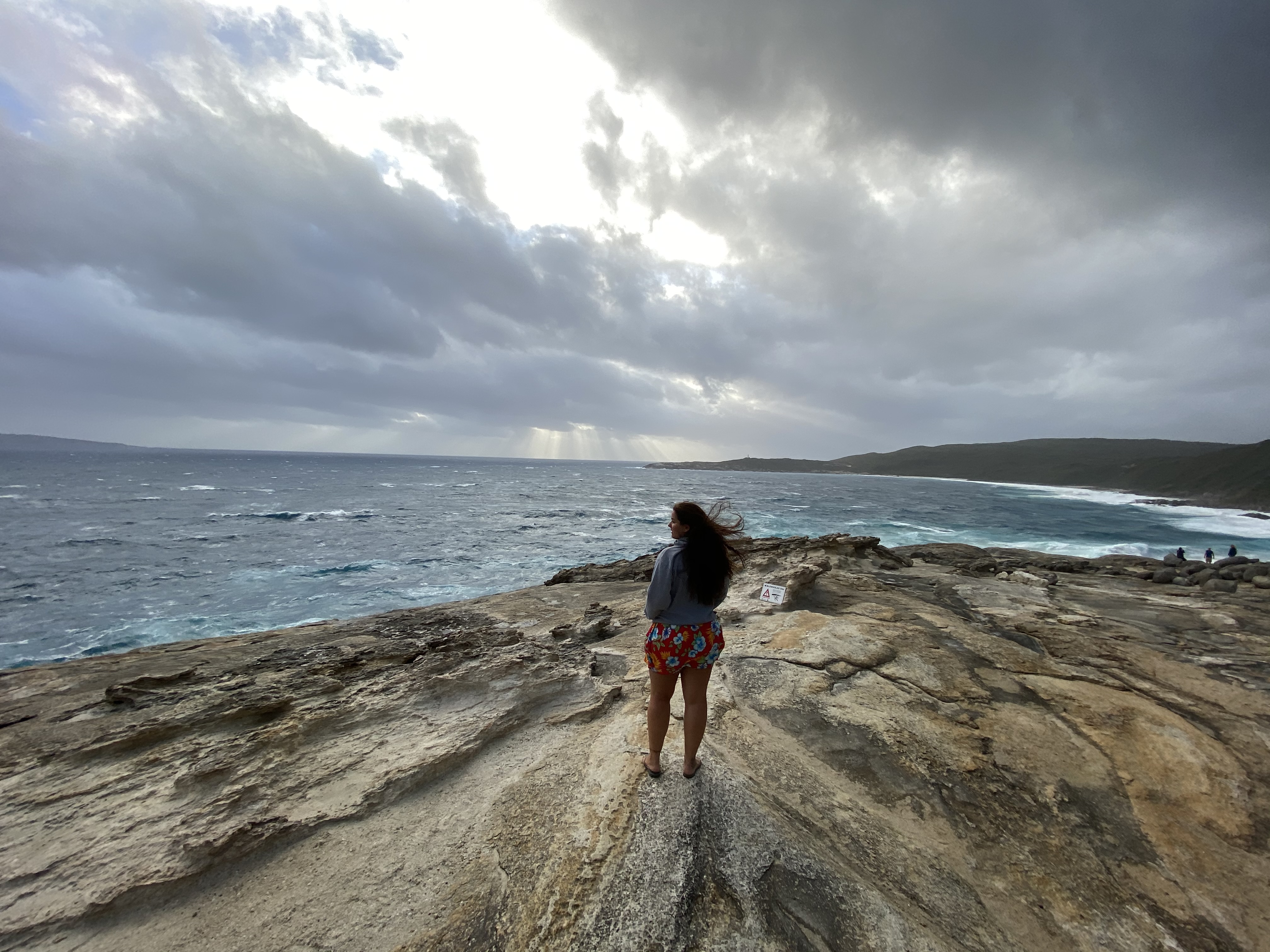 Chegando em Albany, abastecemos ($55) e o tempo fechou, deu uma esfriadinha e fomos até o The Gap um lugar sensacional que recomendo todo mundo ir. É uma plataforma que fizeram em cima de uma parte que o mar bate nas pedras – super alto e dá até medo da força do mar ali. Não tirei nem foto com medo de derrubar o celular por conta do vento e da força do mar. Do lado tem a Natural Bridge também que como o nome já diz é uma ponte feita naturalmente por pedras no local. Seguimos até o Blowhole – uma caminhadinha de uns 10 minutos do estacionamento. Fico impressionada em lugares como esse com a imensidão do mar.