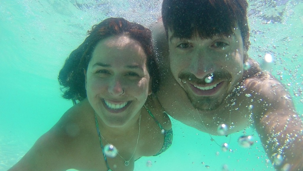 A cor do mar é indescritível, não tem foto que consiga demonstrar essa beleza, só indo lá pessoalmente e nadando nessa gigante piscina. Eu e o Vini decidimos subir na pedra que fica no meio do mar para ter uma vista ainda mais incrível da praia e lógico que no fim pulamos lá de cima.