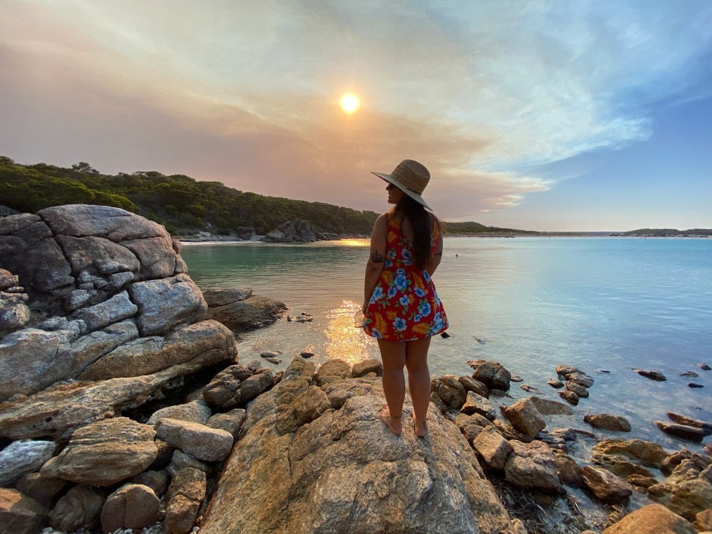 A Bremer Beach é super extensa e parece um lago de tão calmo que é o mar. Tinha um pessoal de 4×4 pela praia, super legal. Estava ventando muito e acabamos não entrando na água e demos uma volta pelas pedras para ver o fim de tarde. Por conta do fogo – agora em outro parque – tinha uma camada de fumaça na frente do sol. Por lá também tem churrasqueiras, além de chuveiros e banheiros – toda a estrutura necessária.