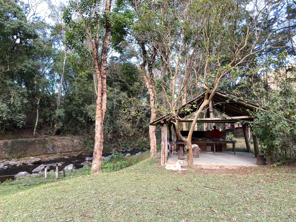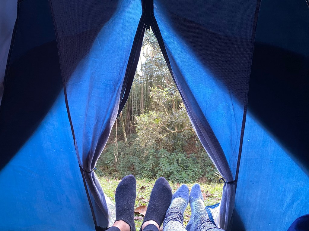 Para evitar o máximo o contato com outras pessoas, decidimos acampar em Maringá – RJ e achamos o Camping do Torto aberto ($30 por pessoa/dia). A estrutura é simples mas suficiente para o que precisávamos – tem banheiros com água quente, energia elétrica e área de churrasqueira. De um lado fica a estradinha de terra e do outro o Rio Preto que separa os Estados do Rio de Janeiro e Minas Gerais. Chegamos, armamos barraca bem em frente ao riozinho e fizemos uma pizza para jantar. A noite o céu estava maravilhoso, super estrelado.