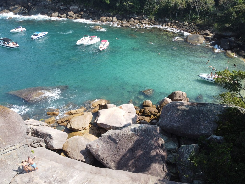 Cerca de 20 minutos e paramos na primeira praia: Praia do Caxadaço. A praia é super bonita e pequena e tem umas pedras no canto esquerdo que dá para subir e ter uma vista bem bonita da praia. Ponto negativo é que junto conosco chegaram mais umas 6 lanchas, ou seja, a praia e as pedras lotaram e não deu para curtir muito. Ficamos cerca de 20 minutos lá. Em alta temporada deve ser ainda pior mas a praia é linda.