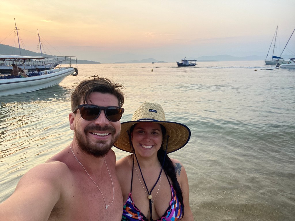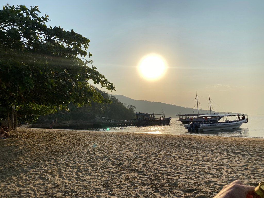 Última parada da Volta a Ilha foi na Praia de Maguariquessaba aonde o pessoal almoçou no Restaurante Peixe com Banana mas a gente não conseguiu reservar a comida a tempo no FlexBoat – estávamos bem atrás e com o barulho do motor não deu para ouvir que horas era pra reservar, enfim. Ficamos então aproveitando o pôr do sol na praia antes de voltar para o Abrãao. E caso estejam se perguntando, não, não teve NENHUMA edição ou filtro em nenhuma dessas fotos – Ilha Grande é mesmo o paraíso.
