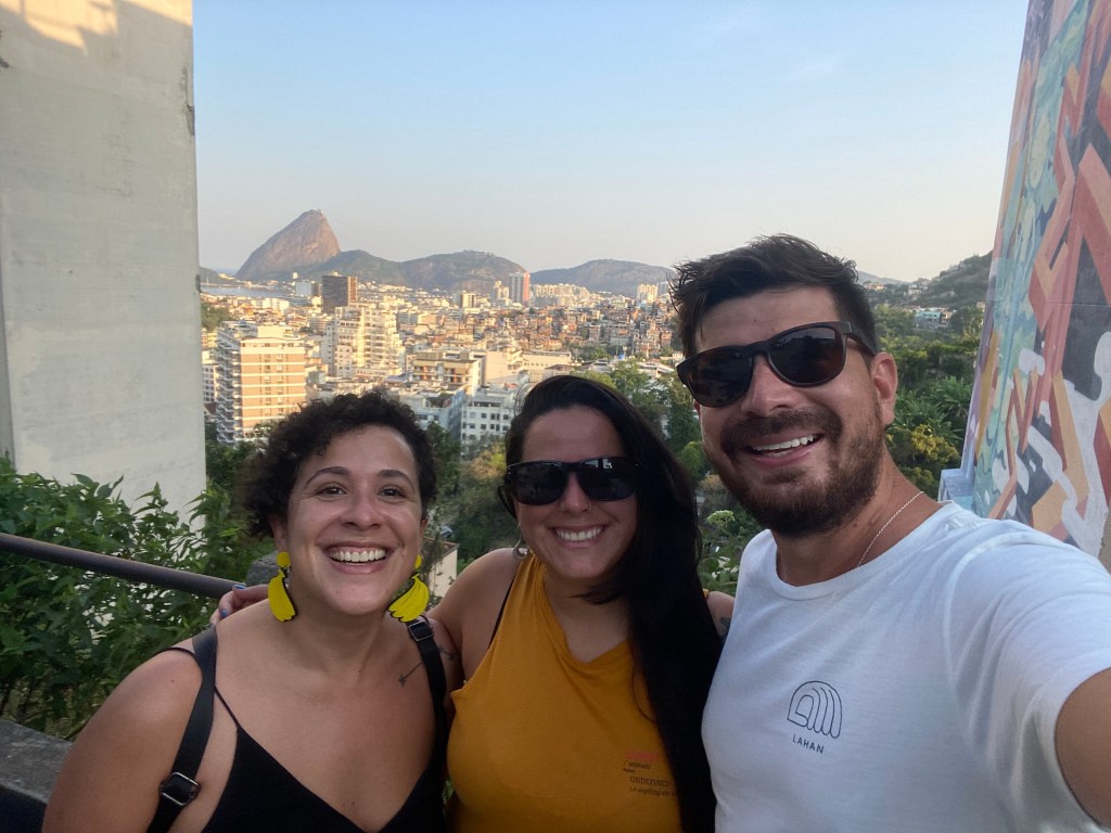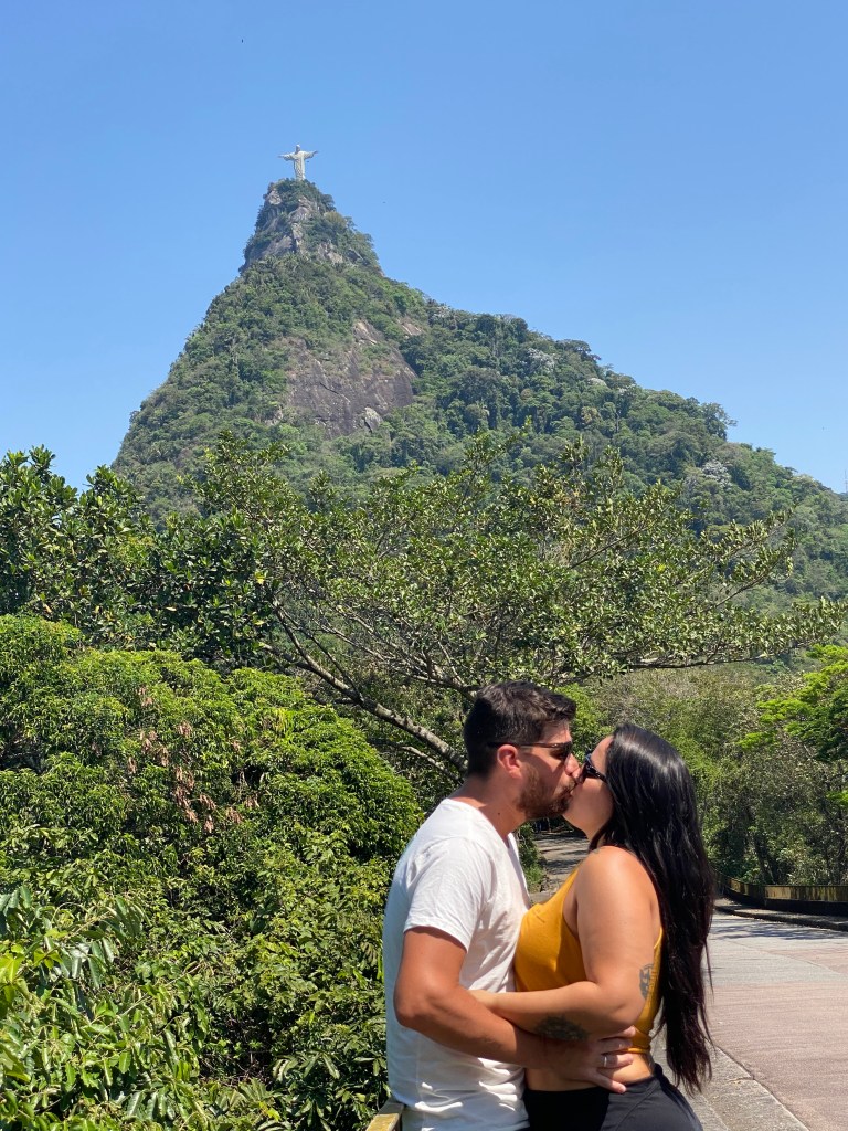 O Félix nos deu a dica do Mirante Dona Marta então pedimos um Uber (R$8) porém chegando lá estava fechado devido a pandemia – uma pena! Deu para tirar uma foto no caminho mas a vista lá do topo fica para uma próxima. Pegamos um motorista muitoooo gente boa – Hilquias – que foi contando várias histórias do Rio e nos mostrando coisas – e até tirou essa foto nossa.