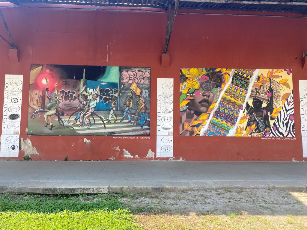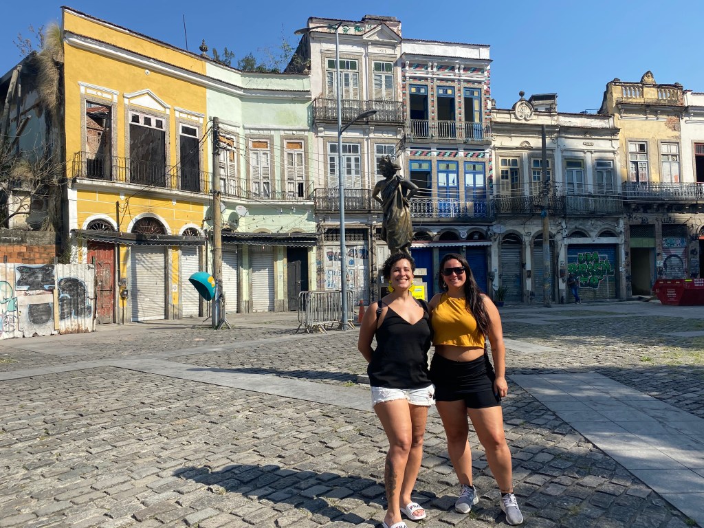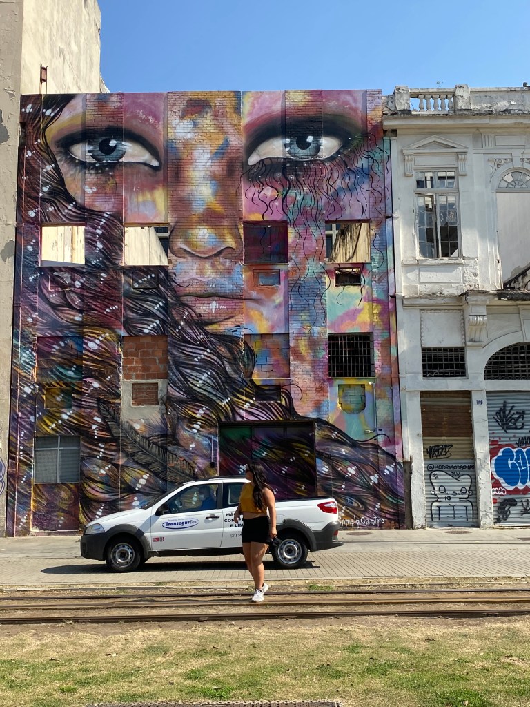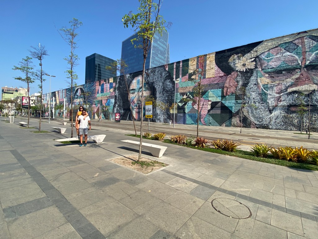 Depois do almoço pegamos um Uber até o Aqua Rio e caminhamos pela cidade por um tour menos turístico e muito mais local e histórico com a Bia cariocaaaaa linda! Fomos pela Rua Rodrigues Alves passando pelos armazéns cheios de arte e das paredes pintadas com retratos lindos – incluindo o Todos somos um do Kobra. Uma parede enorme com representantes de cinco tribos, cinco continentes, cinco arcos feito para as Olimpíadas de 2016 – sendo na época o maior grafite do planeta de acordo com o Guinness Book. Lindo demais!