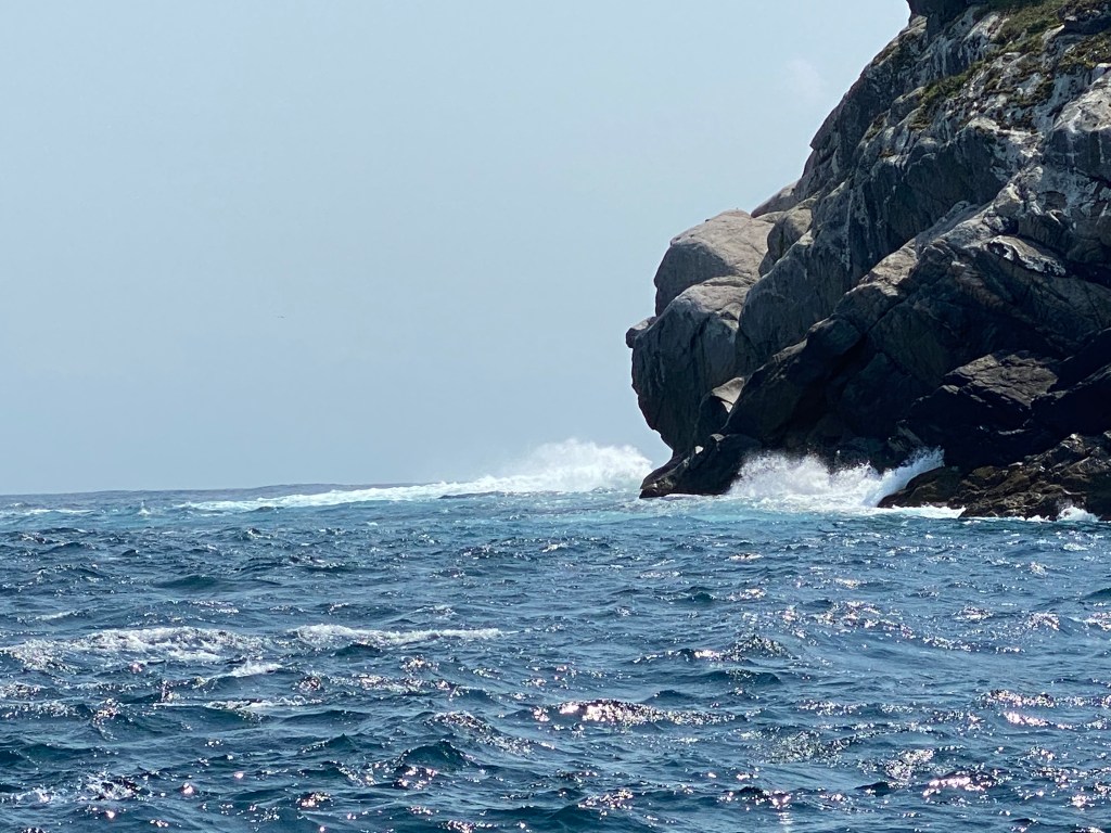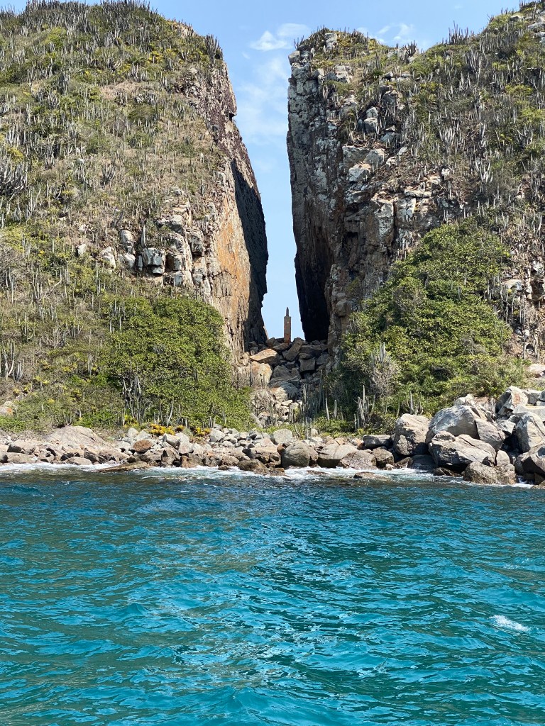 Primeira parada foi na Praia do Farol que só é possível chegar de barco – sem comentários, só olhe a foto abaixo. Por ser uma ilha com zona militar não rolou sobrevoar o drone, mas tudo bem. A praia é super preservada e só pode ficar uns 20 minutos (normalmente é 45 por embarcação). Na ida para a próxima praia que era ali na frente passamos pela Fenda de Nossa Senhora e pela Pedra do Macaco. Era pra termos ido na Gruta Azul também mas o mar estava muito agitado e não rolou.