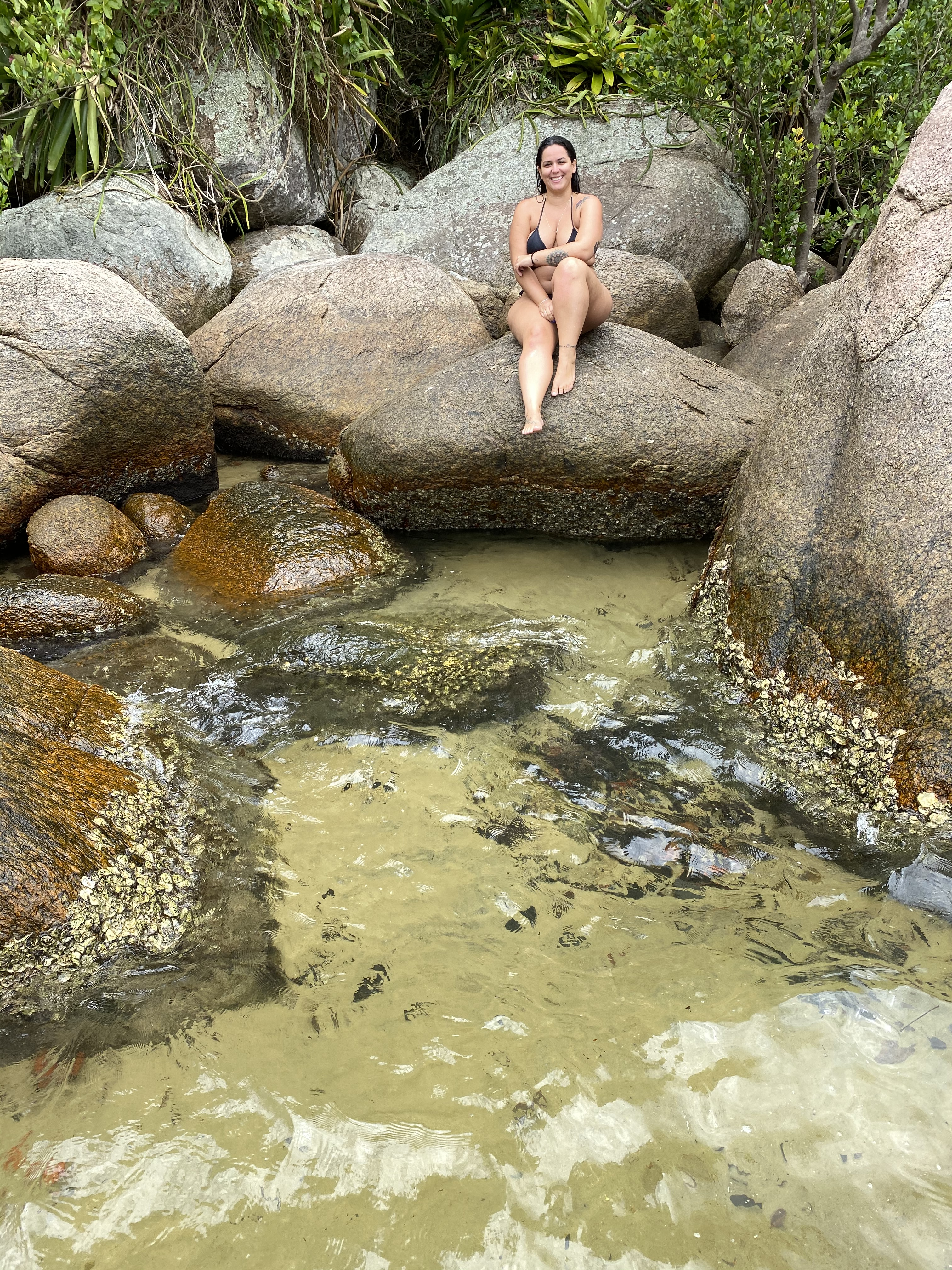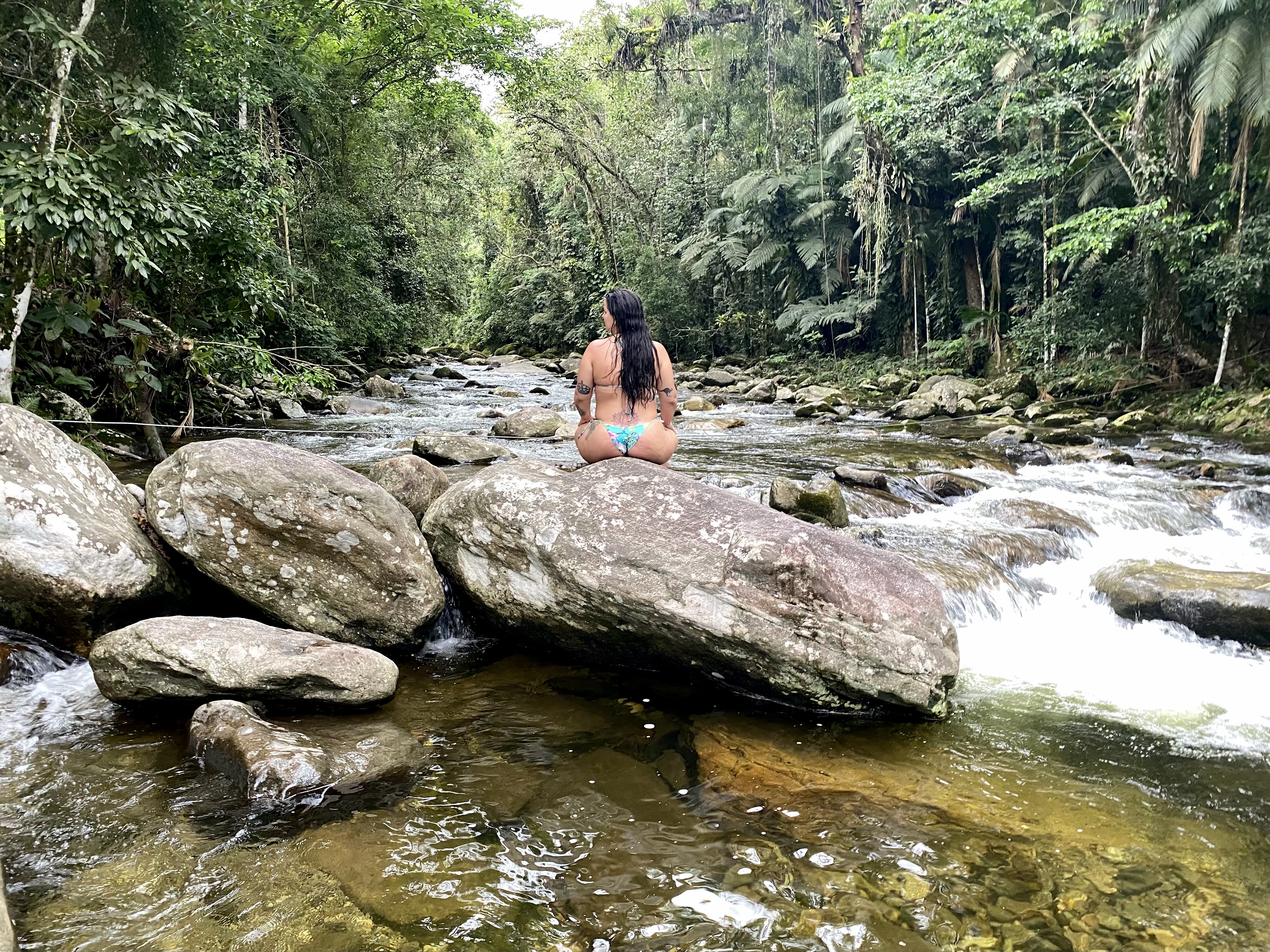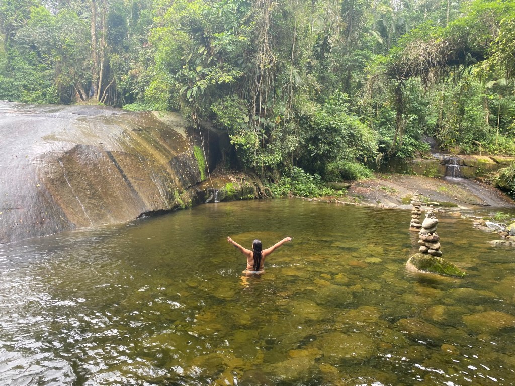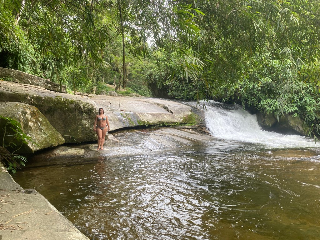 Na volta para Paraty tentamos ir conhecer a Aldeia Pataxó e a Cachoeira do Iriri que fica lá dentro porém estava fechada mas definitivamente vale a pena. E acho legal falar que essa não é a única aldeia indígena da cidade. Como queria um banho de cachoeira, coloquei cachoeira no Google Maps e a próxima que apareceu foi a Cachoeira do Taquari e eu amei. É uma área enorme, cheia de pedras e rio corrente. Esse lugar tem uma energia surreal e só tinha nós lá – perfeito!