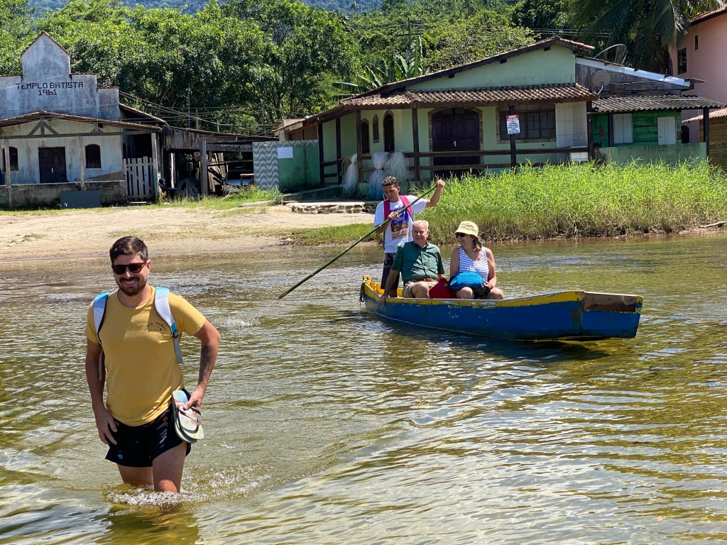 Para chegar em Paraty Mirim é só seguir sul na estrada Rio Santos e entrar na estradinha que é parte asfaltada e parte de terra. São 18km e leva cerca de meia hora. Logo na chegada tem diversos estacionamentos com ducha (R$20 o dia). Bem em frente a primeira igreja de Paraty – a Capela de Nossa Senhora da Conceição de 1702 – ficam várias pessoas oferecendo os passeios. Fechamos com o Léo (24) 99868-1332 e ele foi super gente boa.