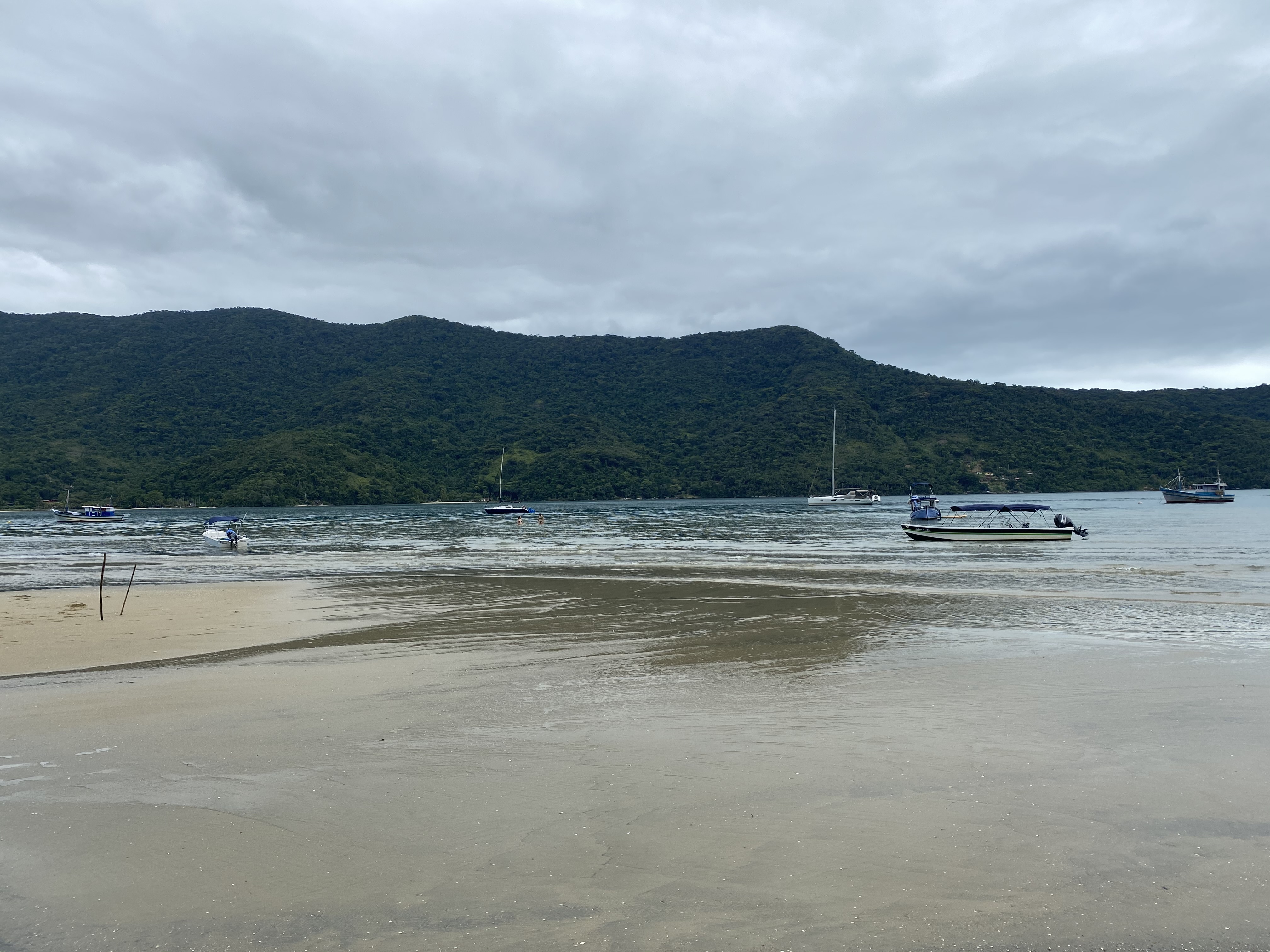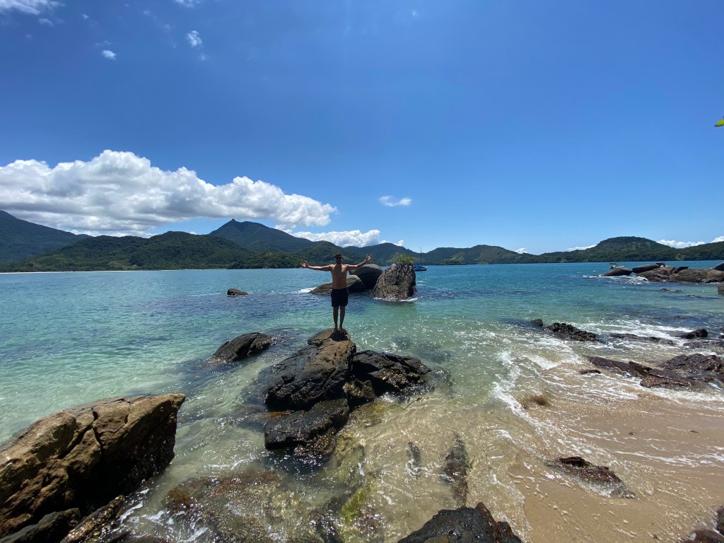 A previsão era de sol para hoje amanhã então resolvemos extender mais um dia na cidade. Quando acordamos o sol realmente deu as caras e fomos cerca de 30km norte de Paraty. O centro da cidade pode não ser muito grande mas a cidade é – são cerca de 60km pela Rodovia Rio-Santos. Ela faz divisa com Ubatuba e Angra dos Reis. Deixamos o carro na Praia de São Gonçalo (R$20 estacionamento) bem no final dela, já passando a ponte. Para acessar a praia, tem que cruzar um pequeno riozinho a pé ou de barquinho dependendo de quão cheio ele está.