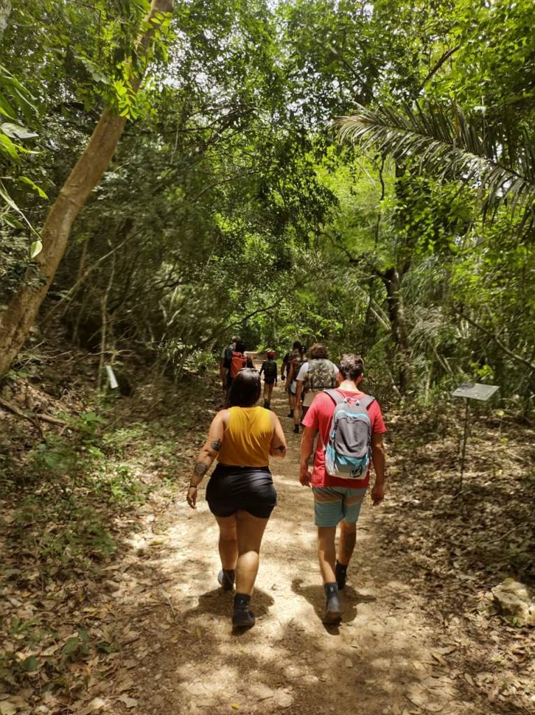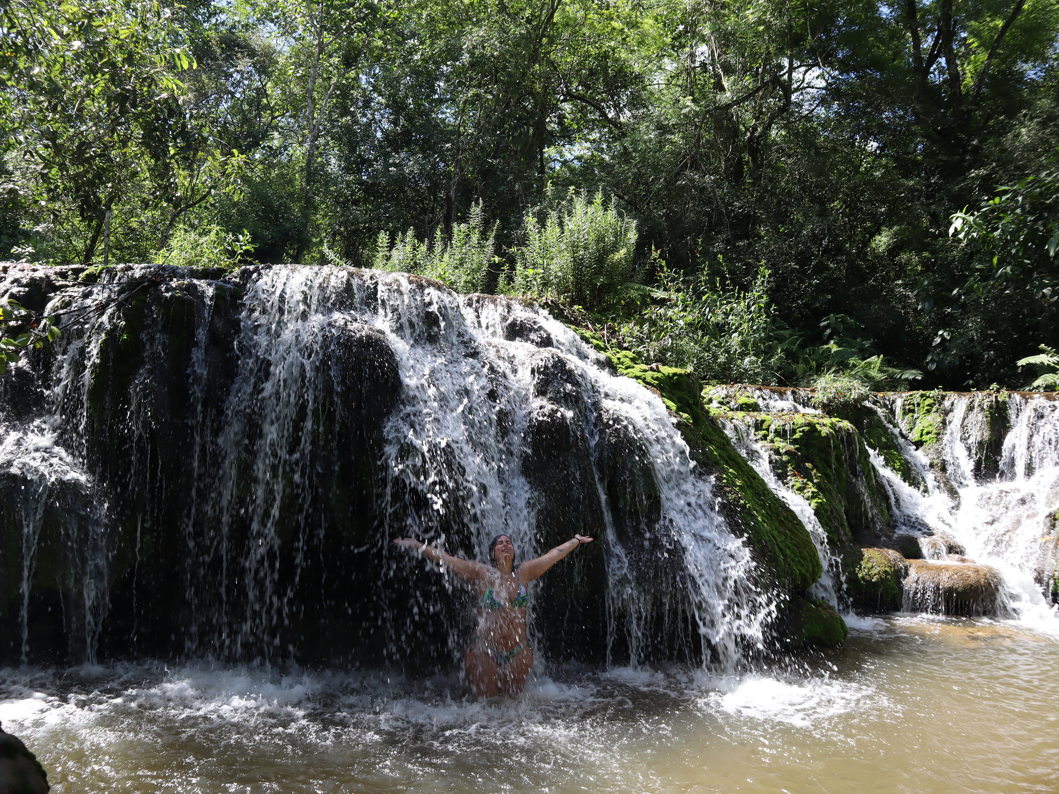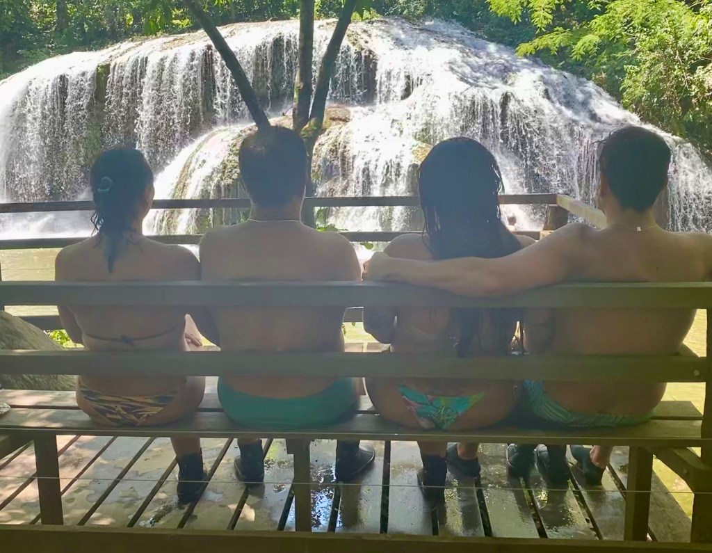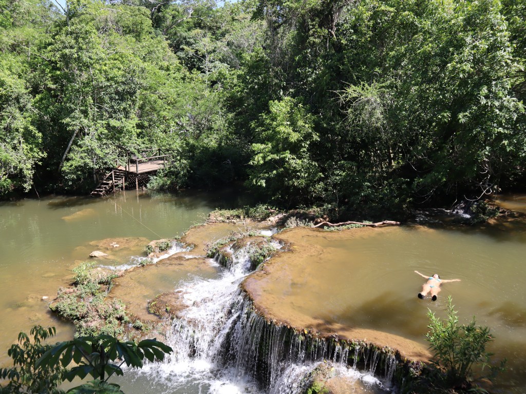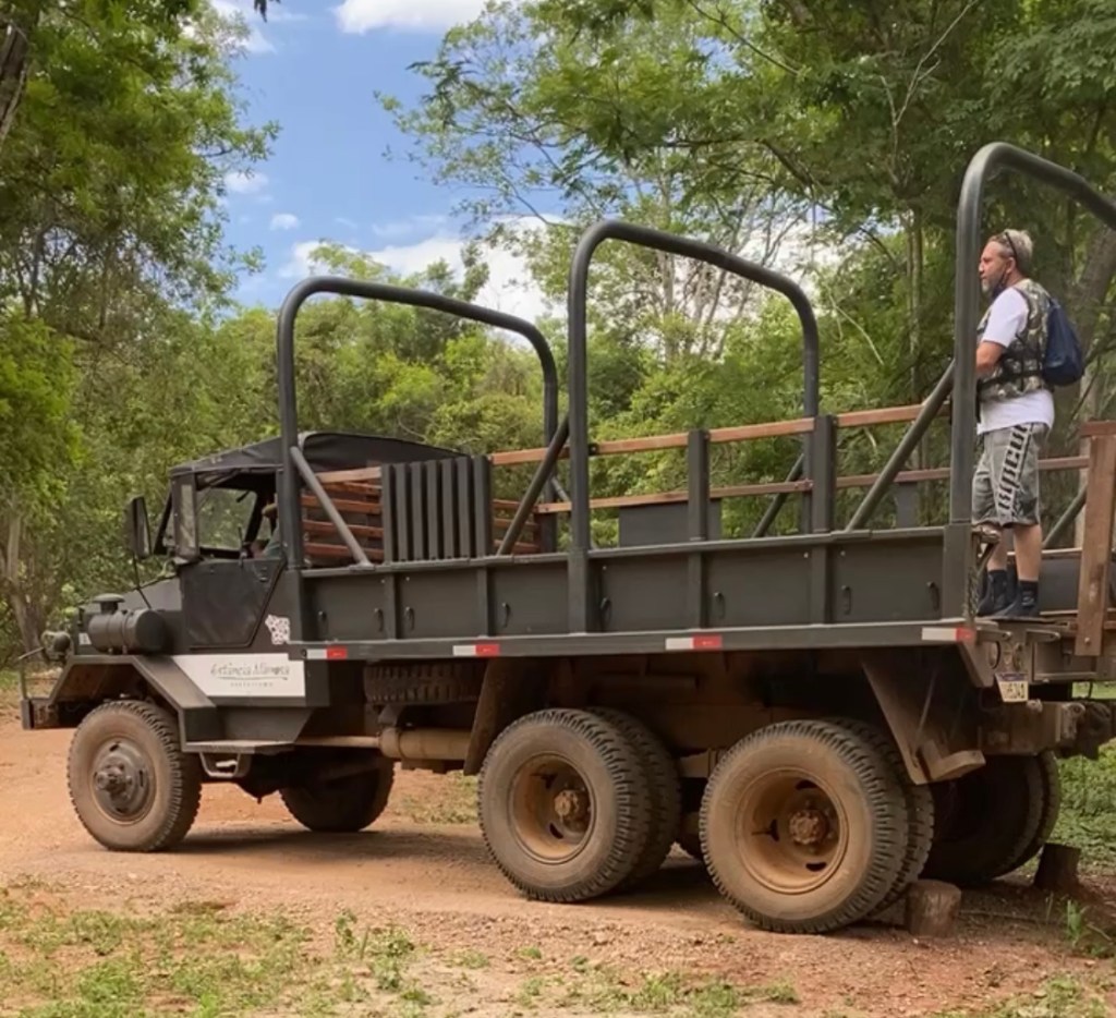 Chegamos por volta das 10 da manhã e fomos direto para a Estância Mimosa – um complexo de cachoeiras (R$117 por pessoa ou R$94 se você for do MS). O nosso grupo tinha apenas 9 pessoas – incluindo nós 4, ou seja, praticamente um passeio privativo. Na chegada, o guia se apresenta, passa as informações, nos oferece colete salva vidas e uma botinha – que eu aceitei, já que embaixo das cachoeiras tem calcário e podia cortar os pés. Feito isso pegamos um “caminhão” 6×6 para fazer parte do trajeto de subida. Alguns minutos depois, chegamos no começo da trilha.