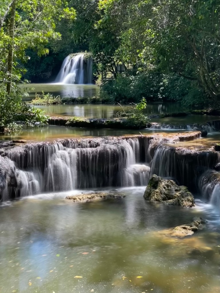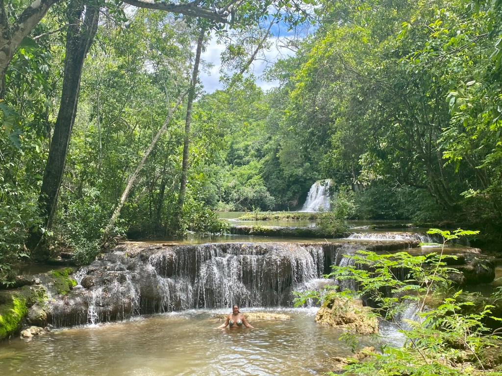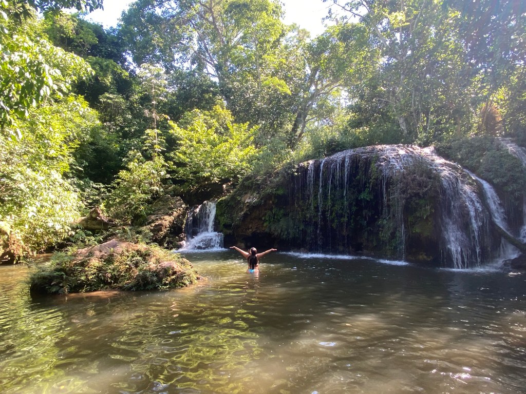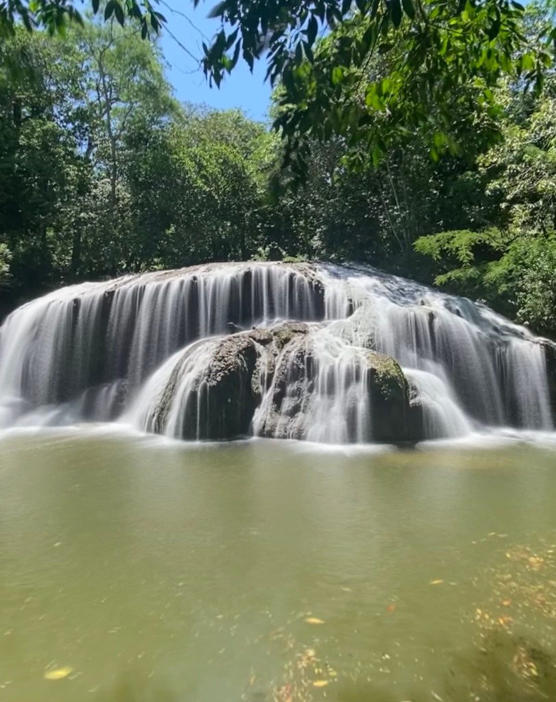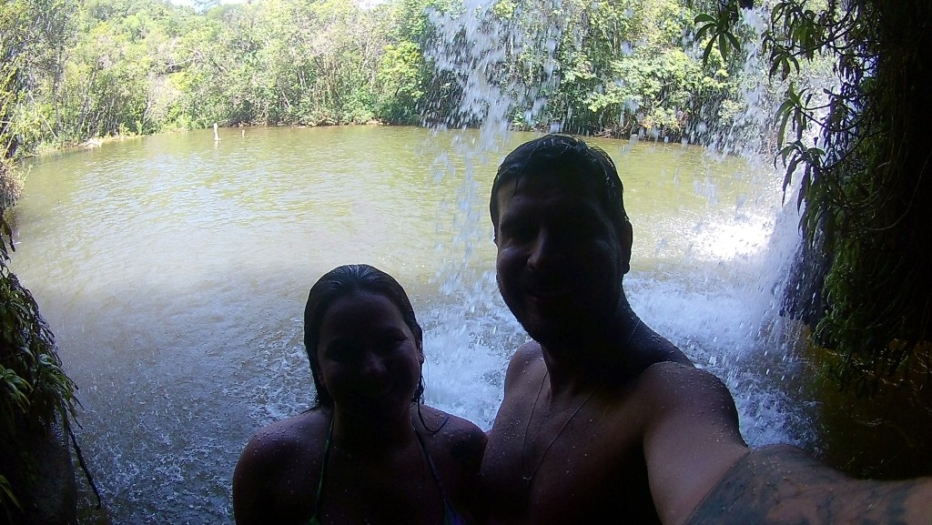 Pegamos o barquinho de volta, caminhamos mais um pouco e lá estava a Cachoeira do Sol. O que achei incrível é que tem uma caverna que você pode nadar por dentro da cachoeira, muito irado! Essa já é bem funda e tem uma área grande para nadar. Também foi uma das que mais gostei.