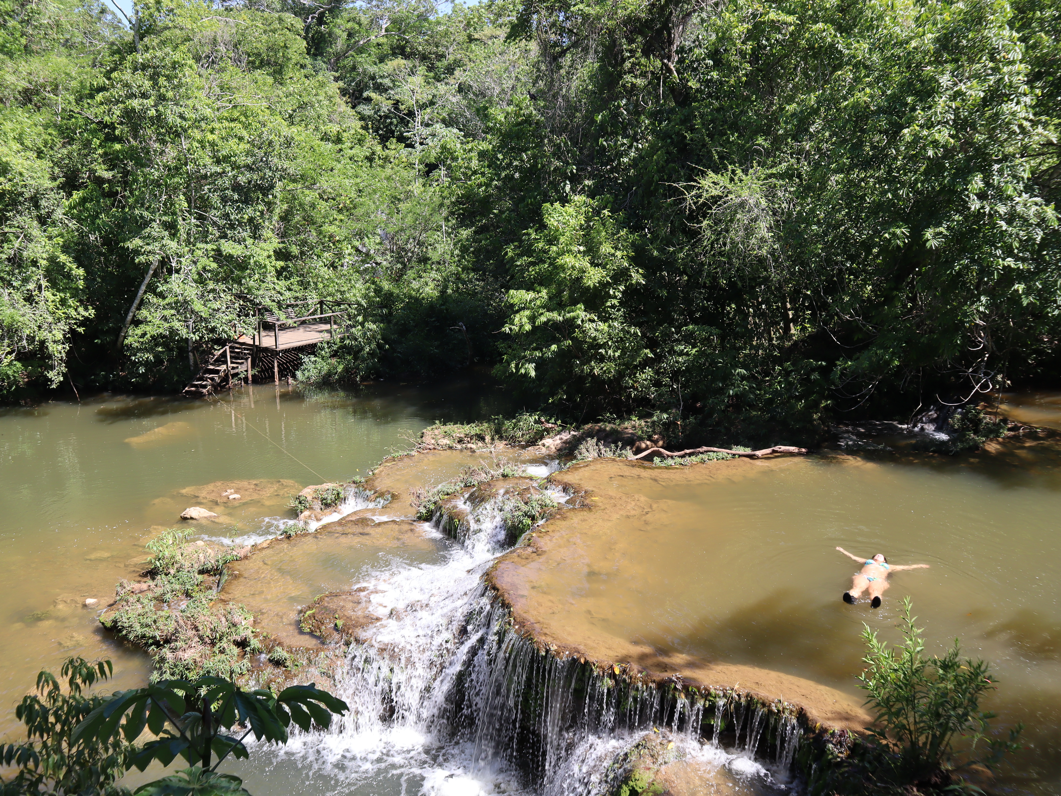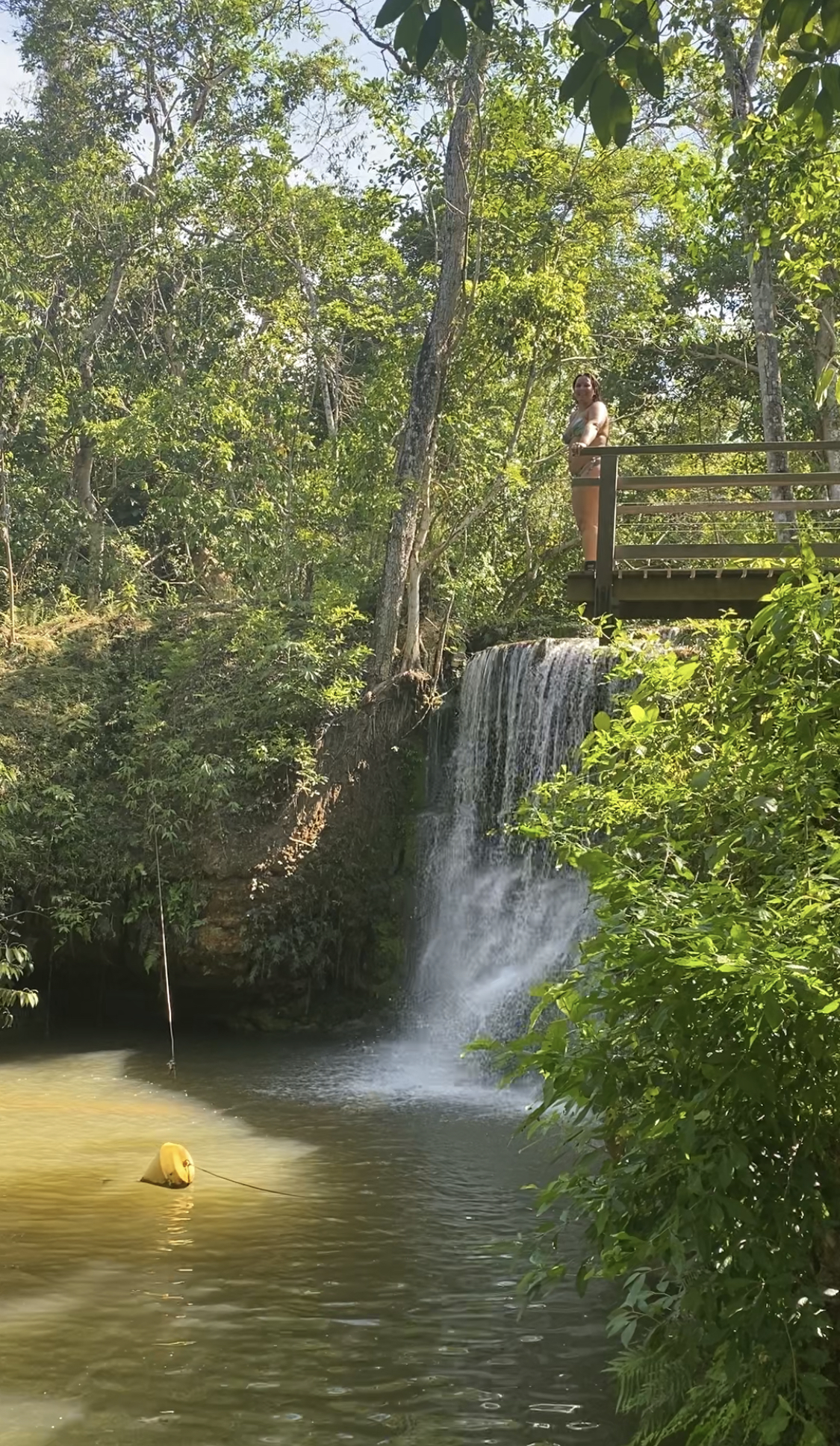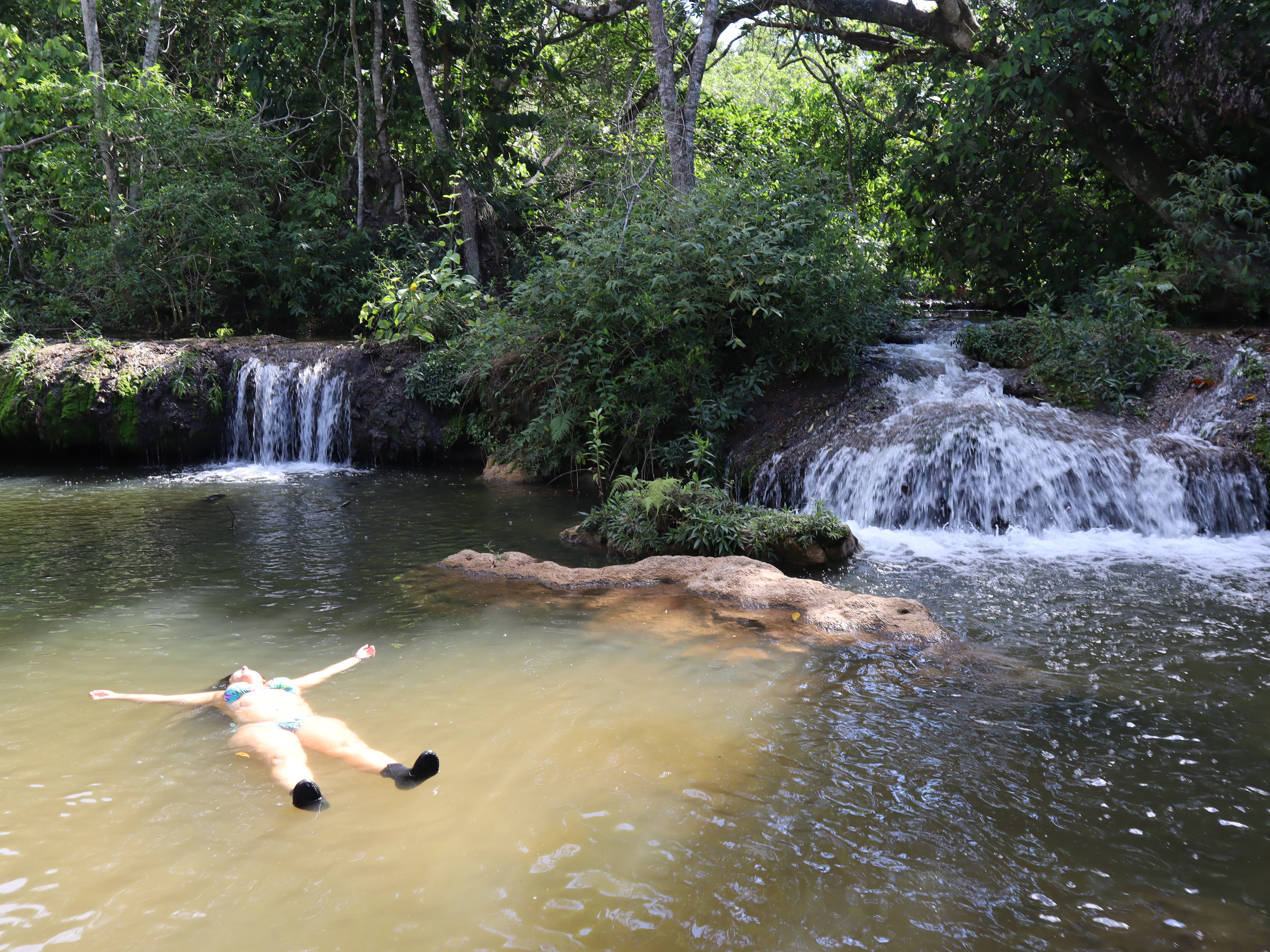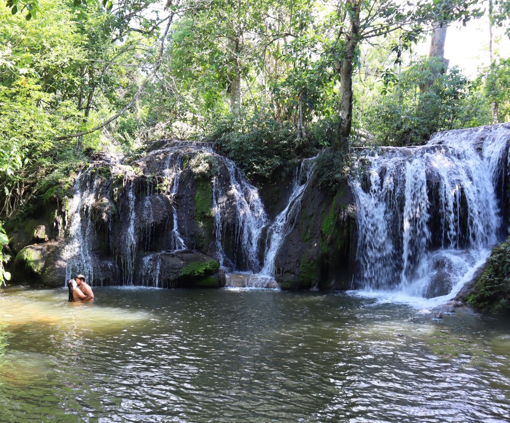 Pegamos o barquinho de volta, caminhamos mais um pouco e lá estava a Cachoeira do Sol. O que achei incrível é que tem uma caverna que você pode nadar por dentro da cachoeira, muito irado! Essa já é bem funda e tem uma área grande para nadar. Também foi uma das que mais gostei.