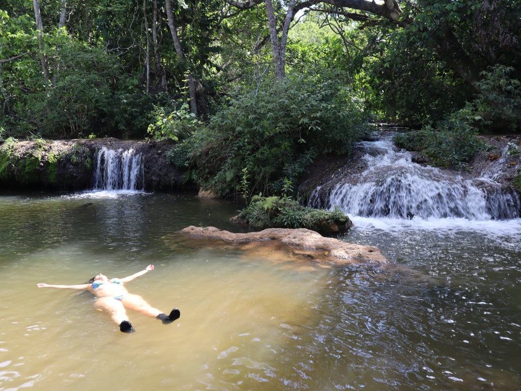 E fechamos o passeio na décima cachoeira: das Figueiras – nome dado por conta da quantidade dessas árvores ao redor – inclusive algumas caídas. Bem rasinha e foi só um mergulho rápido já que todo mundo estava morrendo de fome. Foi cerca de 4km de caminhada numa trilha super tranquila recomendada para qualquer nível físico.