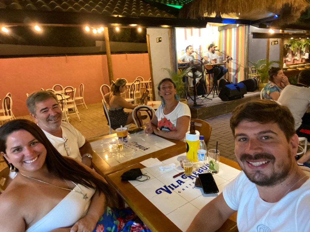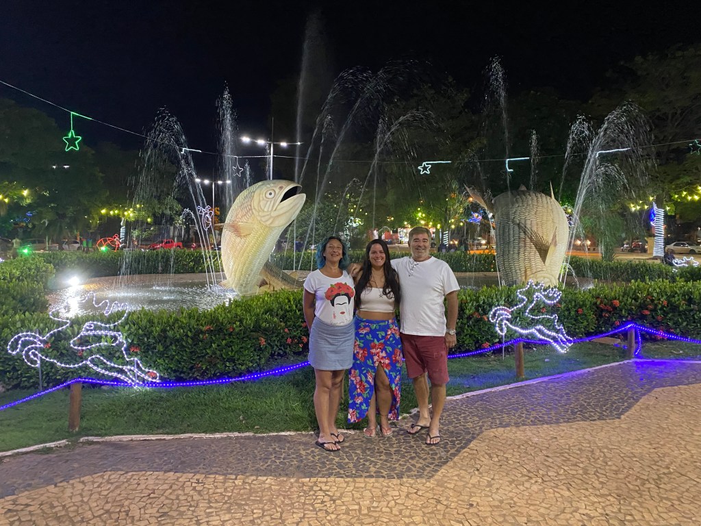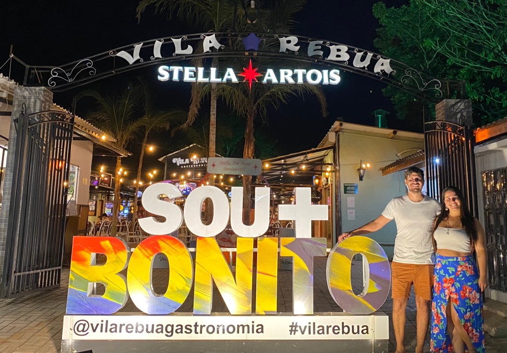 A noite fomos dar uma volta no centrinho que está todo decorado para o Natal. Deixamos o carro na Praça da Liberdade e seguimos pela rua principal. No caminho achamos um lugar que amei: Vila Rebuá! Sério, se você for para Bonito tem que ir lá. Que vibe boa… são vários restaurantes e tem um bar no meio – alguns dias inclusive tem música ao vivo. Comemos no Bra Sou Parilla (R$46 porção de filé e fritas) – super recomendo! Comida bem boa. Meu pai e a Sô pegaram o espetinho e também gostaram bastante. Ah, pedi o brigadeiro com amendoim (R$10) e também recomendo. E as bebidas compramos no Bar da Vila – caipirinha boa e cerveja trincando. É lá também que fica o letreiro da cidade (tem outro mais simples e menor em frente ao Centro de Informação Turística na entrada da cidade). Tomamos umas, ficamos curtindo o Sertanejo da dupla Isaac & Vinícius e voltamos para descansar.