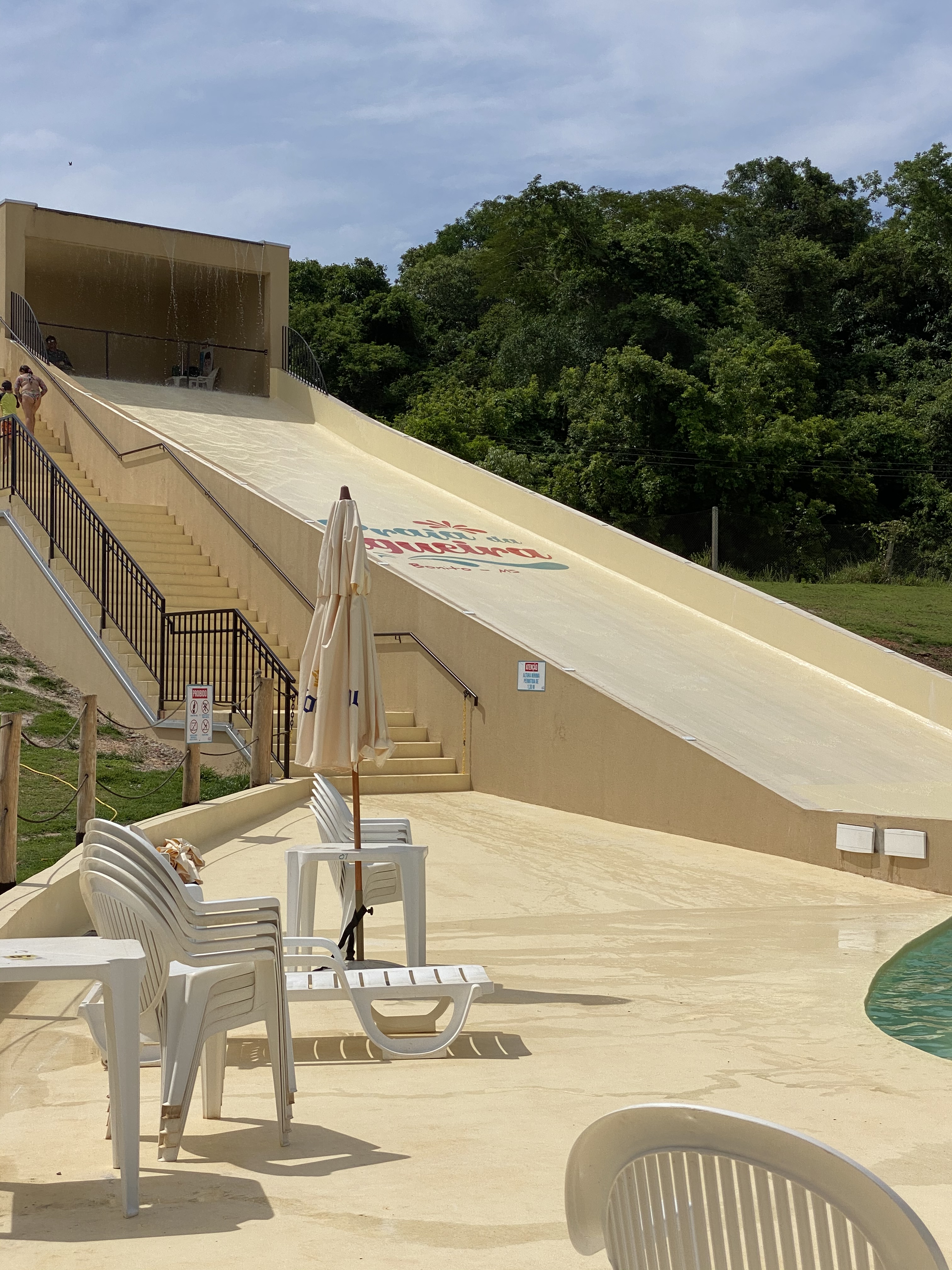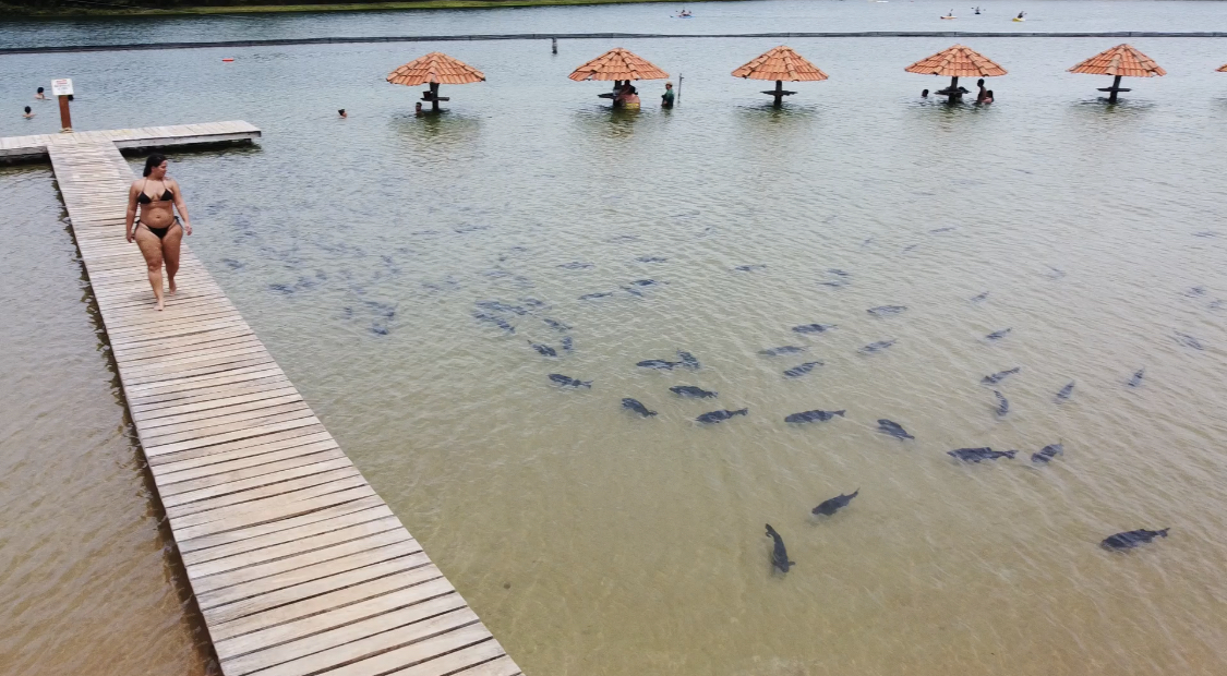 A Praia da Figueira tem esse nome por se assemelhar mesmo a uma praia. Lá tem quiosque, escorregador para as crianças (pequenas ou grandes como eu rs), tirolesa, caiaque e stand up, bar molhado e o mais legal é a quantidade de peixes que ficam ali em volta no rasinho super tranquilos. Tem também área de descanso com bangalôs e redes. Ah, e tem um avião na água rs. O espaço é bem grande e com certeza em finais de semana e feriados lota – então se prepare. A gente deu sorte de estar bem vazio e conseguimos descansar e curtir numa boa.