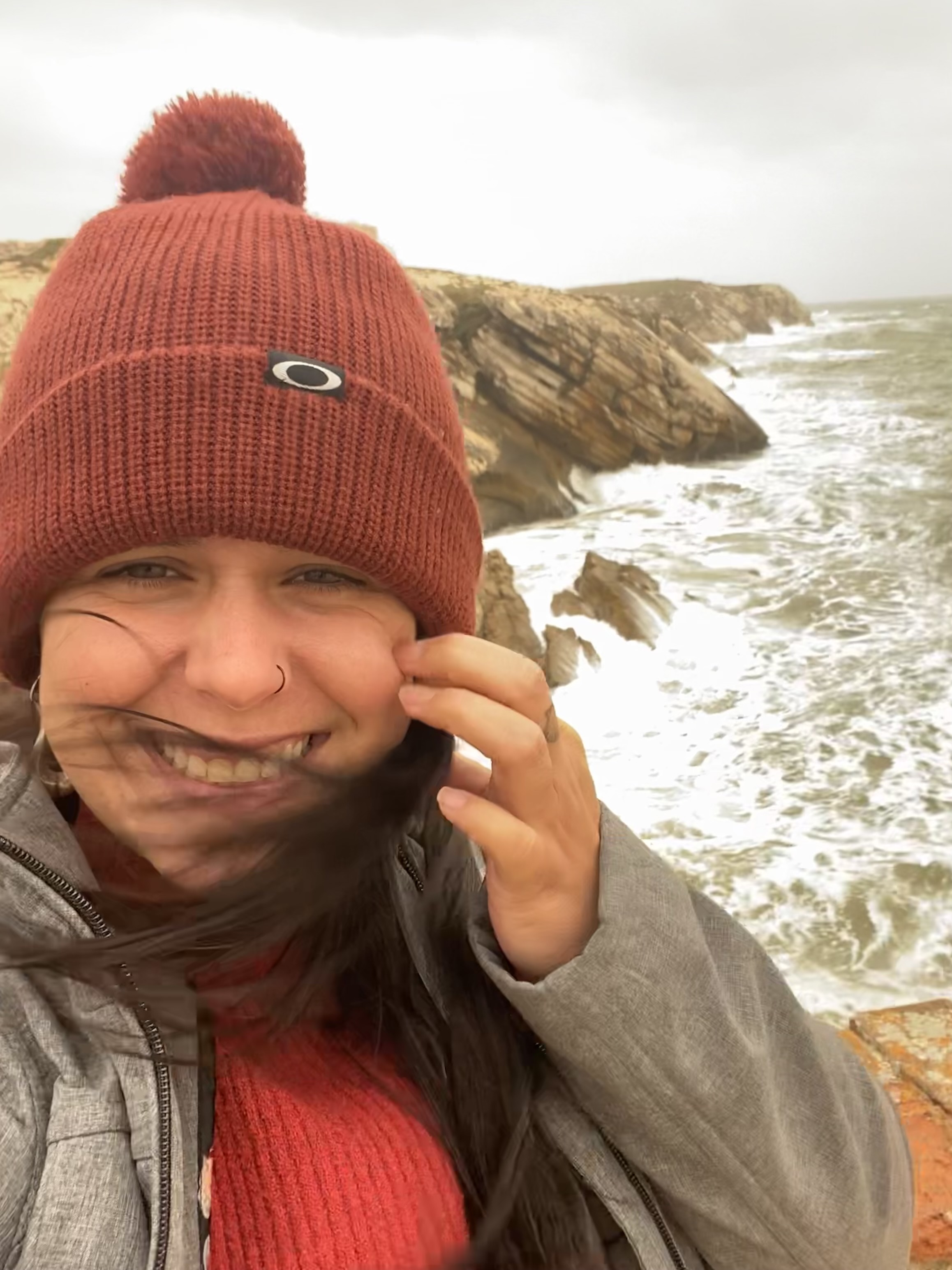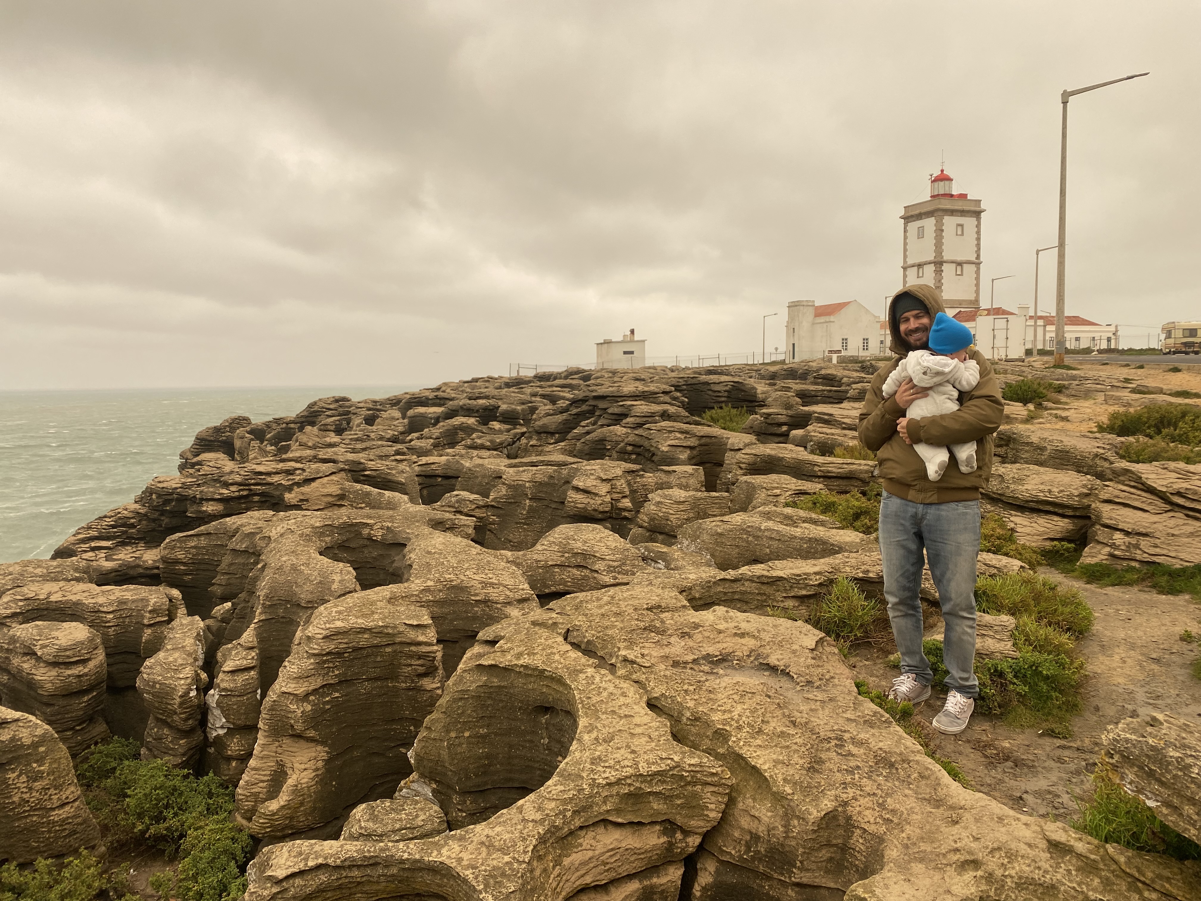 Continuamos pela costa e no caminho tem diversos pontos para parar – alguns dá para descer até perto do mar como a Varanda de Pilatos mas devido as condições climáticas não fizemos, lógico. Paramos no Miradouro da Cruz dos Remédios e seguimos para o Farol do Cabo Carvoeiro e descemos uma escada que fica do lado esquerdo. Mais a frente tem a Gruta da Furninha que também não fomos por conta do clima.