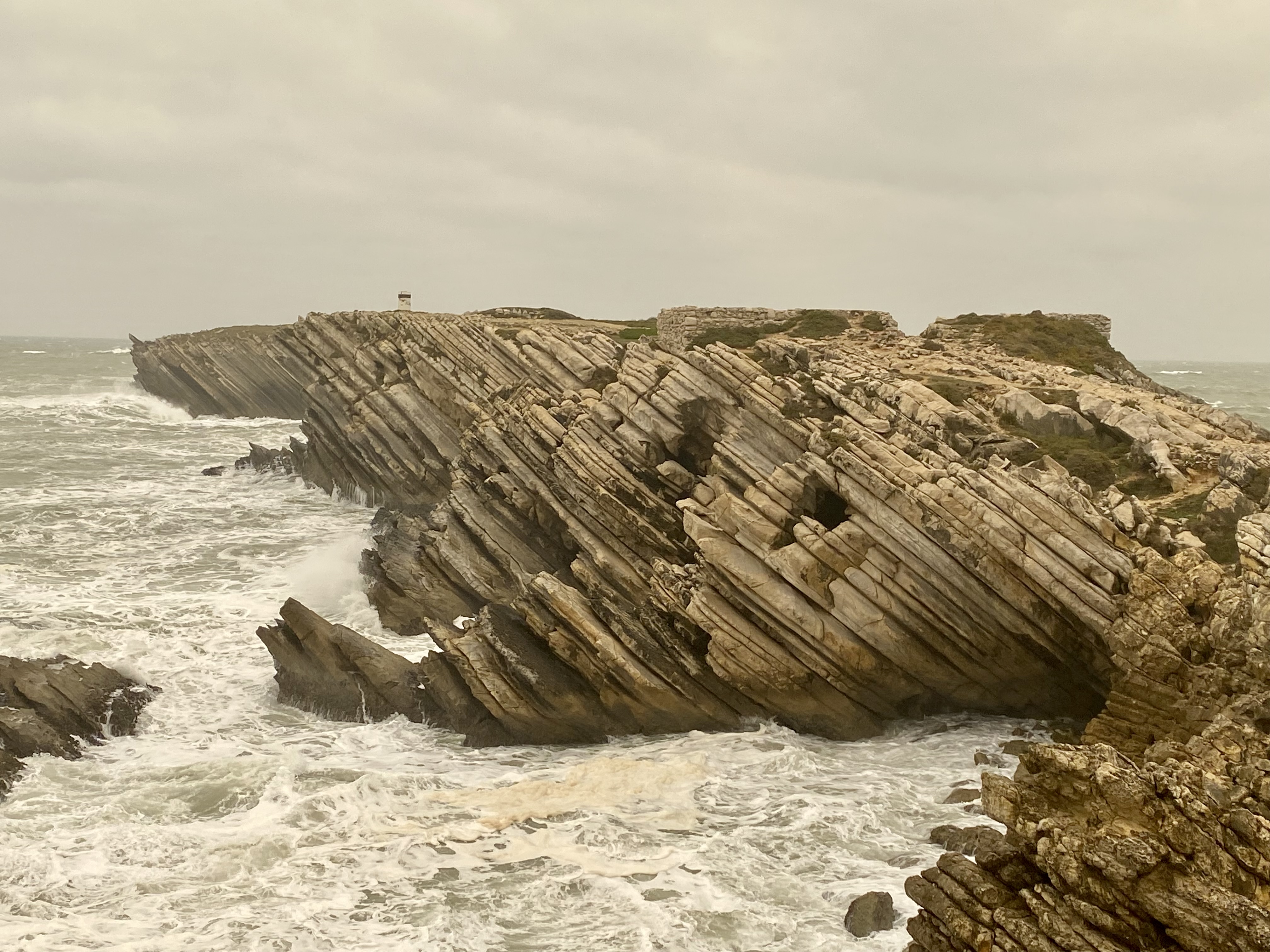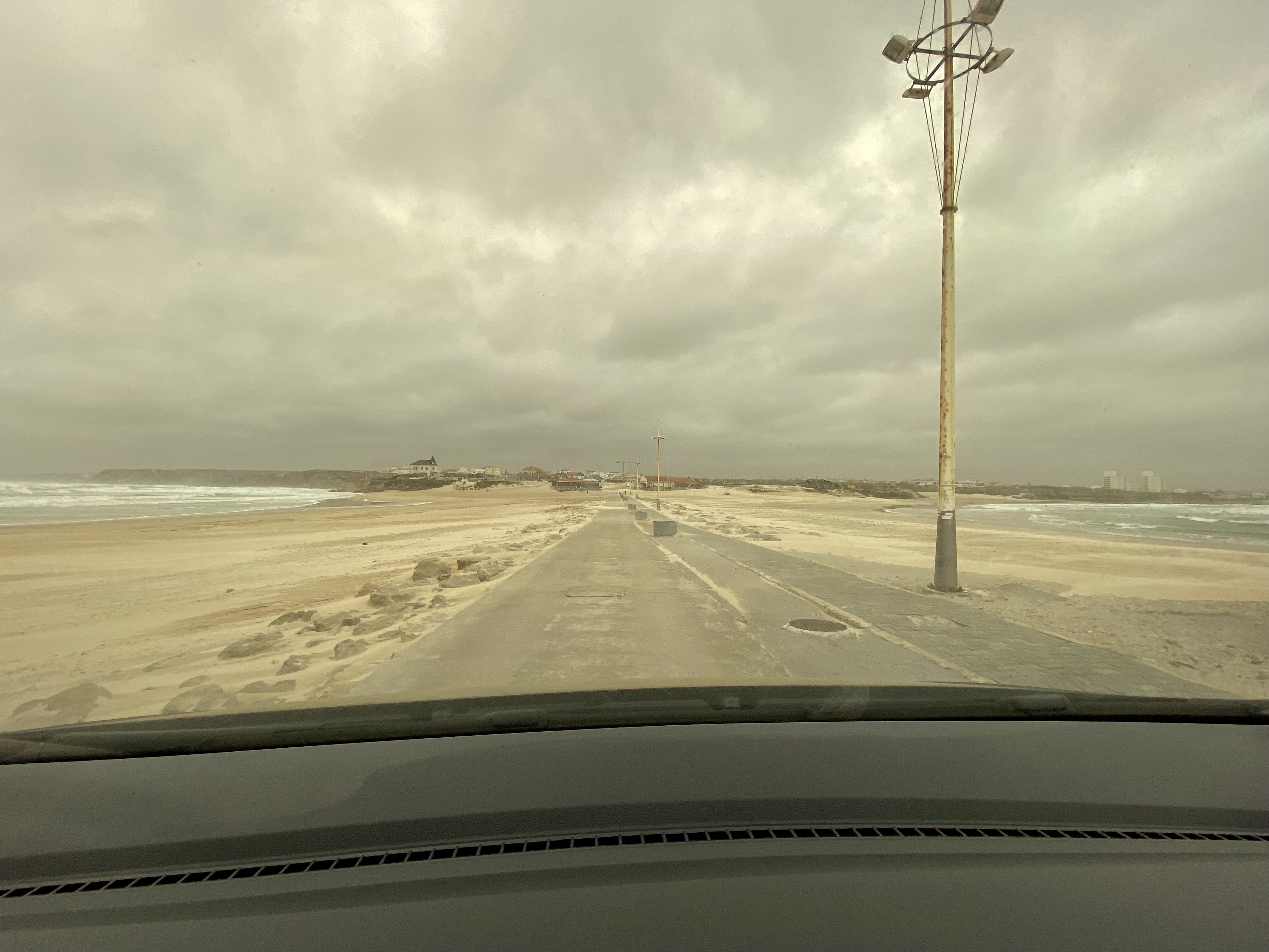 Última parada da viagem foi em Baleal – outra praia famosa pro surf por lá. O que eu não sabia é que tem um estreito de areia que dá para ir de carro até a Ilha do Baleal, achei mega interessante. (Atualização: voltamos no verão e é uma praia bem cheia, com areia batida e estrutura). Uma estradinha de uma pista só com praia dos dois lados. Essa parte da ilha é super bonitinha também e fomos até a ponta aonde fica a Capela de Santo Estevão. De lá dá para ver vestígios do forte e me surpreendi com o formato das pedras, pareciam um navio afundado. Curti bastante Peniche e sem dúvidas voltarei!! Ah, as fotos estão meio amarelas porque esse vento que rolou trouxe areia do Deserto do Sahara para Portugal…