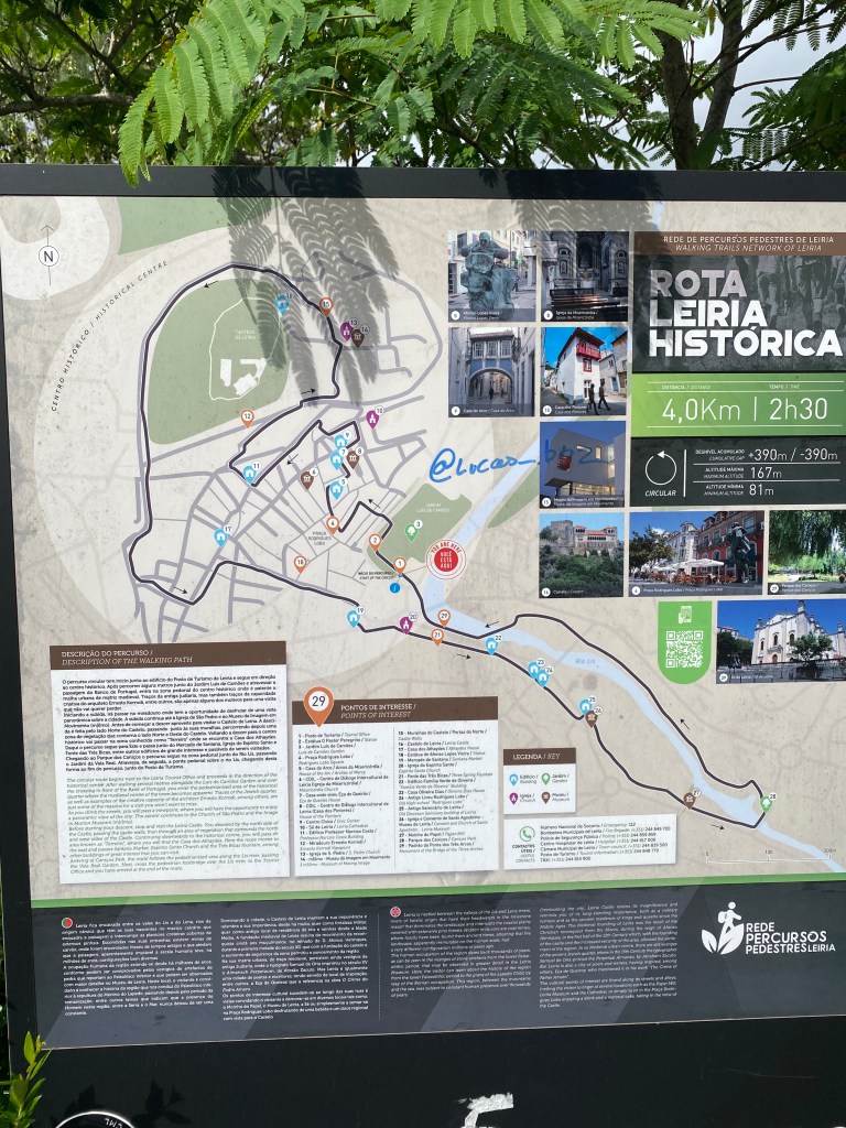 Descemos então até a Catedral da Sé e passamos pelo Largo Cónego Maia no caminho para o Jardim Luís de Camões que estava todo florido e é um lugar agradável para relaxar. Ali fica o Centro de Turismo e tirei foto dessa opção de roteiro para conhecer Leiria. Um pouco mais a frente tem a Fonte Luminosa e o letreiro da cidade e o Mercado de Sant’Ana que é utilizado como Centro Cultural da cidade.