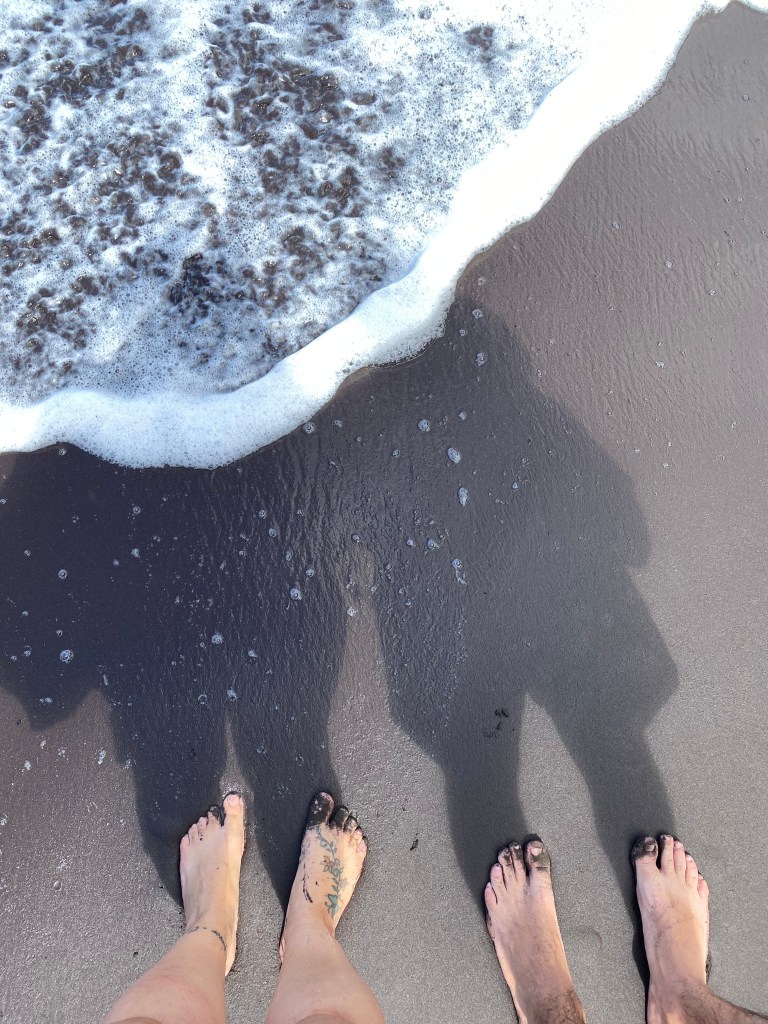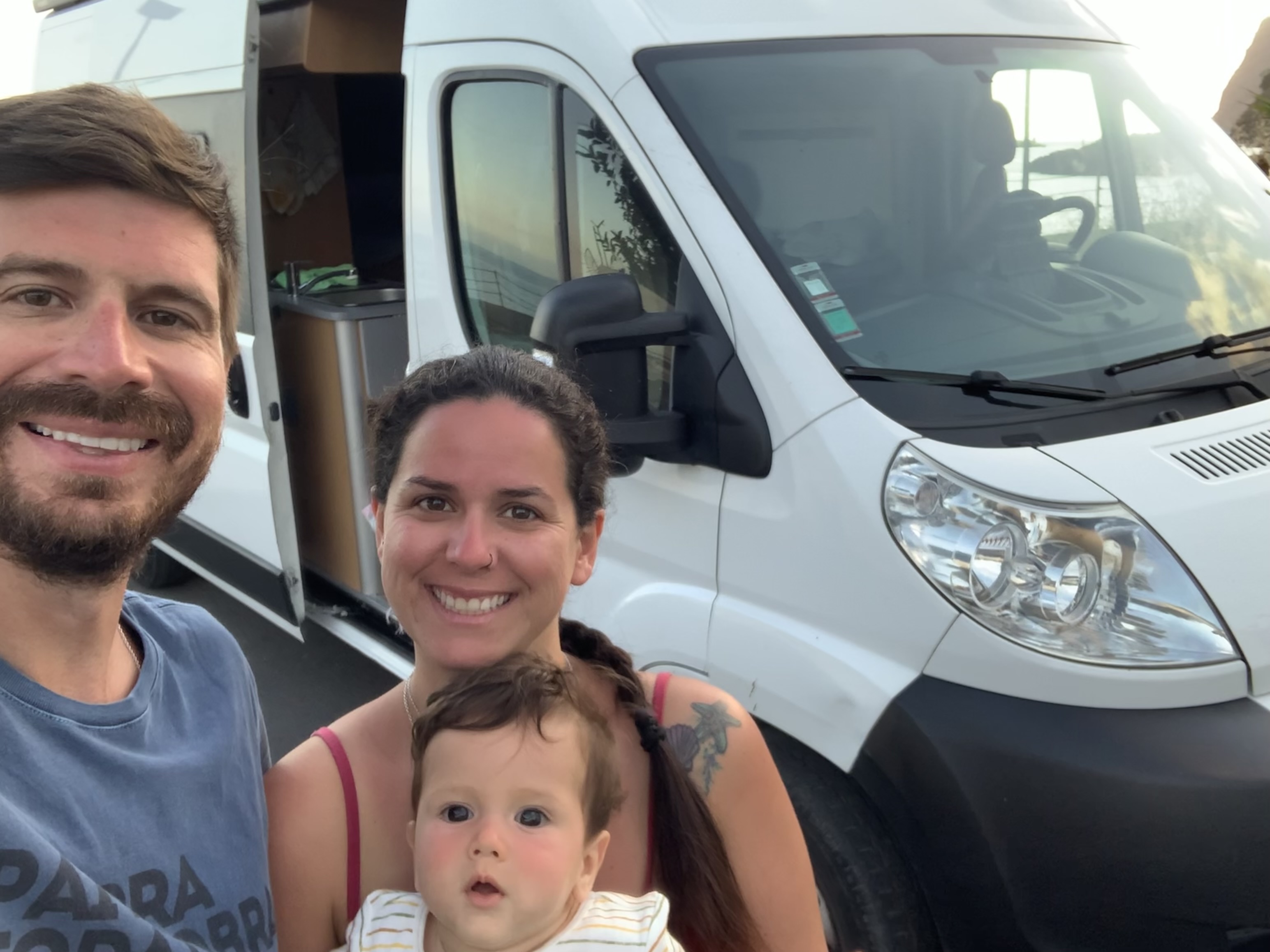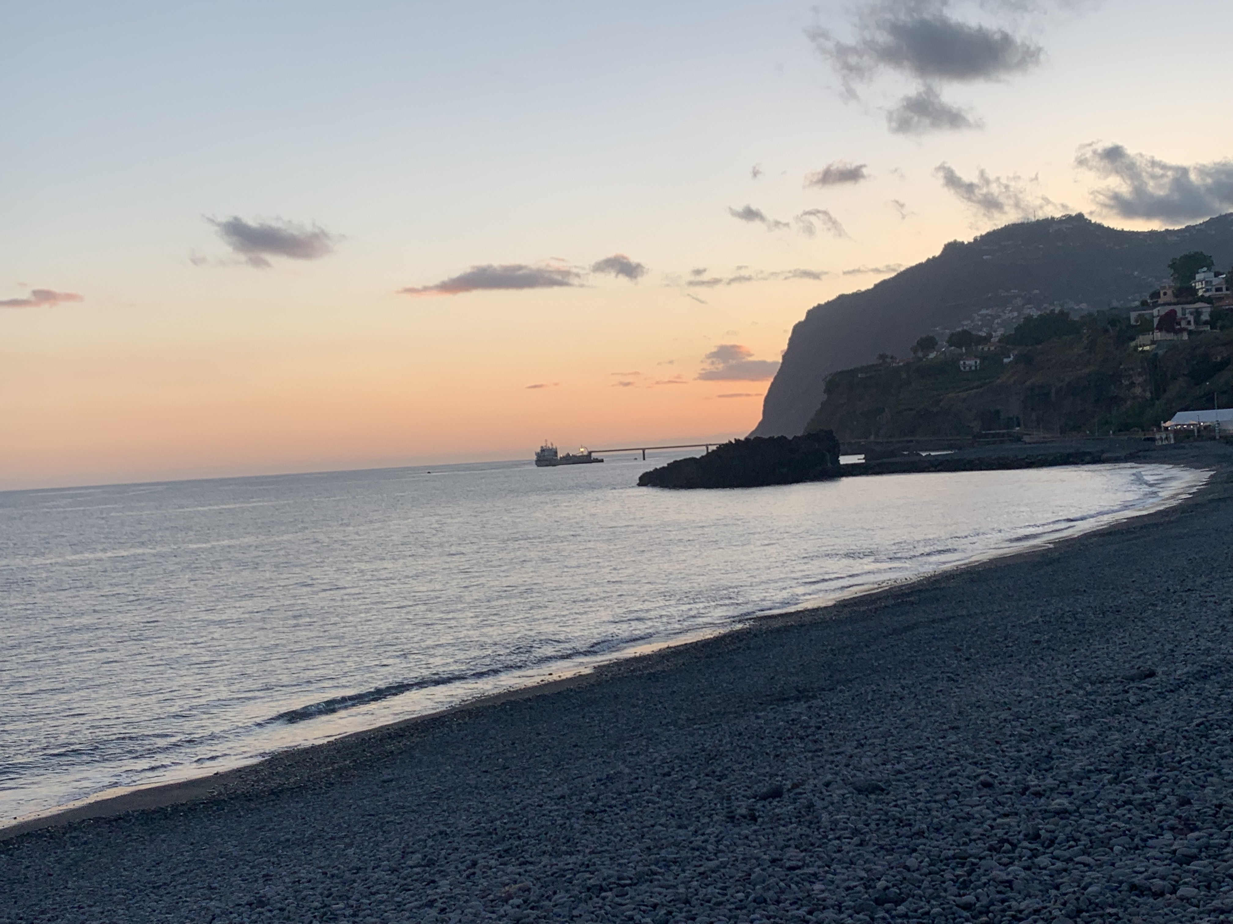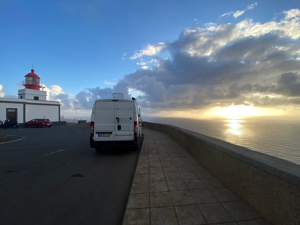 Já no fim de tarde, abastecemos e fomos até São Martinho na Praia Formosa para dormir. A praia é de pedra e o sol não se põe lá mas mesmo assim foi um fim de tarde bem bonito. Enquanto eu fazia o Thomas dormir no sling, o Vini fazia o jantar e arrumava as coisas pois no dia seguinte já iríamos embora. De madrugada chegou um pessoal com música alta e aí acabamos indo para a outra ponta do estacionamento.