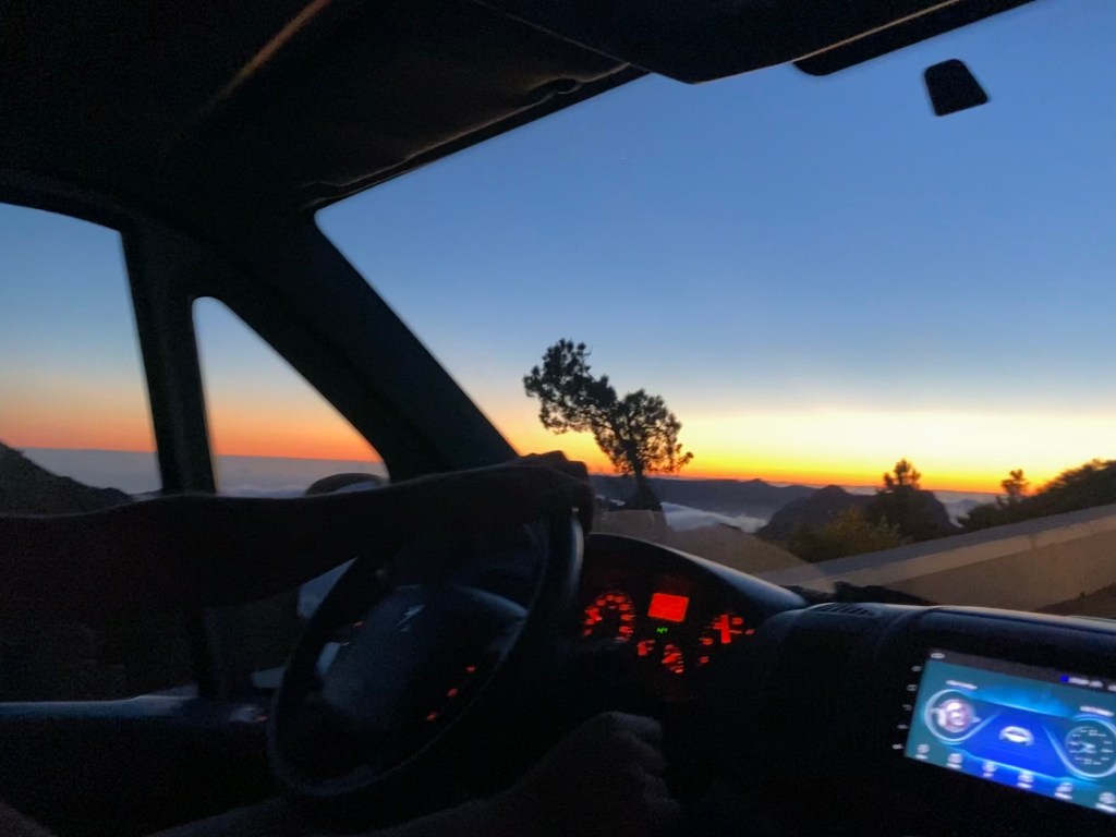 A estrada é bem sinuosa e muito bonita, chegamos assim que o sol se pôs e o céu estava muito colorido. Fomos até o estacionamento do pico porém ele é bem íngrime e não dava para dormir, paramos numa entradinha do lado e estava bem frio e um ventoooooo. A noite o céu ficou super estrelado.