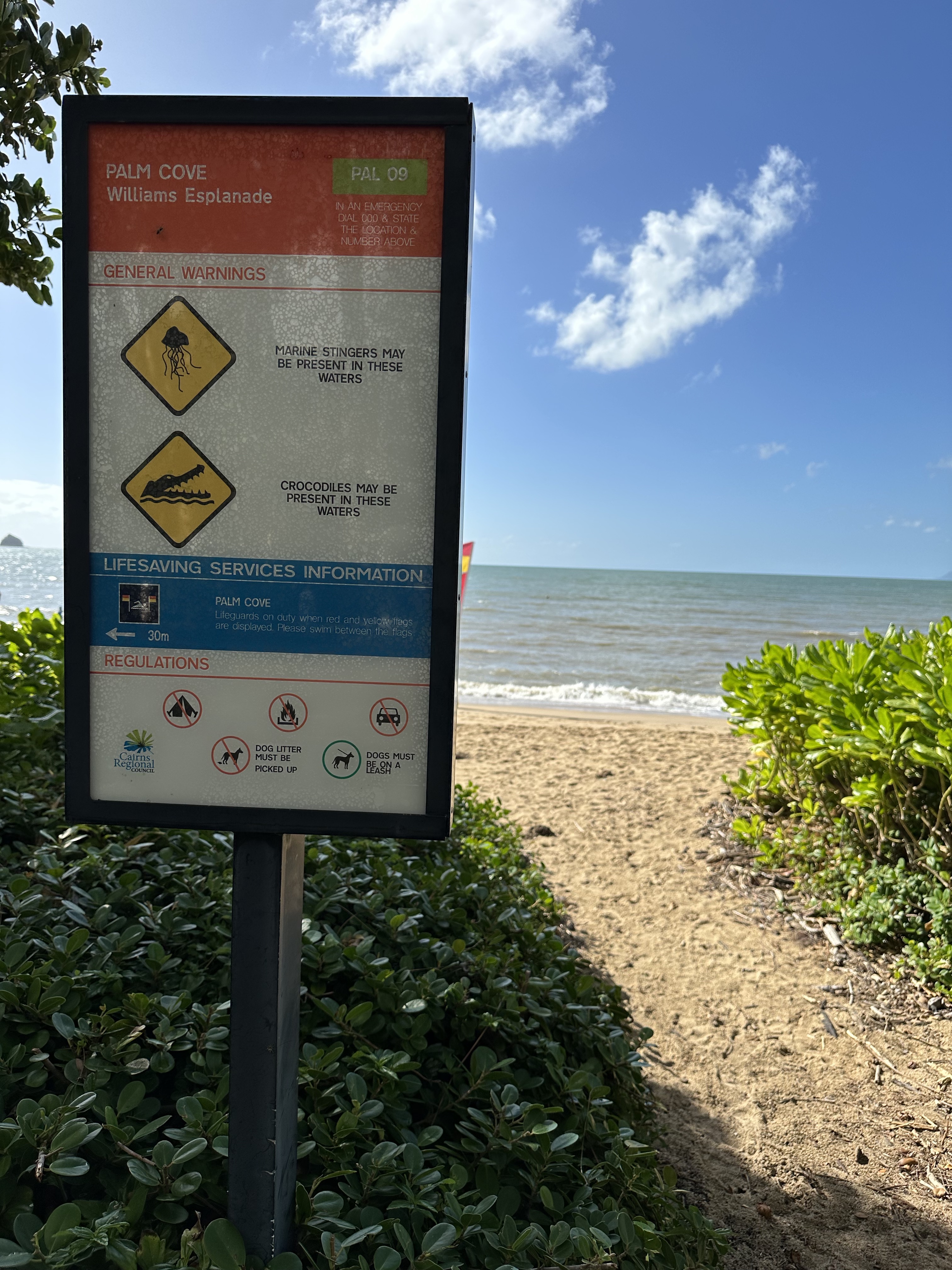 Acordamos cedo e tomamos café da manhã no hotel mesmo (não incluso) antes de seguir para Port Douglas. No caminho paramos na Palm Cove Beach, uma praia que não achei nada demais mas tem vários restaurantes. As praias da região, acredito eu, não são de águas claras (pelo menos estavam bem escuras e amarronzadas quando fomos) além do fato de em diversas épocas do ano ter água viva e poder ter crocodilo, isso mesmo que você leu, crocodilos no mar.
