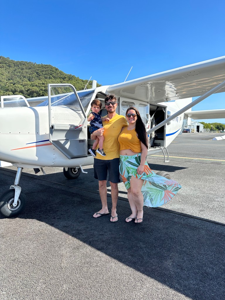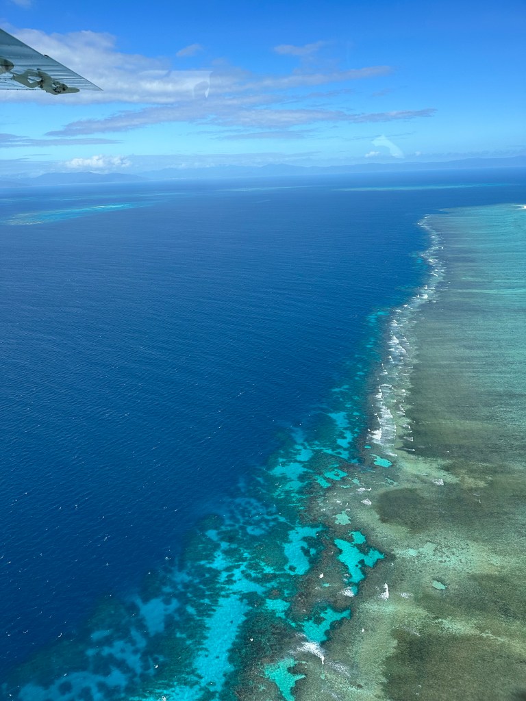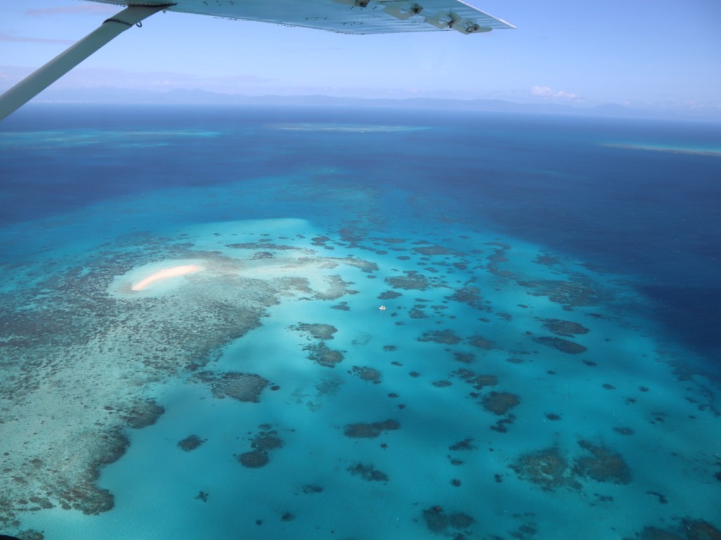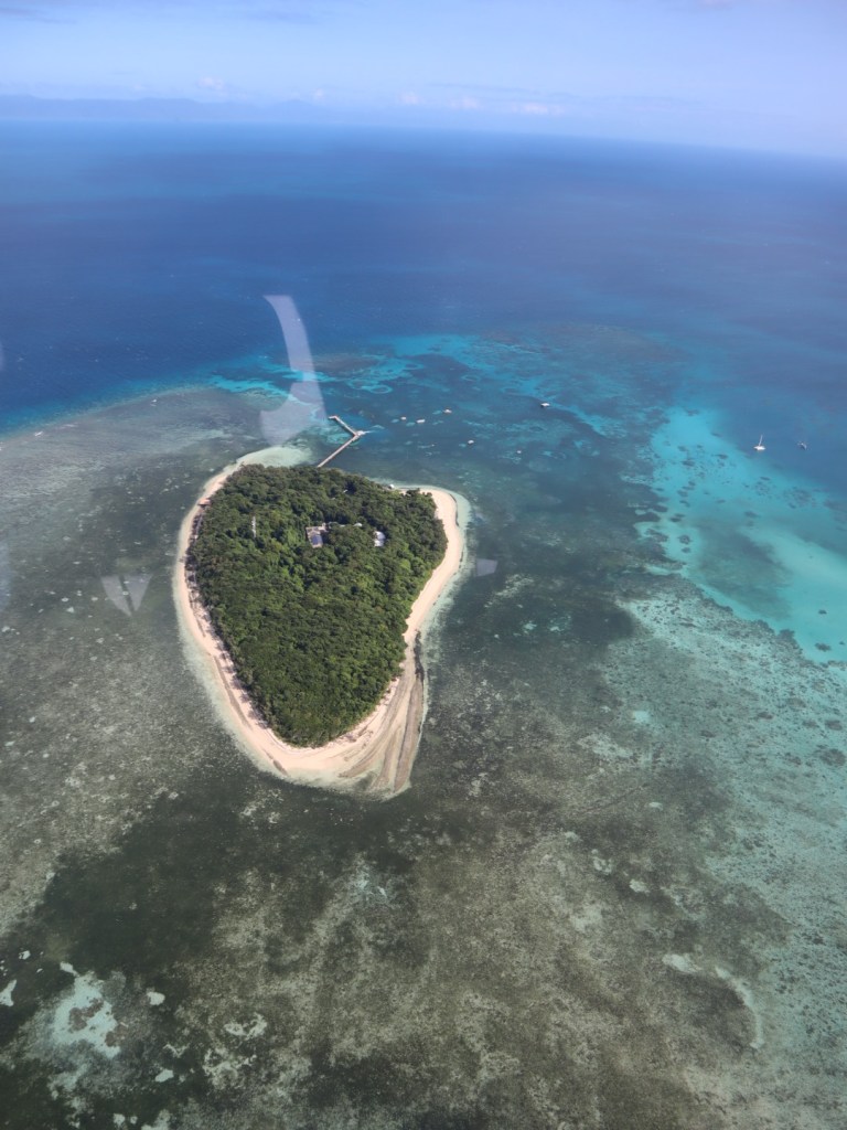 Acordamos cedo e fizemos nosso café da manhã no quarto mesmo – tinha frigobar o que ajudou bastante. Tem duas opções principais para ver a Great Barrier Reef: passeio de barco com mergulho/snorkel ou sobrevoá-la. Como para nós com filho pequeno, mergulho/snorkel não seria tão legal pois não daria para ser em algo em família, optamos pelo passeio de avião de 40 minutos com a Daintree Air Services ($358 para nós 2 pois o Thomas não paga). Vai uns 10 minutos para ir e mais 10 para voltar então sobrevoando mesmo a barreira de corais são uns 20 minutos mas vale super a pena, é surreal de lindo – inacreditável. Tons de azul indescritíveis, bancos de areia no meio do nada, corais incríveis. Começamos sobrevoando a Green Island, uma das 90 ilhas na Great Barrier Reef – sem palavras, apenas façam esse passeio.