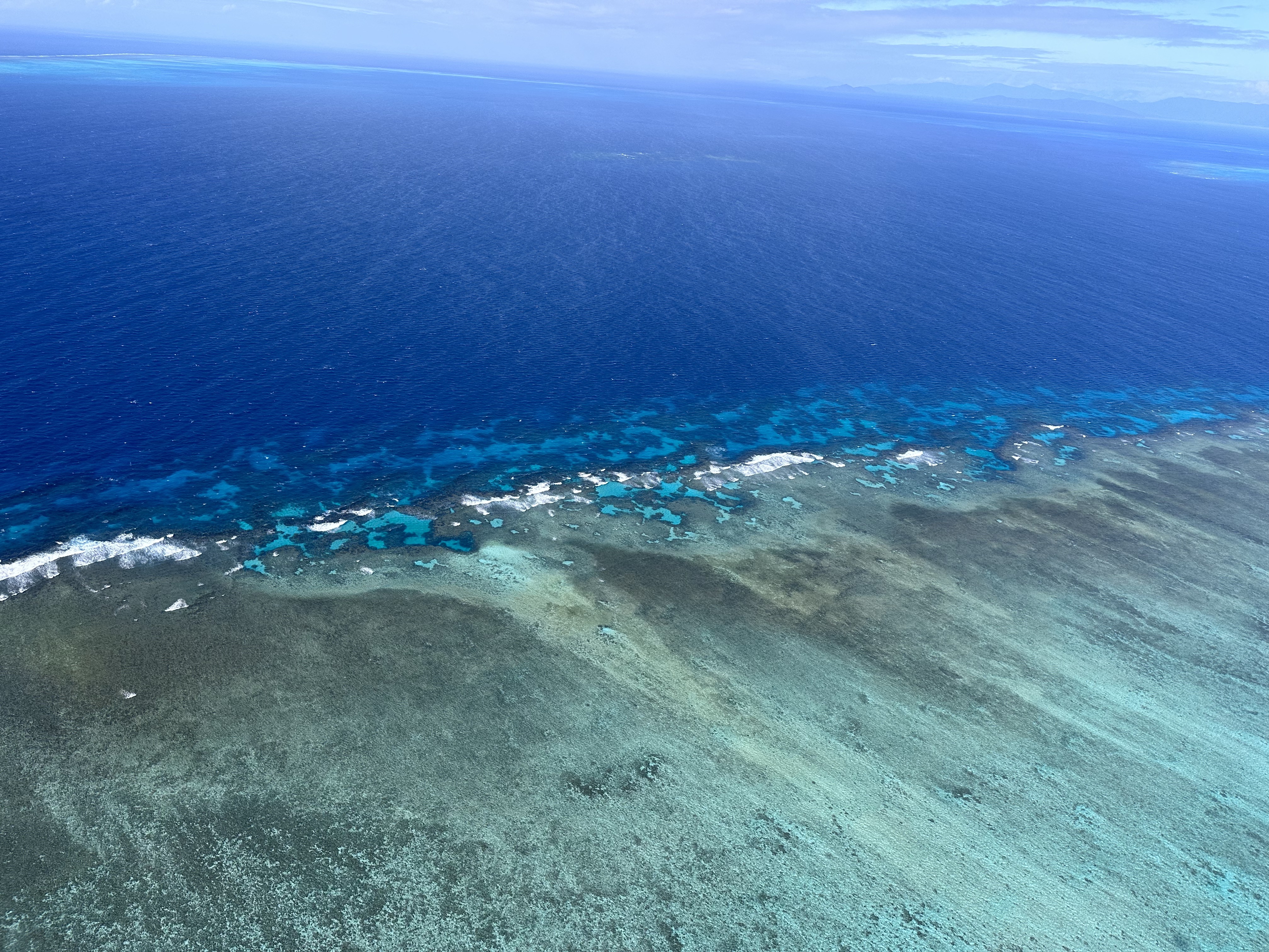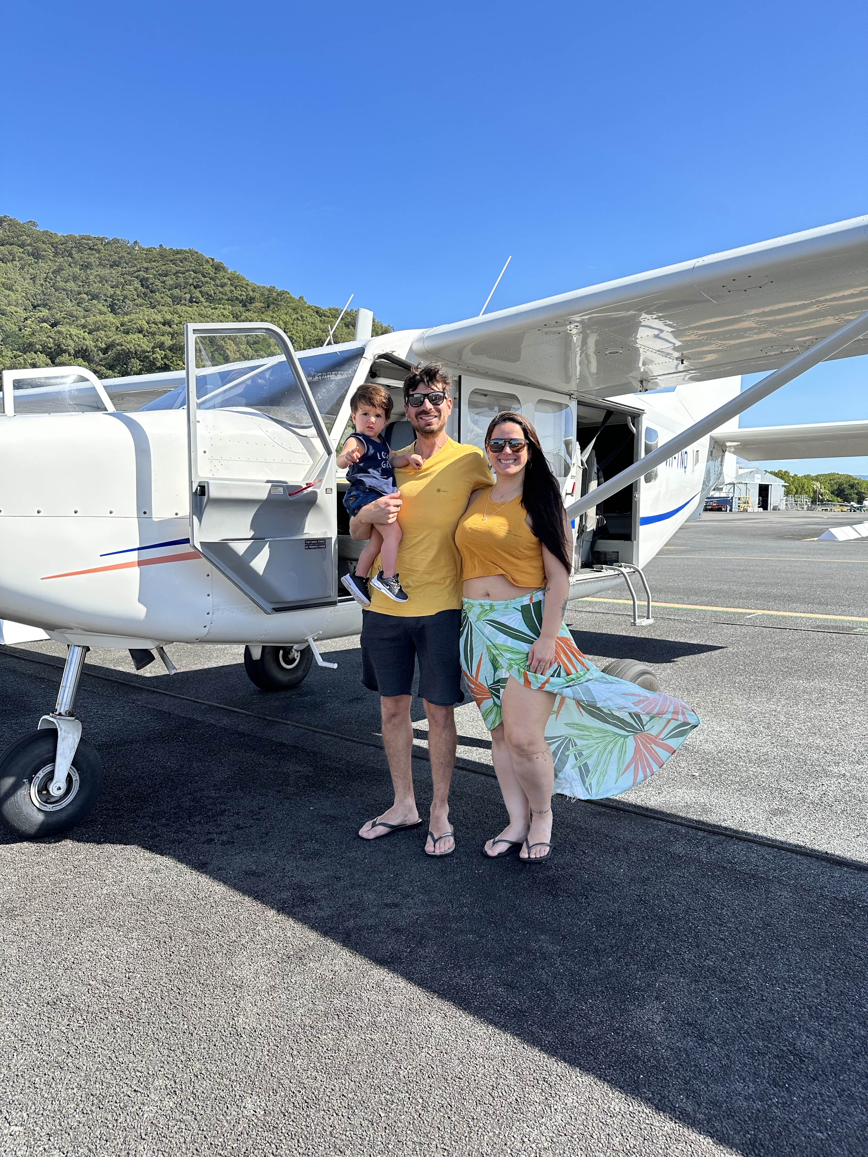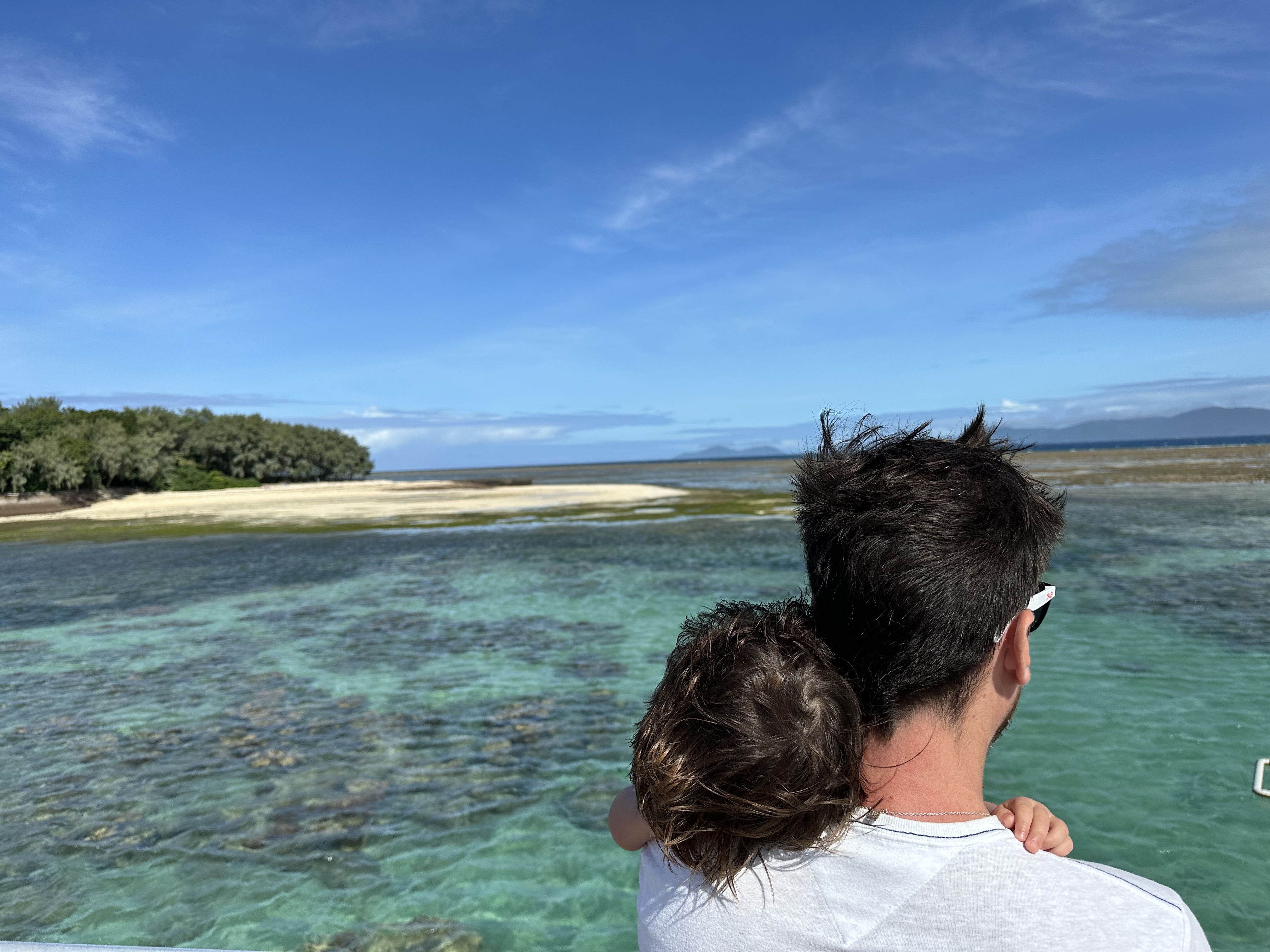 Acordamos cedo e fizemos nosso café da manhã no quarto mesmo – tinha frigobar o que ajudou bastante. Tem duas opções principais para ver a Great Barrier Reef: passeio de barco com mergulho/snorkel ou sobrevoá-la. Como para nós com filho pequeno, mergulho/snorkel não seria tão legal pois não daria para ser em algo em família, optamos pelo passeio de avião de 40 minutos com a Daintree Air Services ($358 para nós 2 pois o Thomas não paga). Vai uns 10 minutos para ir e mais 10 para voltar então sobrevoando mesmo a barreira de corais são uns 20 minutos mas vale super a pena, é surreal de lindo – inacreditável. Tons de azul indescritíveis, bancos de areia no meio do nada, corais incríveis. Começamos sobrevoando a Green Island, uma das 90 ilhas na Great Barrier Reef – sem palavras, apenas façam esse passeio.