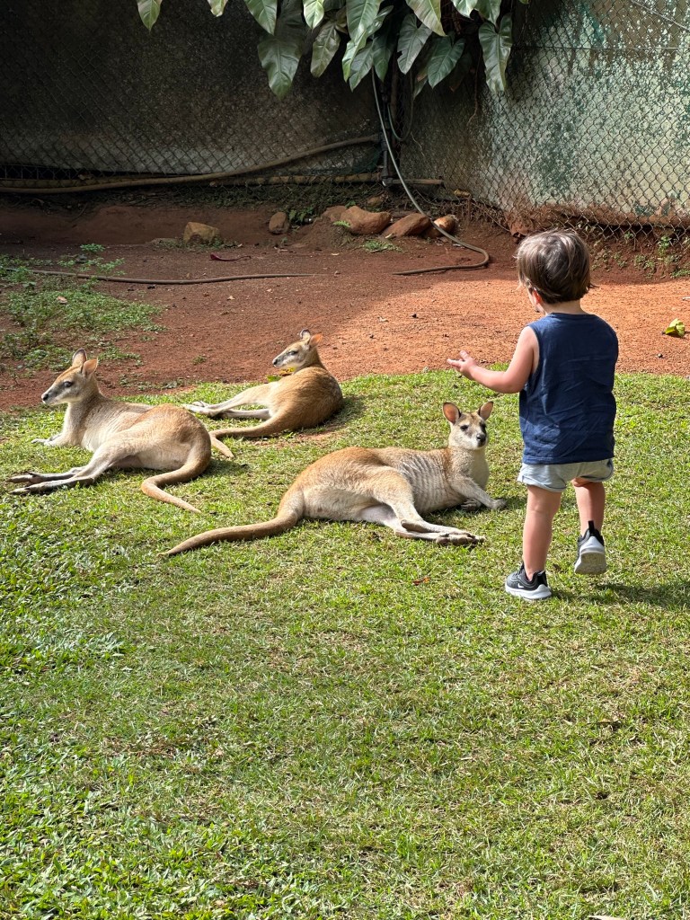 Depois do almoço, optamos por passar a tarde em Kuranda que fica cerca de meia hora de Cairns. No caminho paramos no Rainsforestation Nature Park para o Thomas ver os bichinhos – mas não vale os $17 para entrar e então seguimos para a vila. Como já eram umas 3 da tarde estava tudo fechado, portanto vão cedo. O mais comum é o pessoal fazer o passeio para ir de Skyrail Rainforest Cableway (teleférico) até lá em cima e voltar para Cairns com o Kuranda Scenic Railway (trem) porém custa mais de $100 por pessoa e infelizmente não ia rolar.