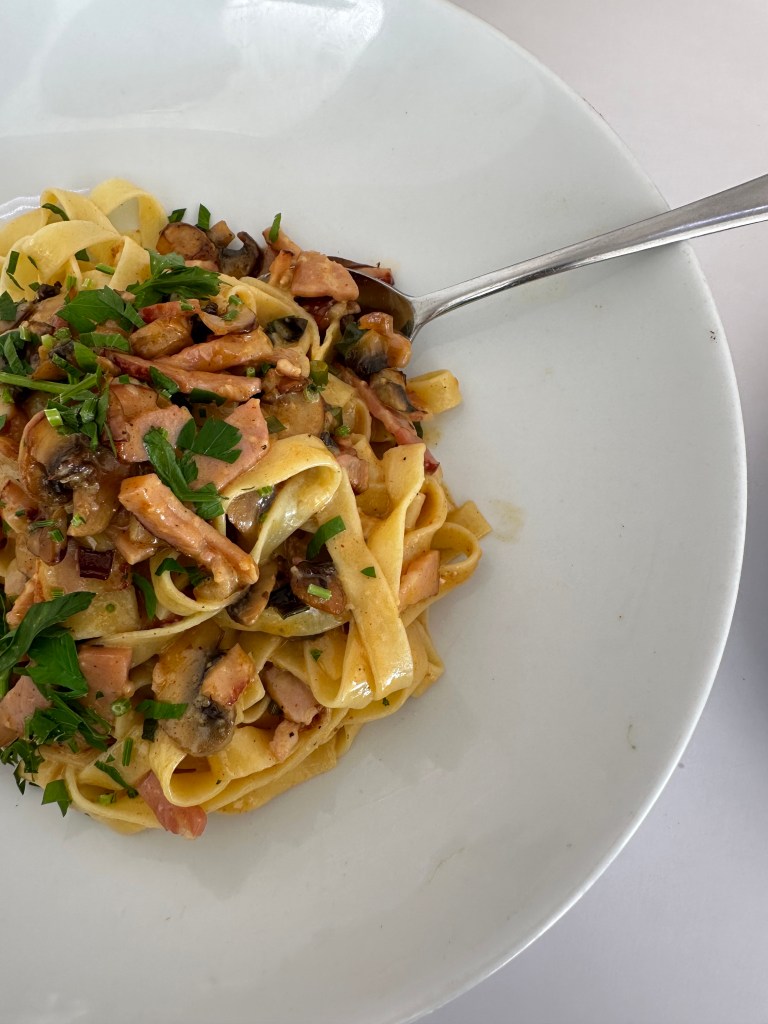 Na volta, como a correnteza do lago estava meio forte, deu para eu ir boiando até aonde estávamos, mega relaxante. Na hora do almoço, esvaziou bem e ficamos mais um pouco até a fome bater. Como a cidade é bem pequenininha, tivemos que andar mais 20 minutinhos até Ulladulla para almoçar. Comemos no Carlo´s Italian Ristorante Bar and Seafood – que delícia!!! Pedi um Fettuccine Boscaiola e meu noivo um Fettuccine Carbonara, perfeitos, recomendo.