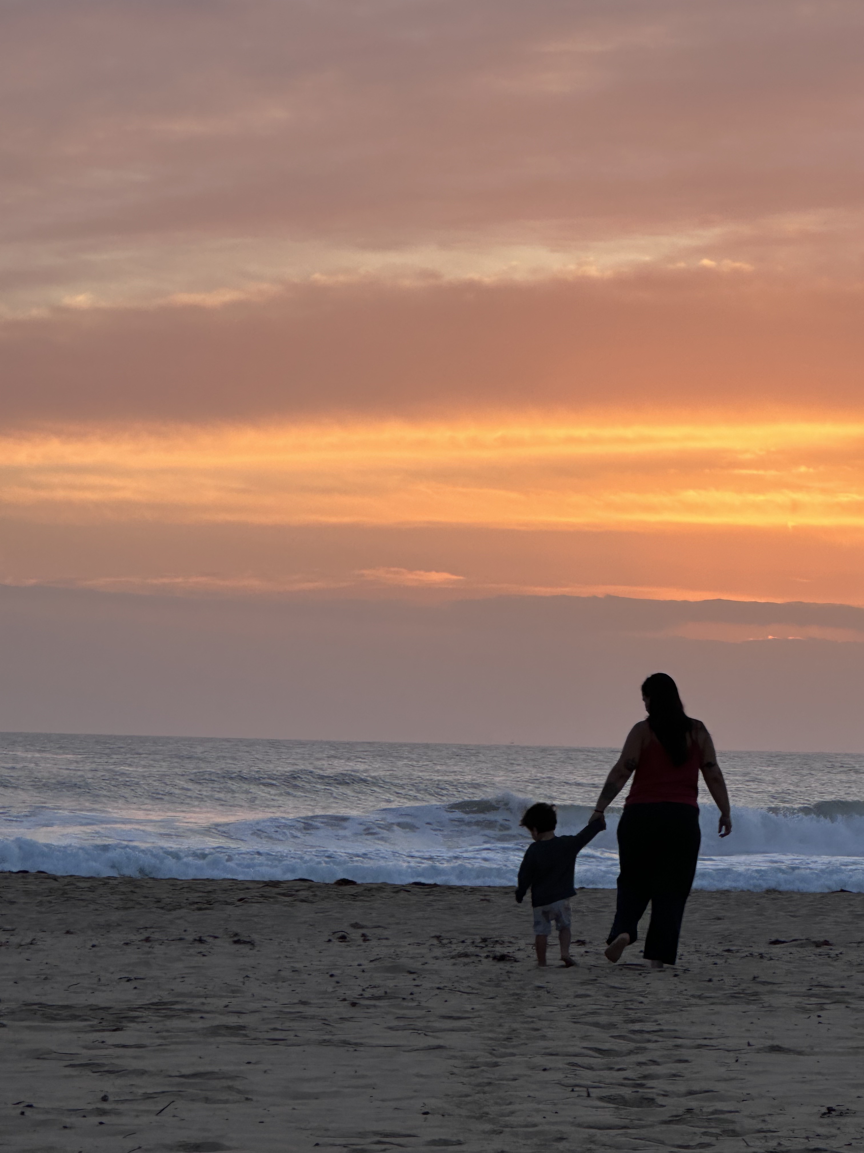 6 da manhã já estávamos de pé e desmontando acampamento – e que nascer do sol! Tomamos café da manhã ali na praia com frutas e pãezinhos que tínhamos levado. Depois caminhamos pela praia até o canto direito dela e achamos uma parte que era tranquila de entrar pois a Jones Beach é uma praia bem extensa e o mar um pouco forte para criança.