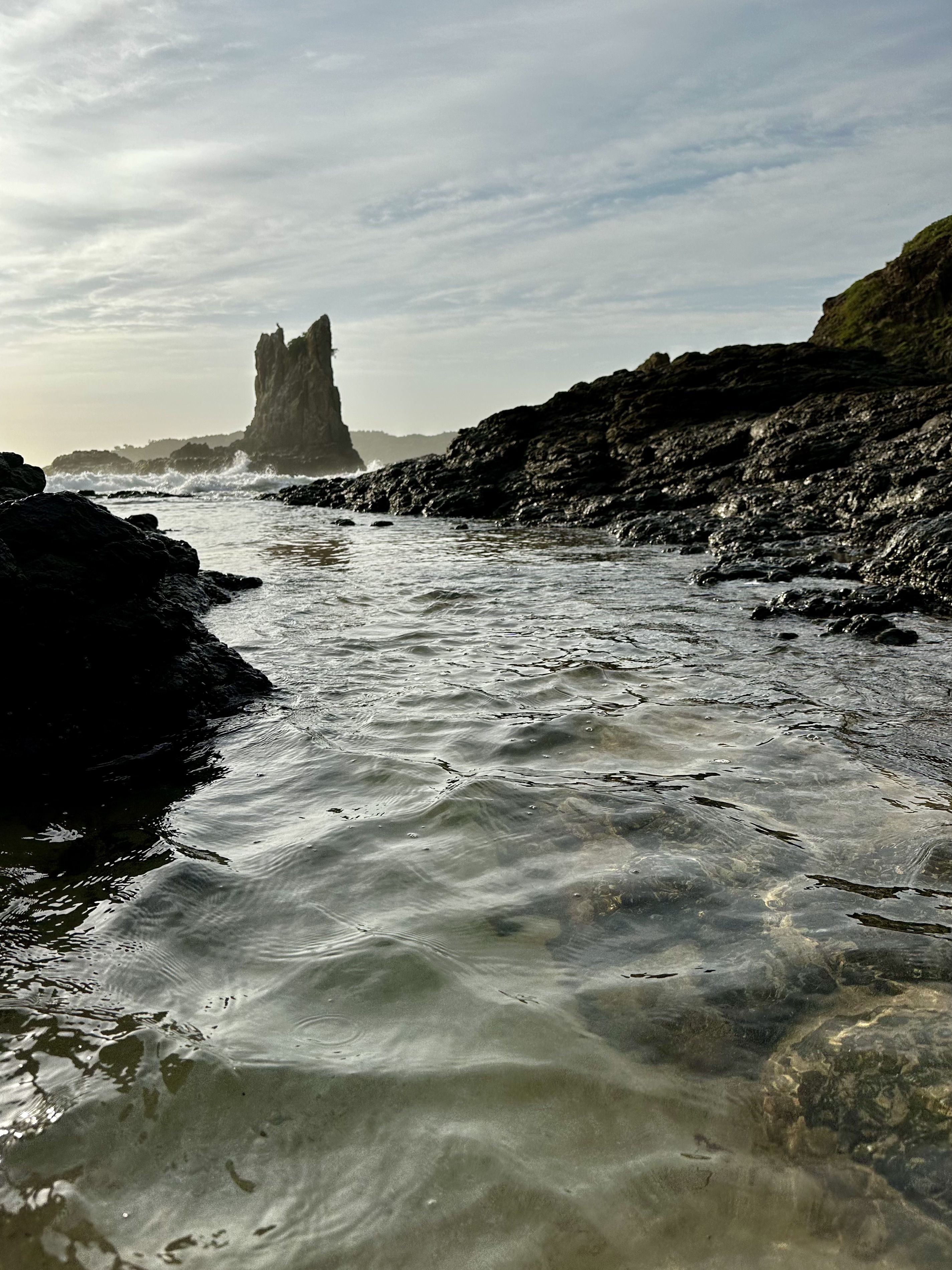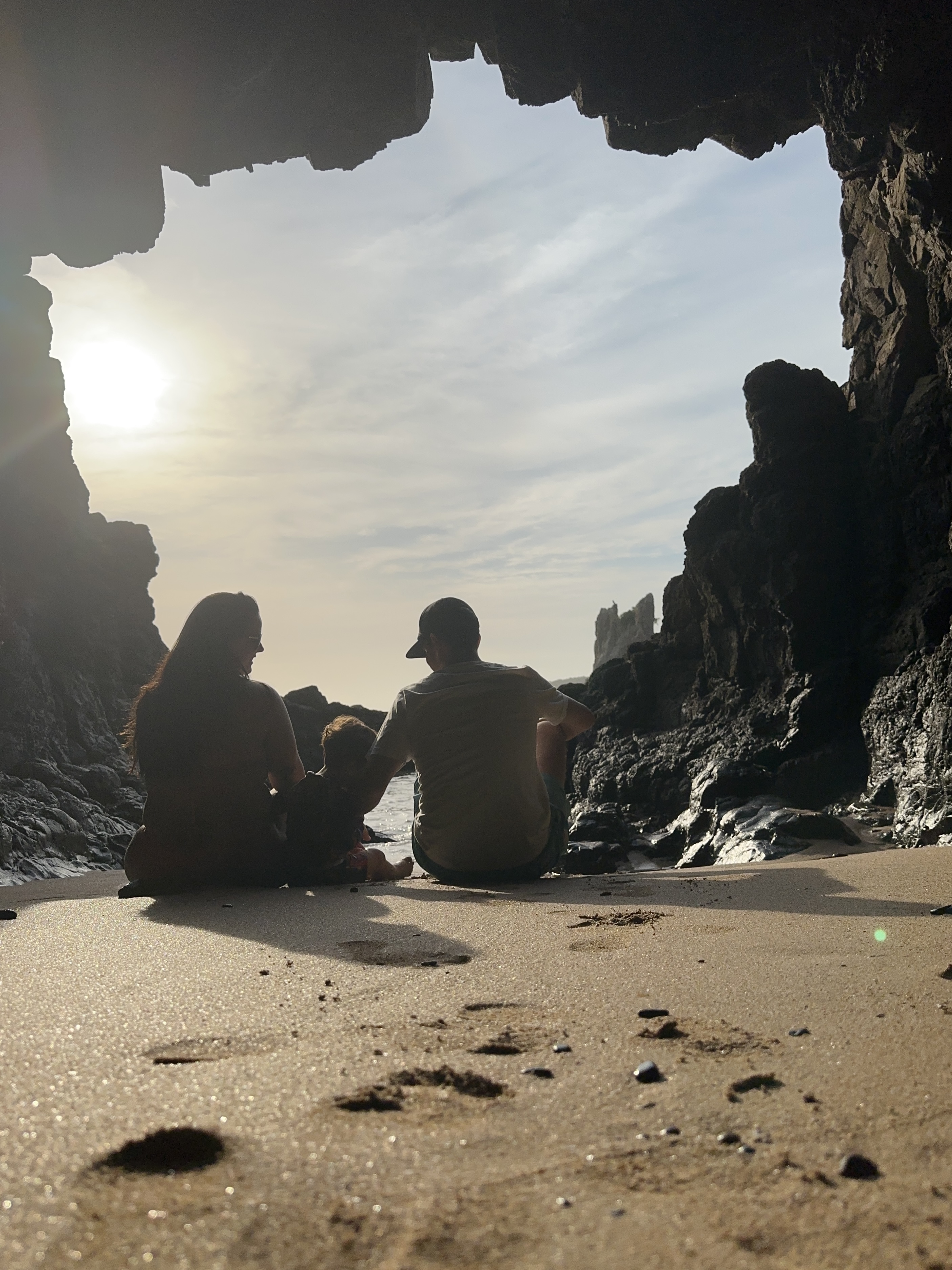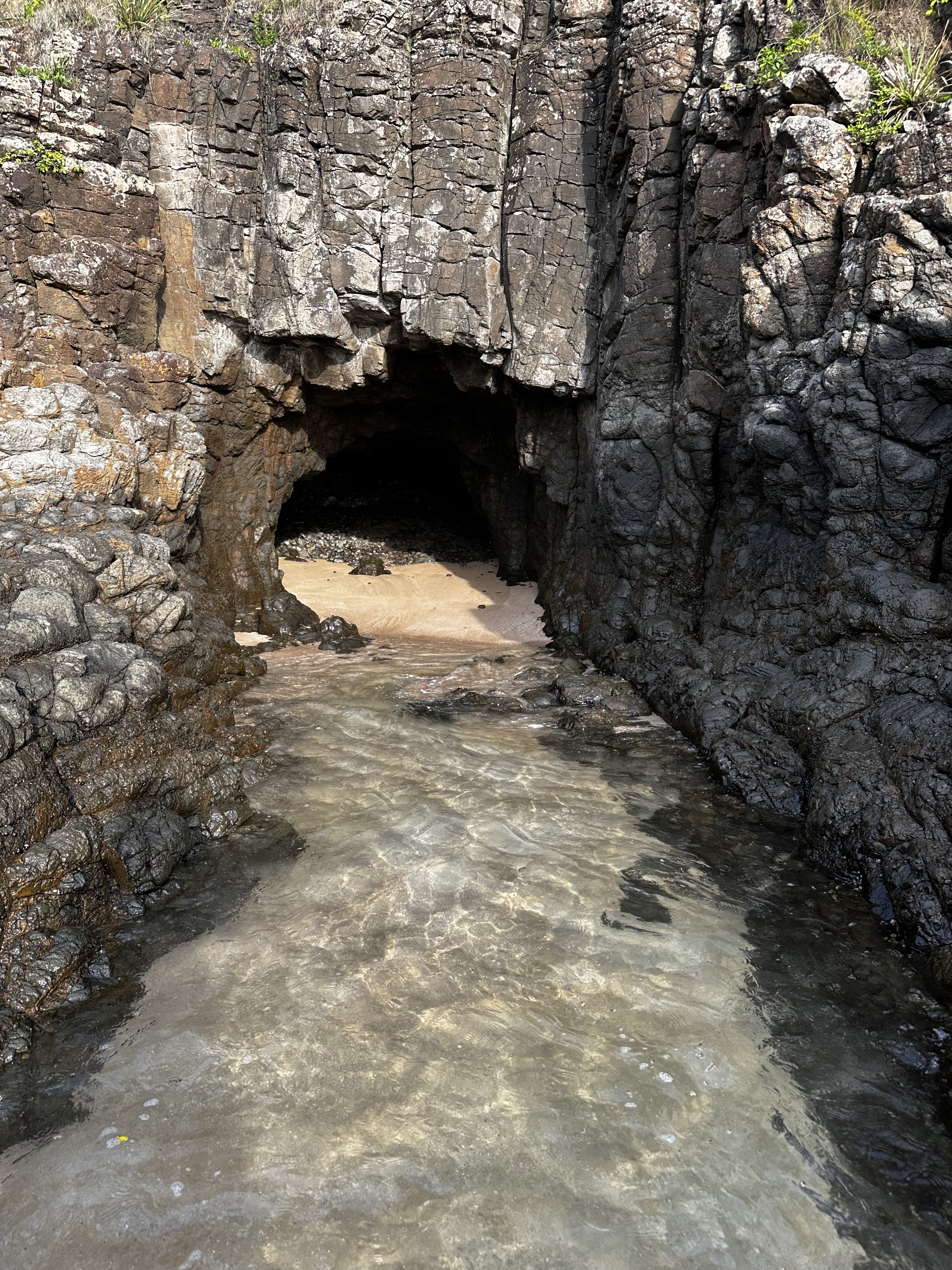Ficamos ali curtindo e depois fizemos uma mini trilha pelas pedras – as Cathedral Rocks – até uma caverna que tinha ali. Só dá para ir na maré baixa, não se arrisquem no meio das pedras – super pontudas por sinal – se o mar estiver mexido ou maré cheia. E então acabou que tínhamos uma mini praia na caverna só para nós!