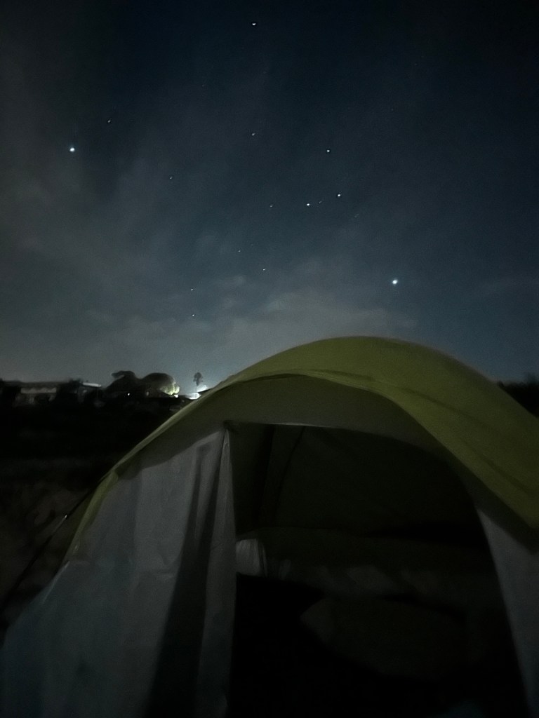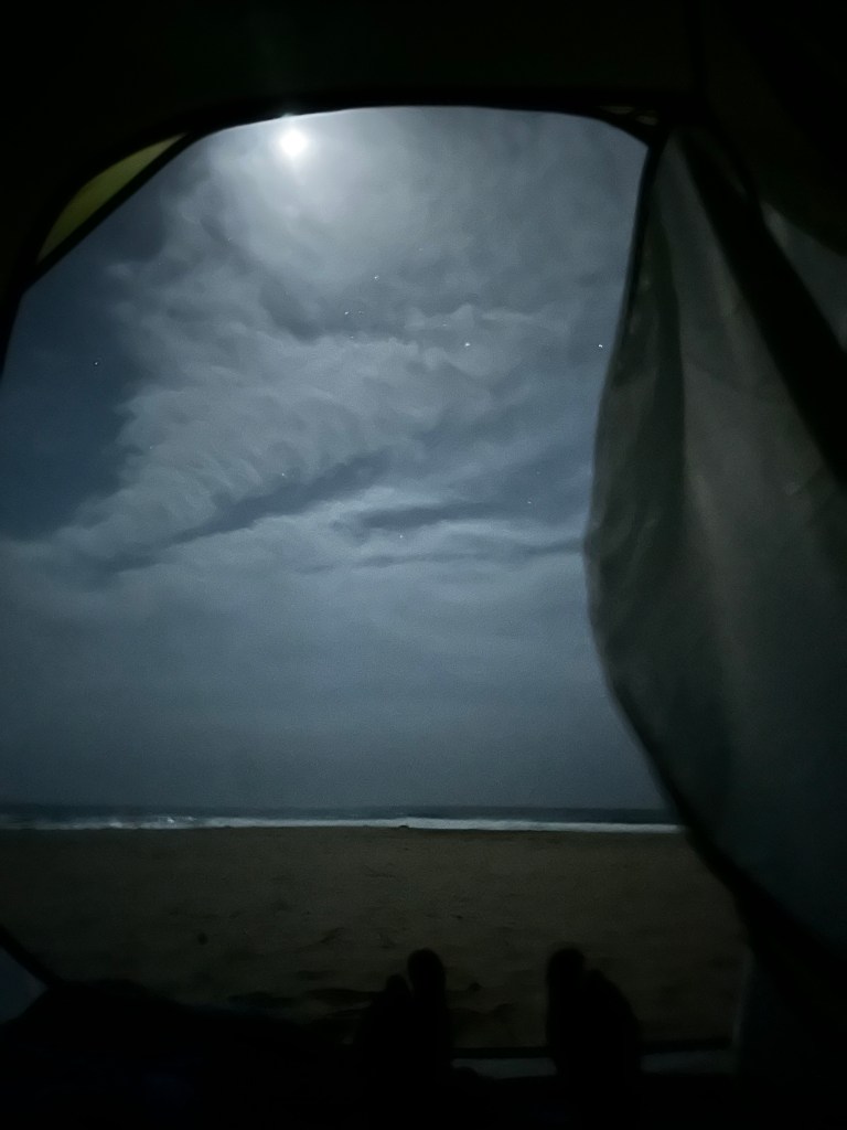 Tava ventando bastante e um pouco frio a noite, nosso filho demorou mais do que o costume para dormir. Acordei umas 4 da manhã e resolvi abrir a barraca – lembrei que era noite de lua cheia, que vibe boa dormir assim olhando o mar, a lua e as estrelas (é tudo muito lindo, o som do mar….) hehe.
