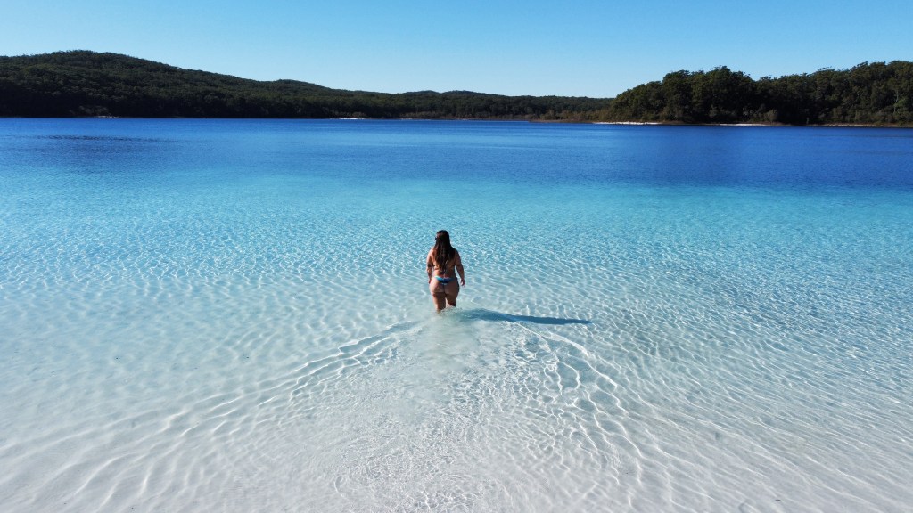 Nossa balsa de volta era inicialmente as 7:50 da manhã mas mudamos para 11:30 porque esse seria o dia mais ensolarado da viagem e queríamos ver a principal atração – o Lake McKenzie – no seu melhor dia e valeu super a pena. Fizemos check out do hotel e meia horinha estávamos no lago – de novo, só nosso. A ilha estava bem vazia no geral, provavelmente por ser inverno e também uma semana antes de um feriado.