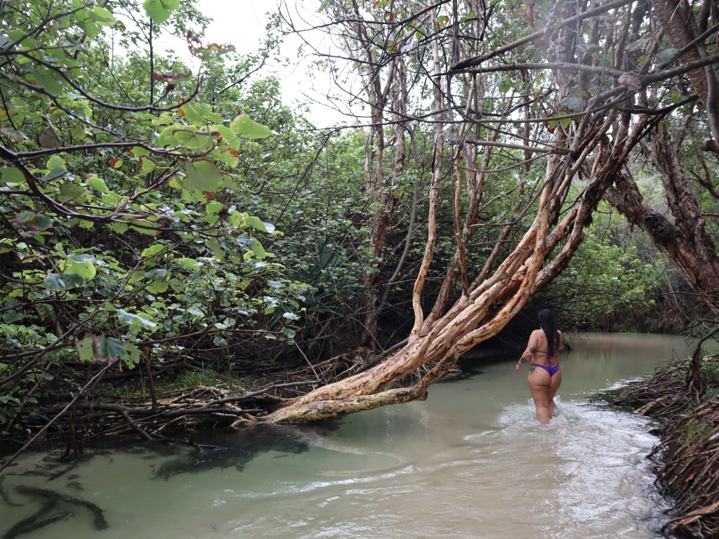 O tempo estava meio nublado mas mesmo assim decidimos entrar nessa água verdinha – e que não estava gelada! O pessoal costuma levar aquelas bóias e descer o rio mas nós não tínhamos e ficamos nadando ali de boa mesmo. Ele é bem rasinho na maior parte então foi bem tranquilo. Ficamos um tempão lá só a gente até começar a chegar algumas pessoas e seguimos nosso caminho.