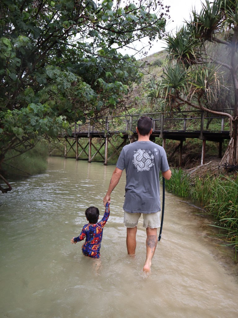 Andamos uns 25 minutos até chegar em Eli Creek e foi lá também nosso primeiro encontro com um dingo. Descemos do carro e ele veio andando tranquilamente na nossa direção – ele não tem cara de bravo, pelo contrário, parece que tá pedindo carinho mas não se deixe enganar. Vini achou um pedaço de madeira e eu peguei o Thomas no colo já que ele ama animais e achou que poderia abraçar esse também rs. Nisso chegou um carro dos Rangers da ilha meio que tocando o dingo e ele saiu de boa (escrevendo isso parece que foram os Power Rangers que salvaram o dia hahaha). Ele nos explicou que não devemos nunca correr dele ou virar as costas e sim se juntar e ficar olhando pra ele sempre com um pedaço de madeira/cano na mão por via das dúvidas. Eles costumam atacar pessoas sozinhas em trilhas principalmente e crianças pequenas que estejam longe dos cuidadores por isso era sempre bom ficar alerta.