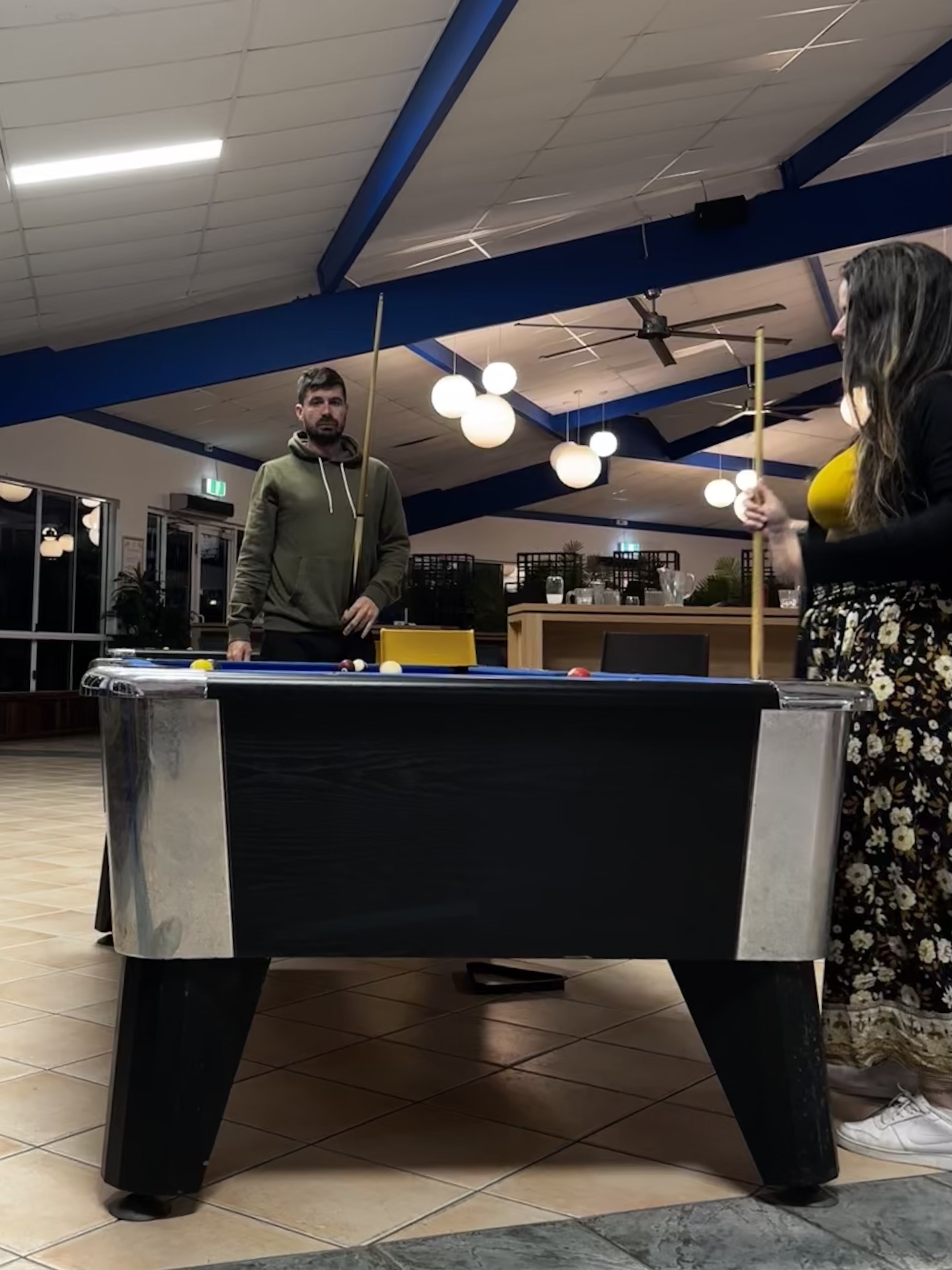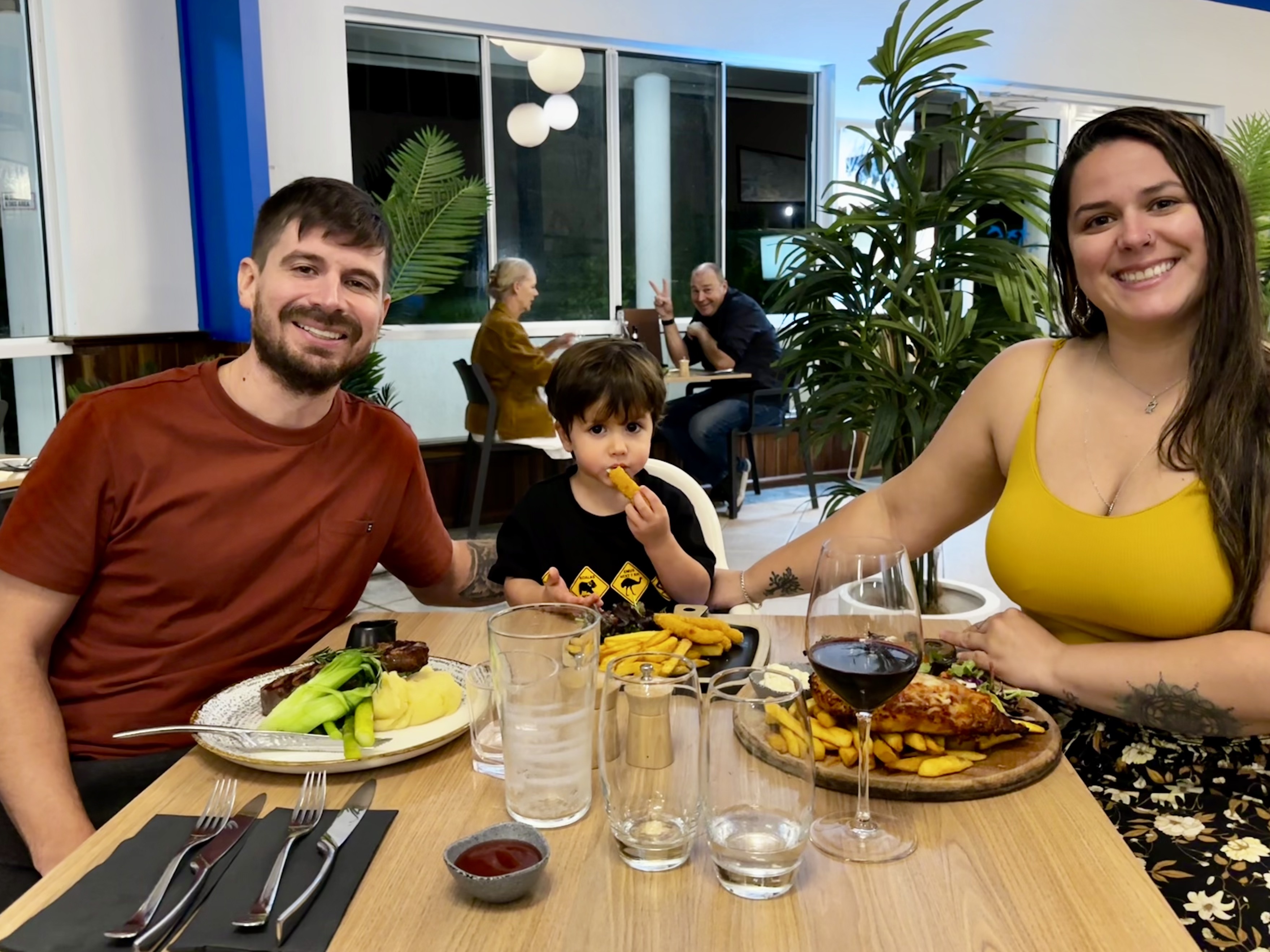 Como esse era o dia do nosso sétimo aniversário de namoro, “saímos” (hahaha) em família pra jantar no restaurante do hotel mas dessa vez a la carte e foi a primeira vez que gostamos da comida. Eu pedi uma parmegiana e o Vini uma carne – aprovado! Depois colocamos o Thomas para dormir e ficamos ali jogando sinuca e tomando uma – nosso quarto era literalmente na frente do restaurante e ligamos a câmera também para ficar de olho nele. O céu estava surreal de lindo, mega estrelado – imagino para aqueles que estavam acampando na praia. Sim, tem diversos pontos de camping sem nenhuma estrutura pelo caminho todo, você precisa levar seu próprio banheiro, fogãozinho, comida lógico e também pagar uma taxa de camping. A gente não escolheu essa opção, uma por ser inverno e outra por conta dos dingos poderem mexer na comida – ou acabarem atacando a barraca, mas deve ser uma experiência e tanto!