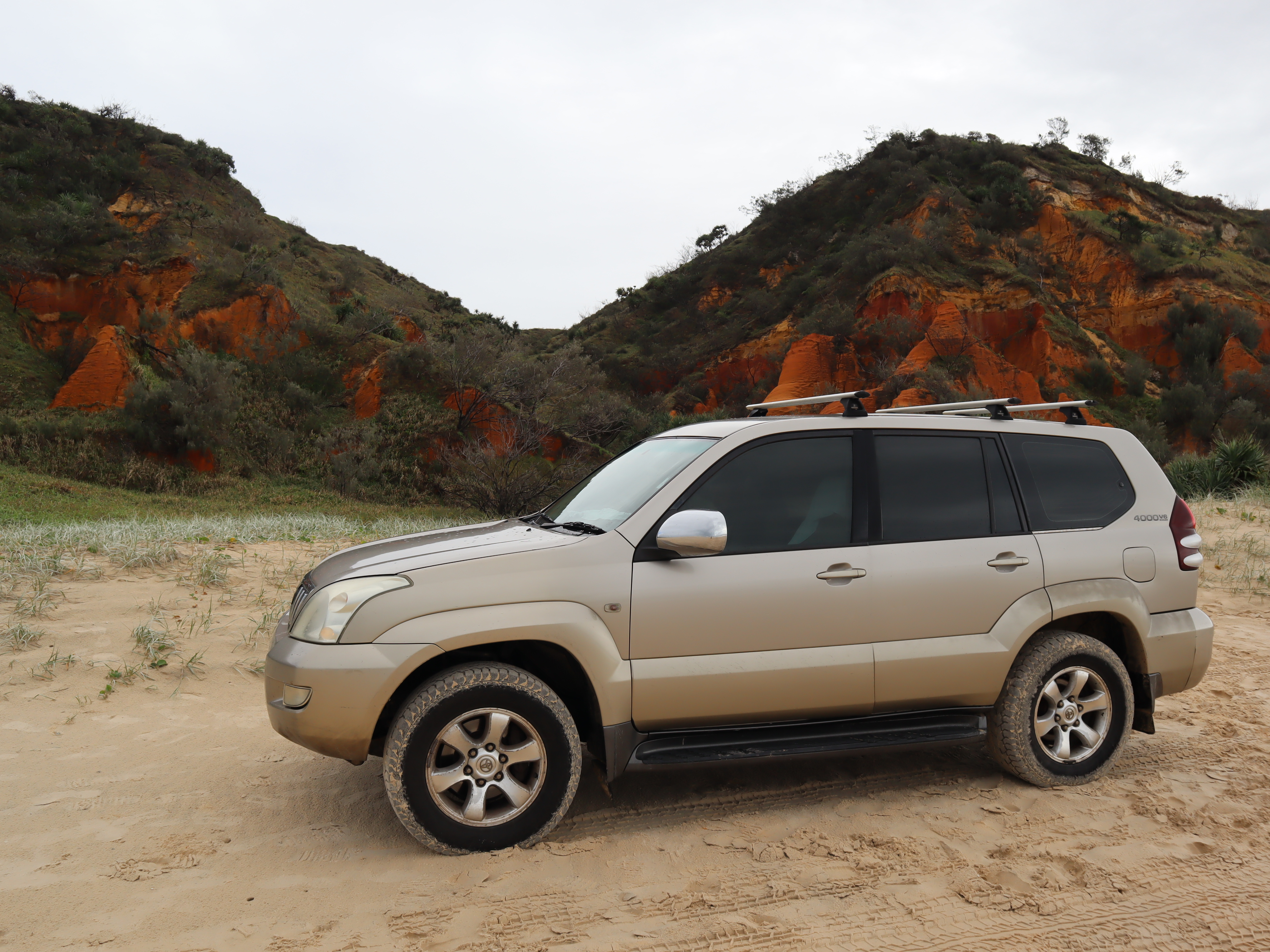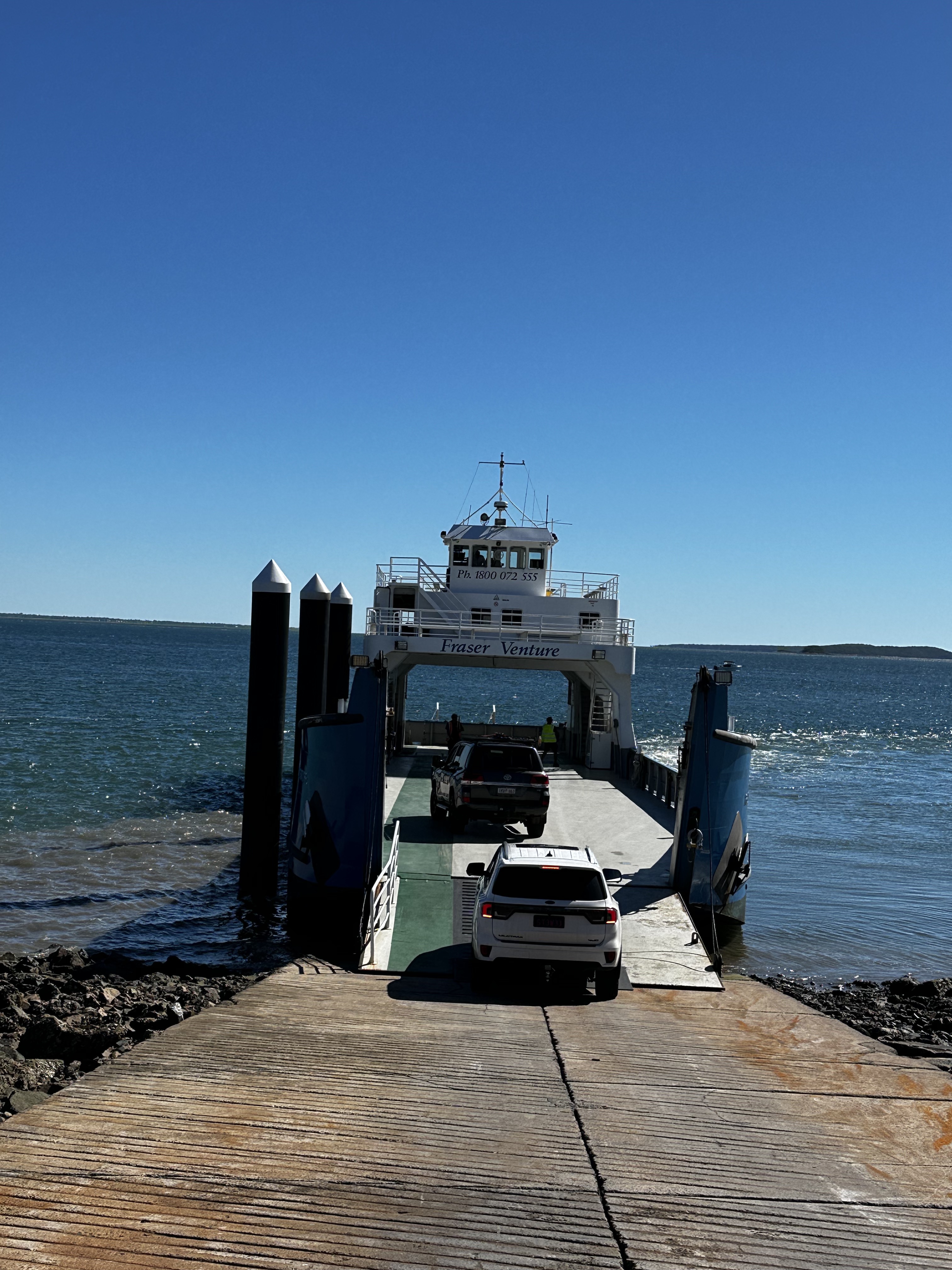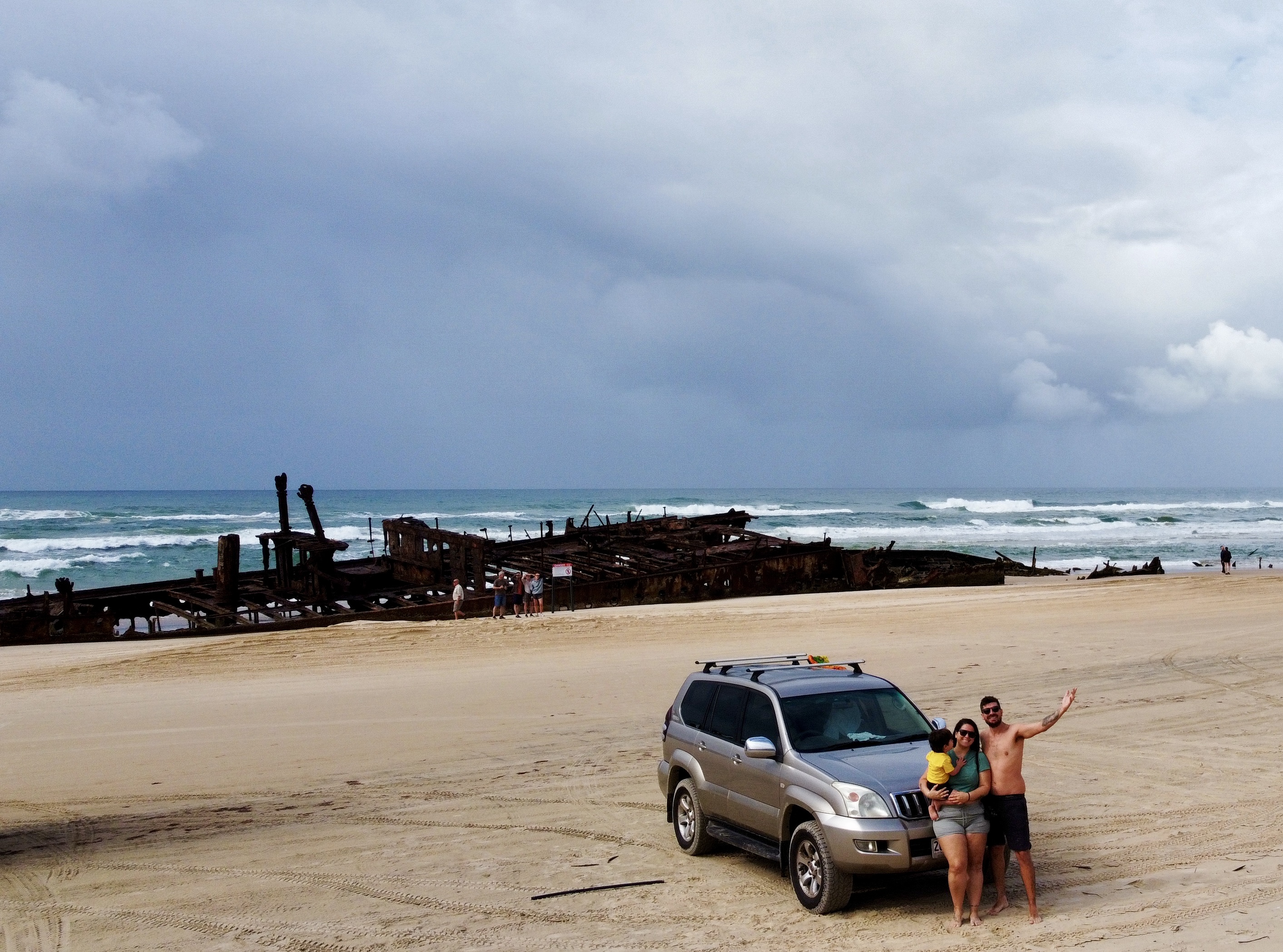 Saímos na Sexta feira com 1 hora de atraso e o vôo durou 1h45min. Na hora do embarque, recebi uma ligação da Sea Link dizendo que a balsa adiantaria meia hora, ou seja, seria correria com certeza! Avisei a locadora do carro – Safari 4WD Hire e foi tudo bem. Meu filho resolveu dormir só na hora que o avião pousou – literalmente – e meu noivo foi lá buscar o carro que ficava 5 minutos andando do aeroporto enquanto eu esperava a cadeirinha do carro sair na esteira – levamos a nossa pois é de graça pela cia aérea e custa caro para alugar na locadora de carro. Pagamos $780 o carro para 4 dias – eles cobram por pessoa e a diária não importa a hora que você pega o carro, conta o dia todo – pegamos Sexta a tarde e devolvemos na Segunda de manhã e isso foi considerado 4 dias. Na hora da locação, eles passam um vídeo com várias informações importantes da ilha pois lá só entra 4×4 e apenas 4 empresas tem a licença para operar lá: Aussie Trax, Dingo e Atlas – além da Safari que escolhemos por ter sido a melhor custo benefício e termos tido um bom atendimento. Vídeo assistido, informações do carro passadas, filho acordou, tudo pronto para correr e pegar a balsa. O trajeto do aeroporto até River Heads da onde ela sai leva apenas 15 minutos. Deu certo, chegamos a tempo porém não conseguimos comprar nada no supermercado como gostaríamos e sabia que na ilha tudo seria mais caro – e foi! Ah, tiramos também uma licença para o carro poder entrar na ilha no site do estado de Queensland que é válida por um mês e custou $57.80 – não inclusa na locação.