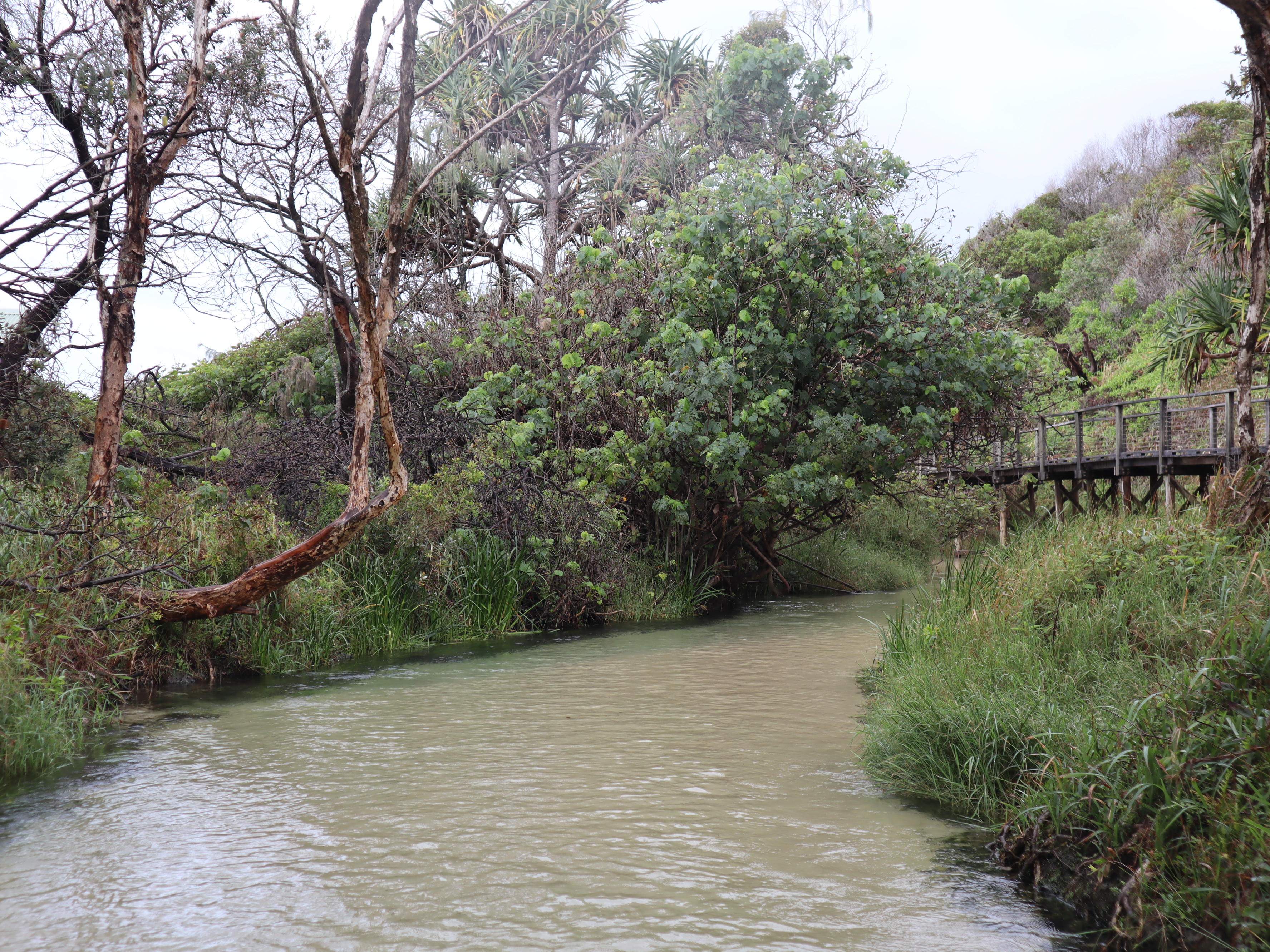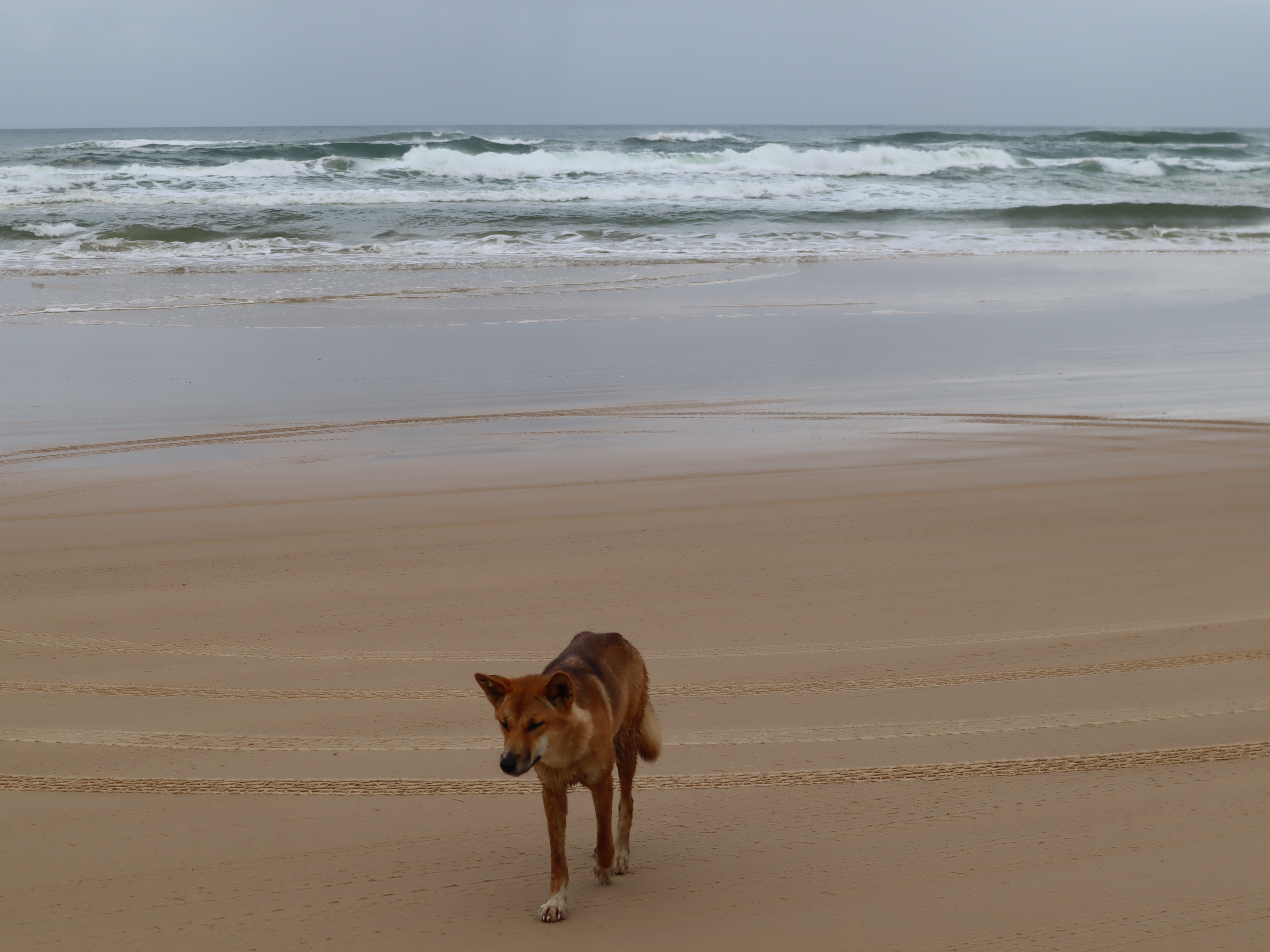 Andamos uns 25 minutos até chegar em Eli Creek e foi lá também nosso primeiro encontro com um dingo. Descemos do carro e ele veio andando tranquilamente na nossa direção – ele não tem cara de bravo, pelo contrário, parece que tá pedindo carinho mas não se deixe enganar. Vini achou um pedaço de madeira e eu peguei o Thomas no colo já que ele ama animais e achou que poderia abraçar esse também rs. Nisso chegou um carro dos Rangers da ilha meio que tocando o dingo e ele saiu de boa (escrevendo isso parece que foram os Power Rangers que salvaram o dia hahaha). Ele nos explicou que não devemos nunca correr dele ou virar as costas e sim se juntar e ficar olhando pra ele sempre com um pedaço de madeira/cano na mão por via das dúvidas. Eles costumam atacar pessoas sozinhas em trilhas principalmente e crianças pequenas que estejam longe dos cuidadores por isso era sempre bom ficar alerta.