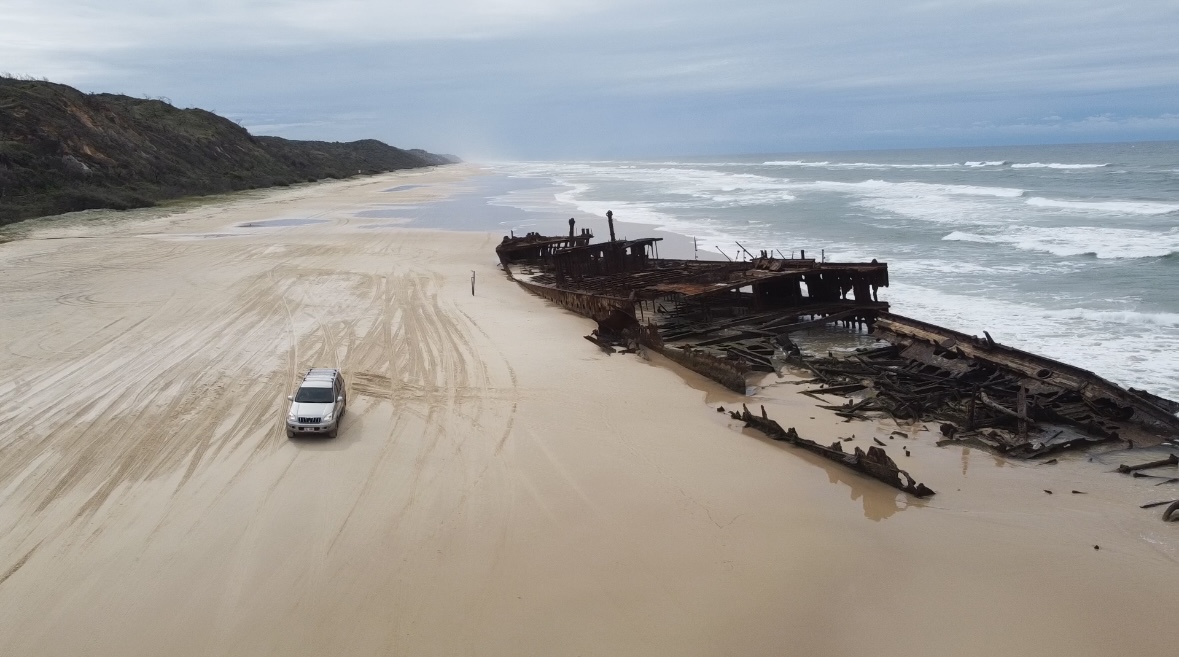 Cinco minutinhos dali tem um navio que naufragou em 1935 – o S. S. Maheno. Uma parte dele está dentro da areia e permanecem os destroços a vista que dependendo da maré dá para ver mais ou menos. Importante: não pode entrar no navio pois não tem garantia nenhuma que partes dele não vão se soltar/cair/desmontar, então não arrisque. Fora que o mar é bem bravo e inclusive não se pode nadar nas praias da ilha por isso e também pela quantidade de tubarões que ali habitam – nós vimos 3 baleias bem próximas a areia então imagino que também seja bem fundo.