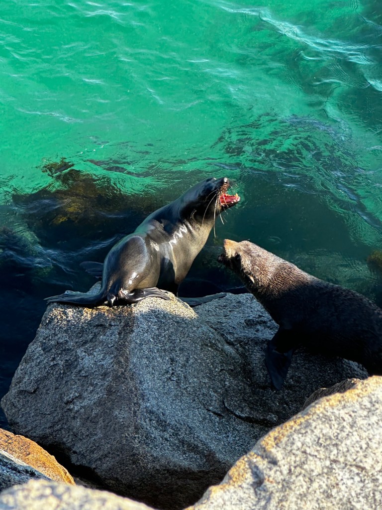 Acordamos cedo e fomos até a Australia Rock – uma formação rochosa com um furo no meio que se assemelha ao mapa da Austrália, incrível! E do lado dela tem uma parte cheiaaaaa de focas – Seal Rocks, devia ter umas 50 dessa vez – algumas na água, outras na pedra tomando um sol. E ah, assim que chegamos, as baleias estavam dando um show a parte também – lindo de ver! Nessa época do ano é comum vê-las por aqui. Uma dica para subir na Australia Rock, é ir de tênis porque as pedras machucam bastante o pé – e o restante do corpo na hora de subir e descer – e o chinelo não te dá estabilidade suficiente.