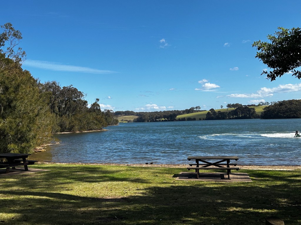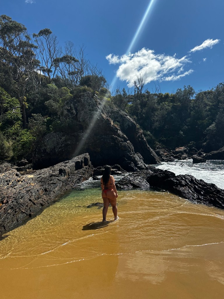 Uma vez em Narooma, aproveitamos para pegar uma praia em Mystery Bay que é uma cidadezinha que fica 10 minutos de distância. Fomos na Mystery Bay Reserve e a praia é uma delícia! No canto esquerdo, estava formando uma piscininha natural, perfeito pra crianças. Lá também tivemos a chance de ver baleias de novo, ainda mais de pertinho dessa vez. Levamos uns snacks, frutas e água para passar o dia e ficamos até 2:30pm.