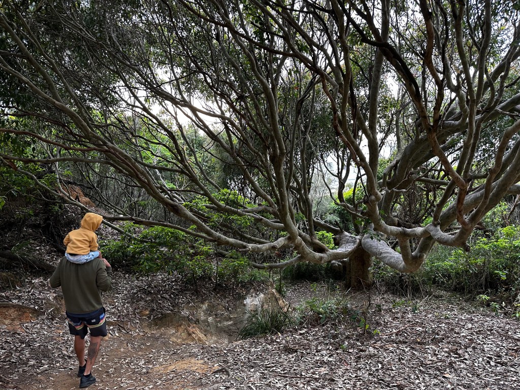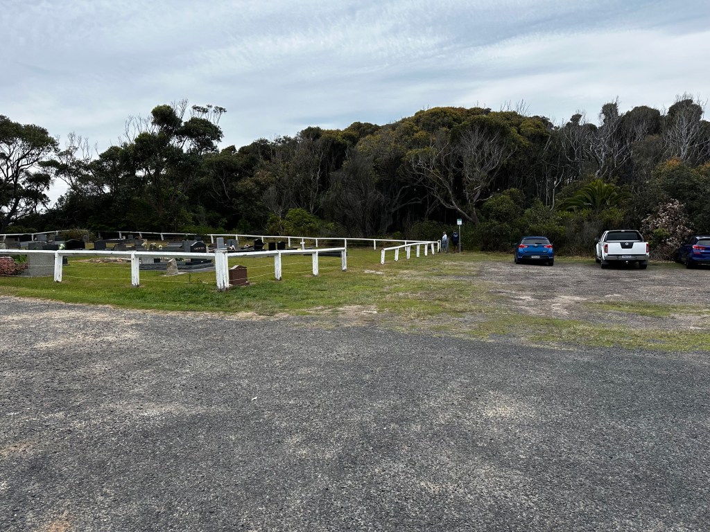 Acordamos, tomamos café da manhã no quarto com as coisas que compramos no supermercado e fomos até a Princess Beach em Narooma mesmo – 5 minutos do motel que estávamos. Para chegar nela, coloca Narooma Cemetery no mapa e anda na direção contrária a Narooma Beach. Você vai passar alguns túmulos cercado por uma cerca branca do seu lado esquerdo (foto abaixo) e vai andando sempre pela esquerda da trilha – vão ter duas bifurcações e ambas você pega a esquerda. Pensa que você tem que pegar caminho para descer sentido a praia e o percurso é bem tranquilo e não leva nem 10 minutos.