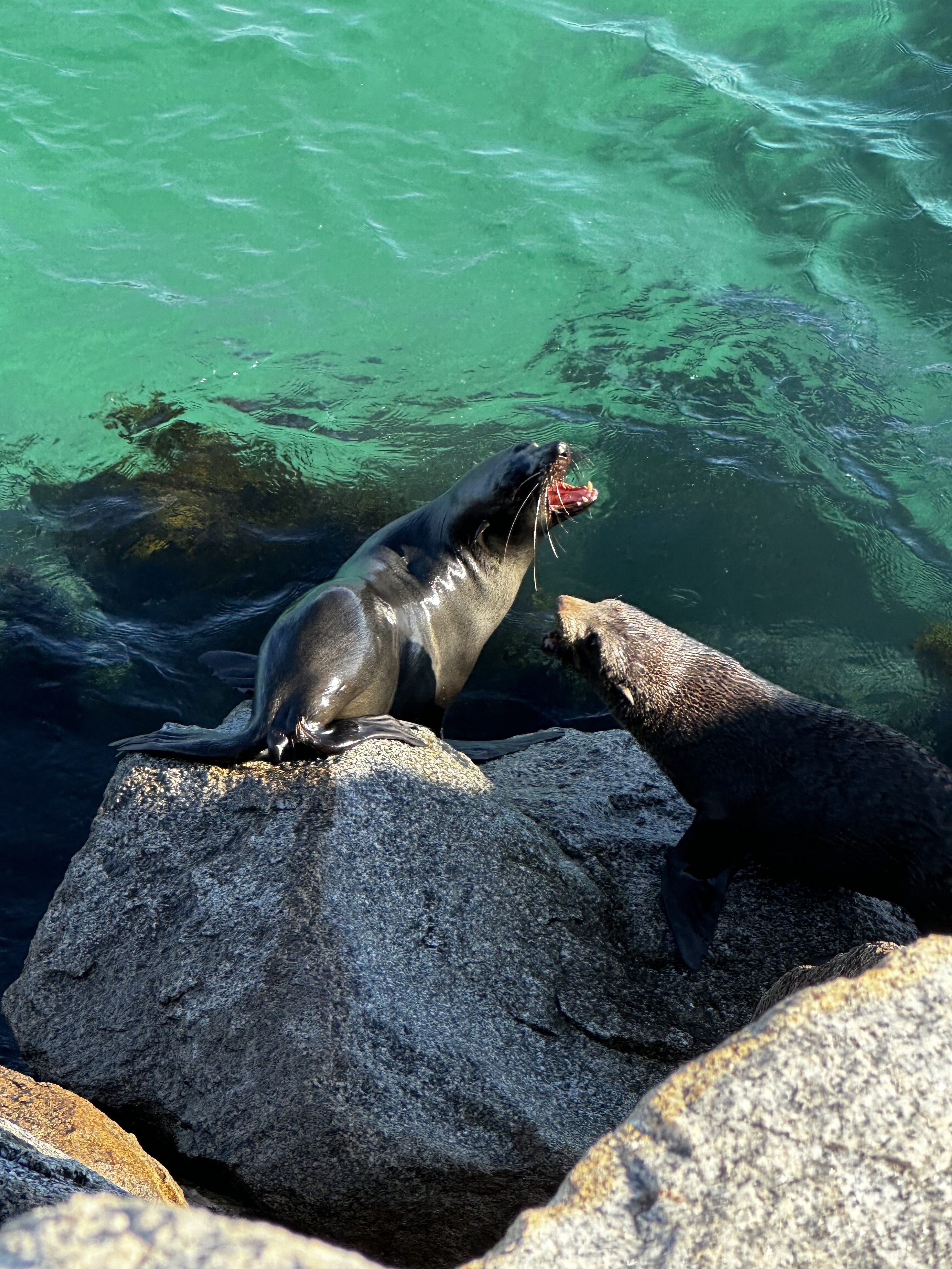 Acordamos cedo e fomos até a Australia Rock – uma formação rochosa com um furo no meio que se assemelha ao mapa da Austrália, incrível! E do lado dela tem uma parte cheiaaaaa de focas – Seal Rocks, devia ter umas 50 dessa vez – algumas na água, outras na pedra tomando um sol. E ah, assim que chegamos, as baleias estavam dando um show a parte também – lindo de ver! Nessa época do ano é comum vê-las por aqui. Uma dica para subir na Australia Rock, é ir de tênis porque as pedras machucam bastante o pé – e o restante do corpo na hora de subir e descer – e o chinelo não te dá estabilidade suficiente.
