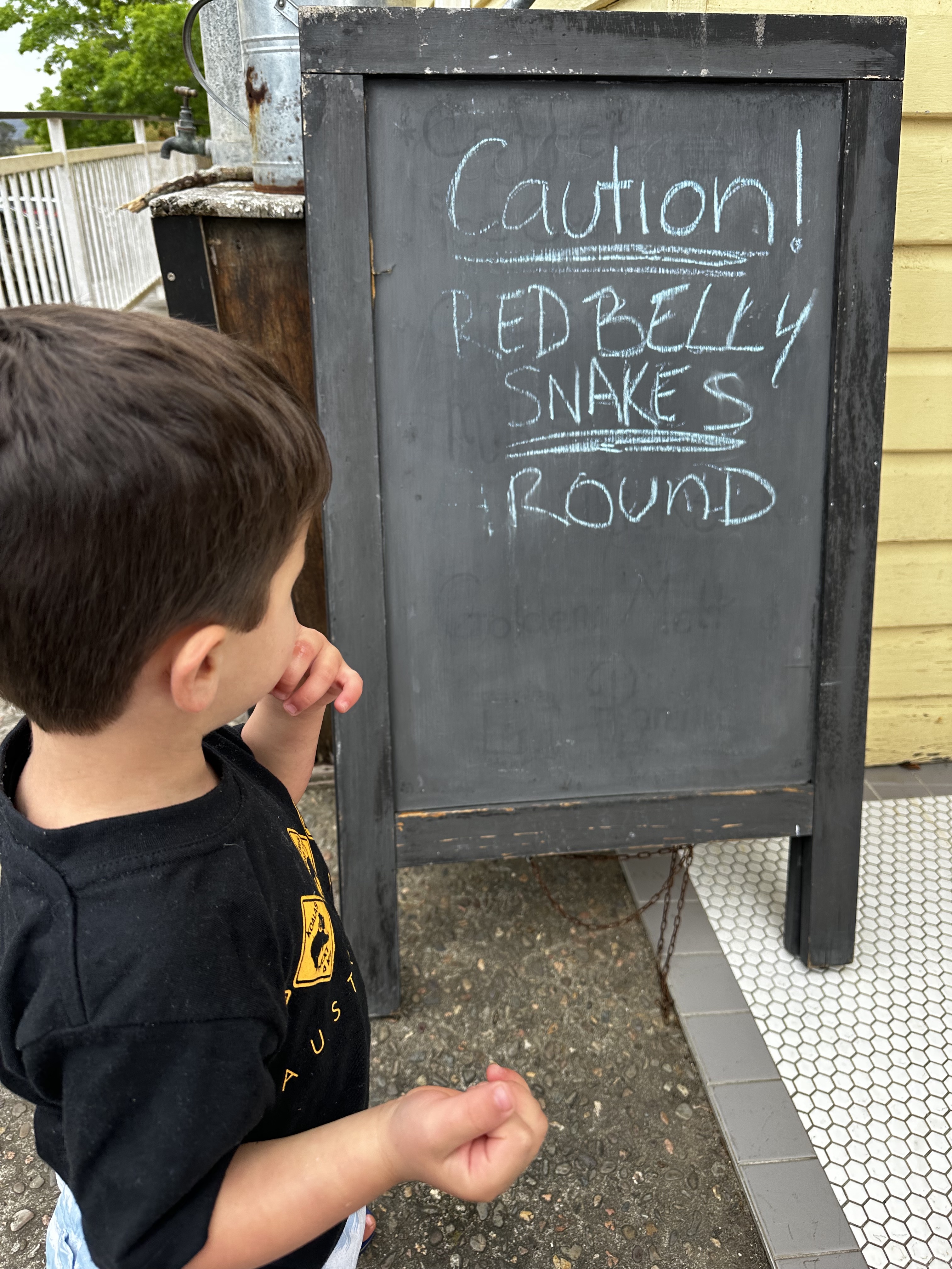 Já que não ia dar praia, decidimos ir voltando para Sydney e fizemos uma pausa em Bodalla, mais especificamente na Bodalla Dairy Shed. Chegamos bem na hora que iam alimentar os bichinhos – e na volta reparamos nessa placa “fofa” – medo!!!! Como comentei, a região é famosa pelos produtos lácteos e fizemos uma degustação de queijos (gratuita) – todos eram maravilhosos e compramos alguns para comer em casa depois.