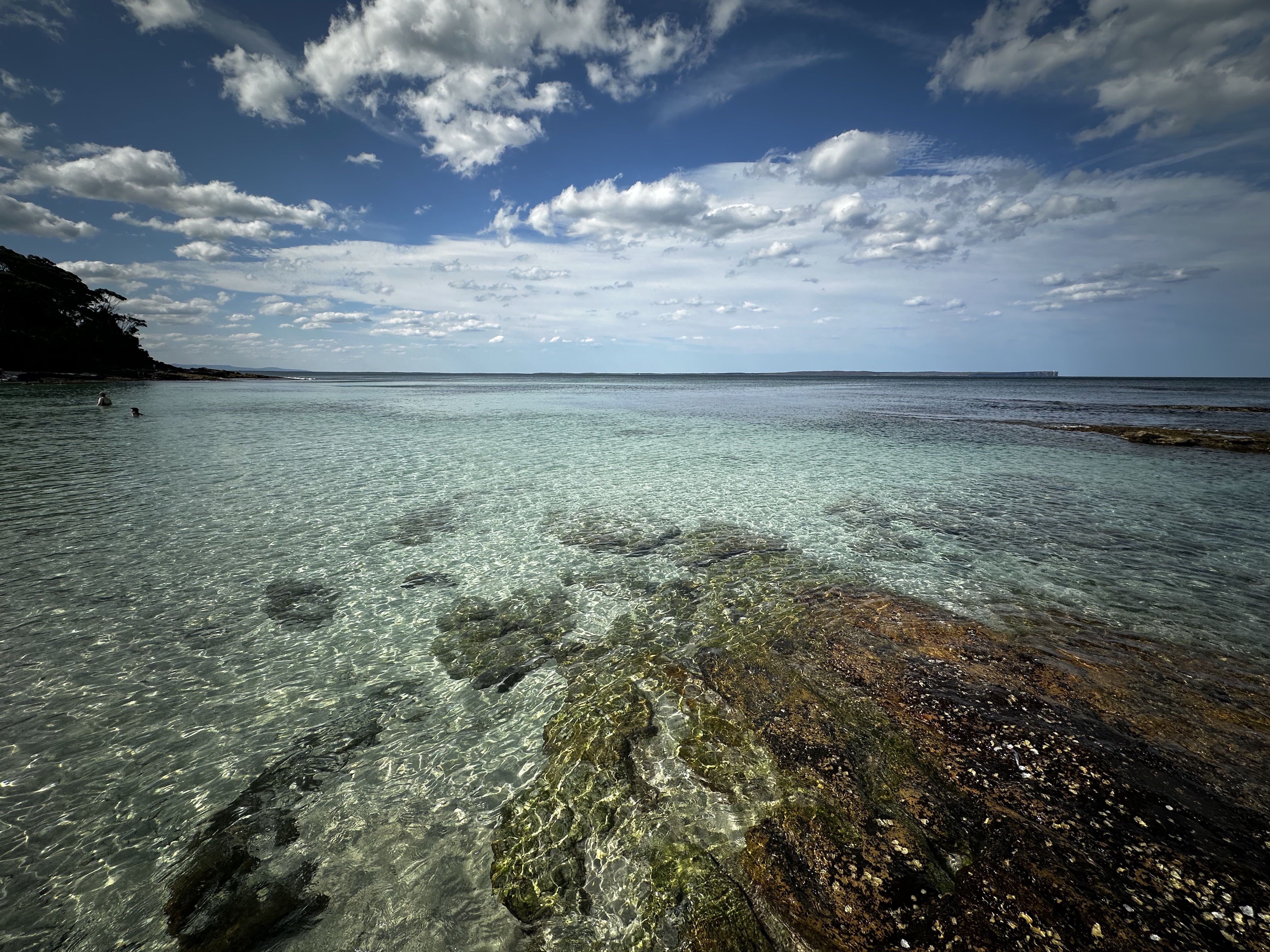 Uma vez em Narooma, aproveitamos para pegar uma praia em Mystery Bay que é uma cidadezinha que fica 10 minutos de distância. Fomos na Mystery Bay Reserve e a praia é uma delícia! No canto esquerdo, estava formando uma piscininha natural, perfeito pra crianças. Lá também tivemos a chance de ver baleias de novo, ainda mais de pertinho dessa vez. Levamos uns snacks, frutas e água para passar o dia e ficamos até 2:30pm.