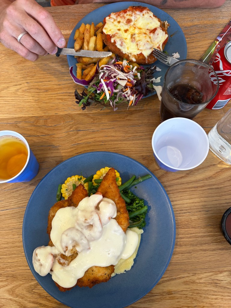 Fomos embora na hora do almoço e comemos no Settlers Inn Hotel, achei legal porque tem parquinho para as crianças na área de trás, porém a comida não estava boa não – mesmo tendo o título de melhor schnitzel de NSW. Gastamos $83.70 em três pratos e bebidas.