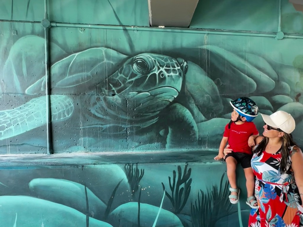 De lá, fomos para o camping e passamos a tarde na piscina, super gostoso. Fim do dia fomos dar uma volta no centrinho para o nosso filho aproveitar e dar uma volta de bike também. Estacionamos do lado do William Street Bridge Mural (achei lindo) e fomos caminhar com direito a uma pausa para tomar sorvete no Blue Cow Gelato ($20 três sorvetes) – super recomendo, bom demais (e olha que eu nem sou muito de sorvete).